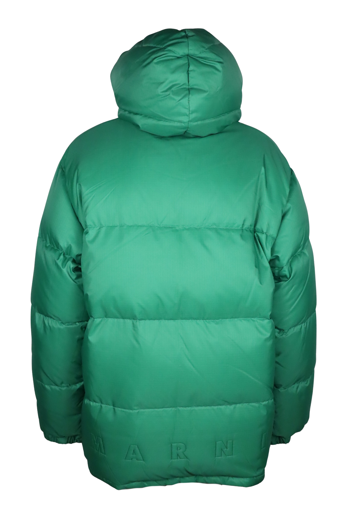 Diese wattierte Daunenjacke von Marni überzeugt durch ihre schlichte Eleganz und satte Farbgebung in kräftigem Smaragdgrün. Das minimalistische Design wird durch eine klare Linienführung, den mittigen Reißverschluss und eine großzügige Kapuze unterstrichen. Der lässige Schnitt mit Tunnelzug am Saum sorgt für optimalen Sitz und individuellen Tragekomfort – ideal für urbane Looks mit modischer Raffinesse.