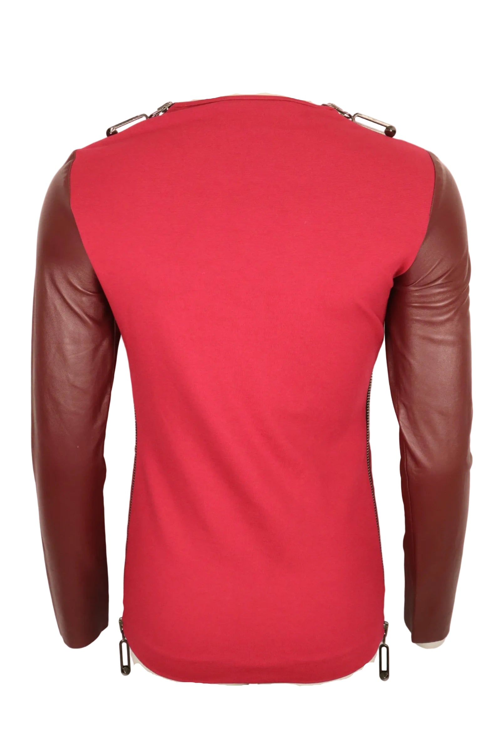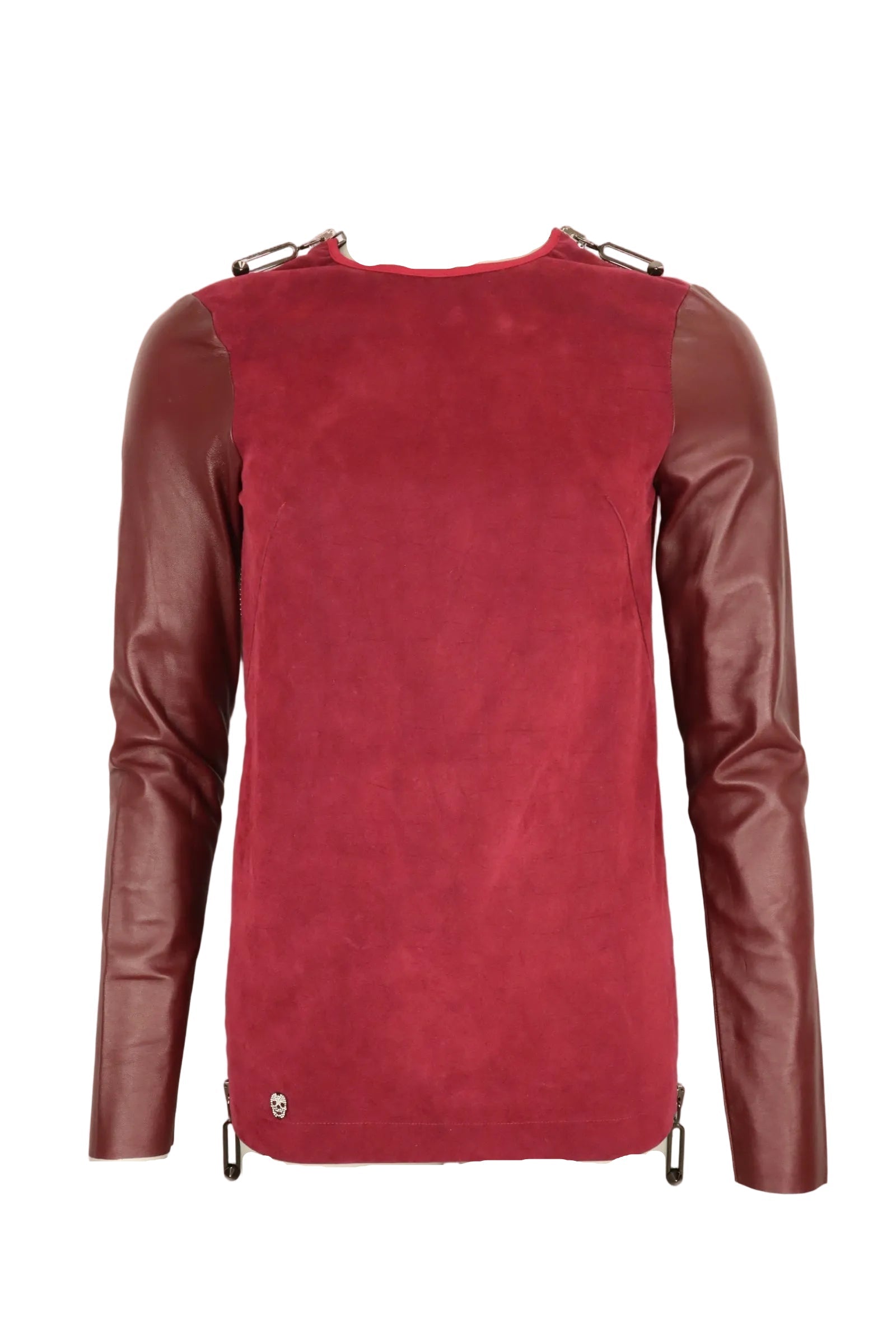 Dieser extravagante Pullover von Philipp Plein setzt ein klares Fashion-Statement. Die Kombination aus bordeauxrotem Wildleder vorne und glatten Lederärmeln verleiht dem Oberteil eine luxuriöse, rockige Ausstrahlung. Rückseitig ist der Pullover aus stretchigem Baumwollstoff gearbeitet – für optimalen Tragekomfort. Auffällige Metallkarabiner an den Schultern sowie Reißverschlüsse an den Seiten unterstreichen den typischen Plein-Look: edgy, selbstbewusst und exklusiv. Ein absolutes Highlight für modeaffine Frauen, die das Außergewöhnliche lieben.
