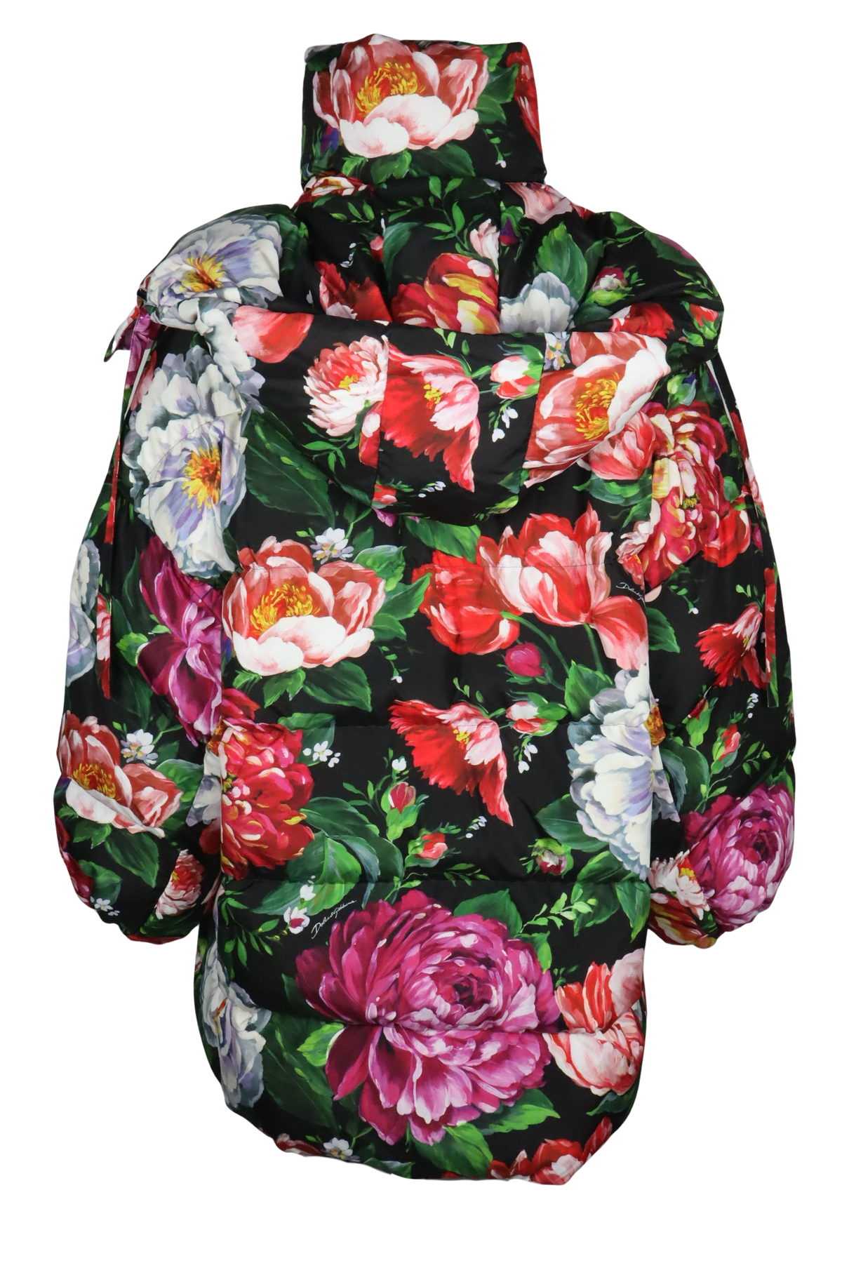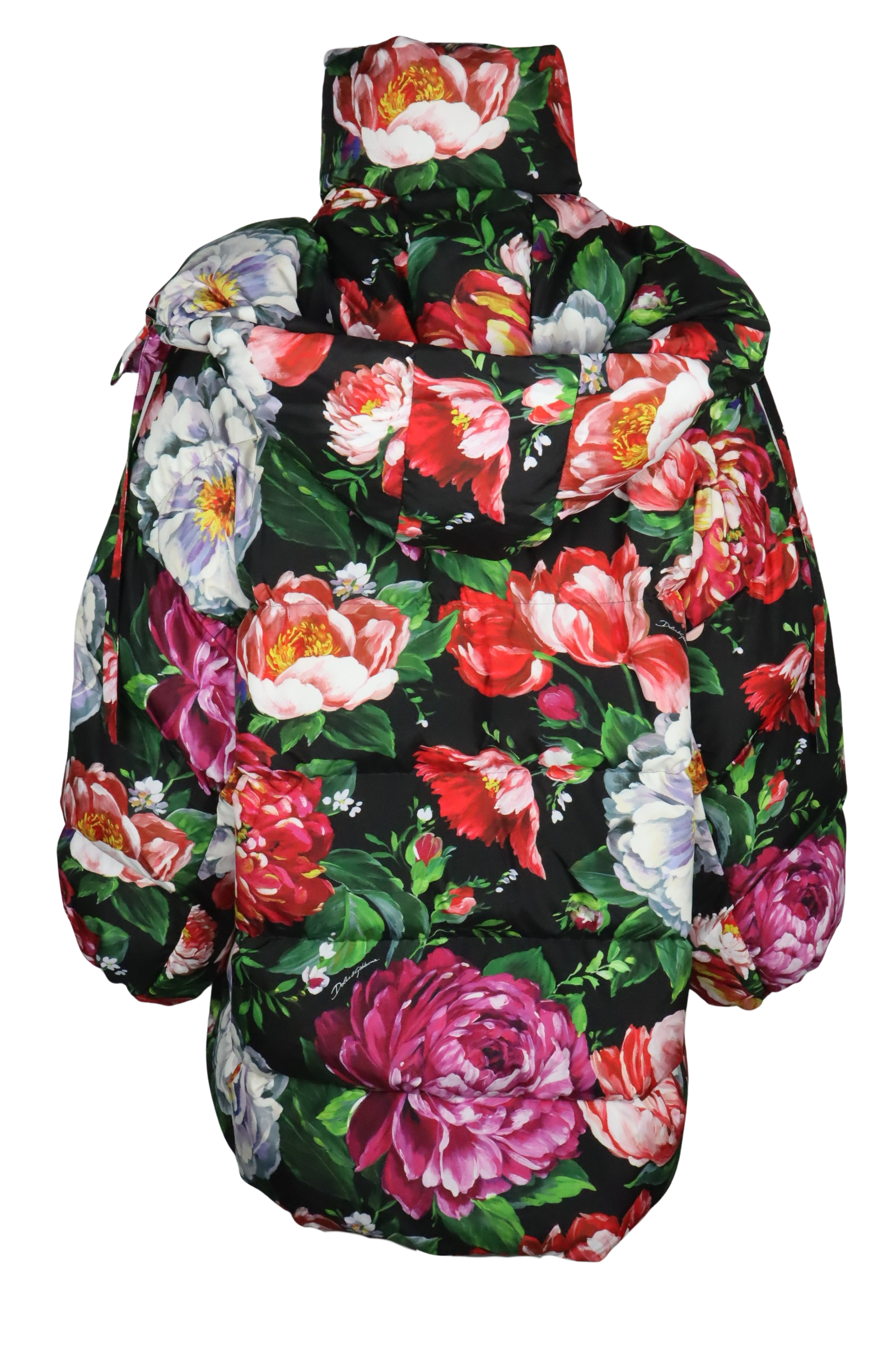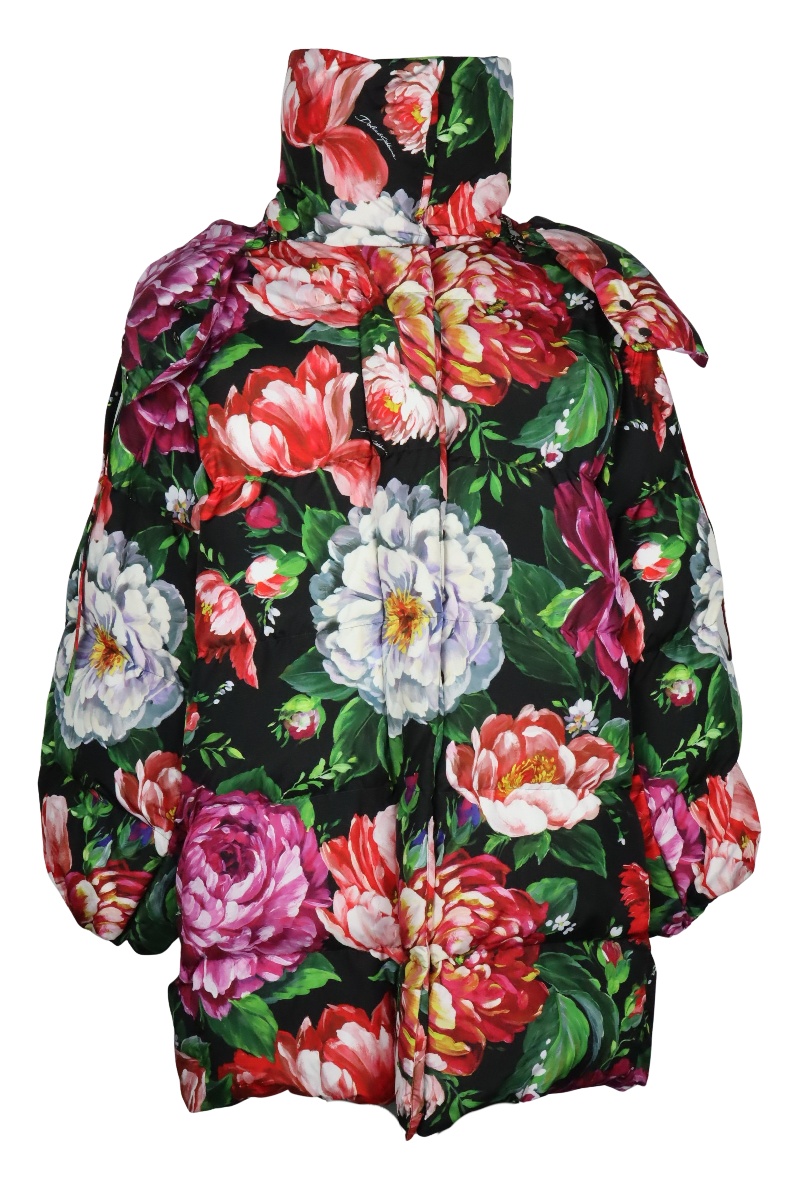Diese florale Daunenjacke von Dolce & Gabbana ist ein wahrer Blickfang für stilbewusste Frauen, die das Außergewöhnliche lieben. Der prachtvolle Blumenprint auf tiefschwarzem Grund kombiniert opulente Farben wie Rot, Weiß, Violett und Grün zu einem harmonischen Kunstwerk. Die voluminöse Silhouette, der hohe Kragen und die weiche Steppung sorgen für luxuriösen Komfort und eine starke modische Präsenz.