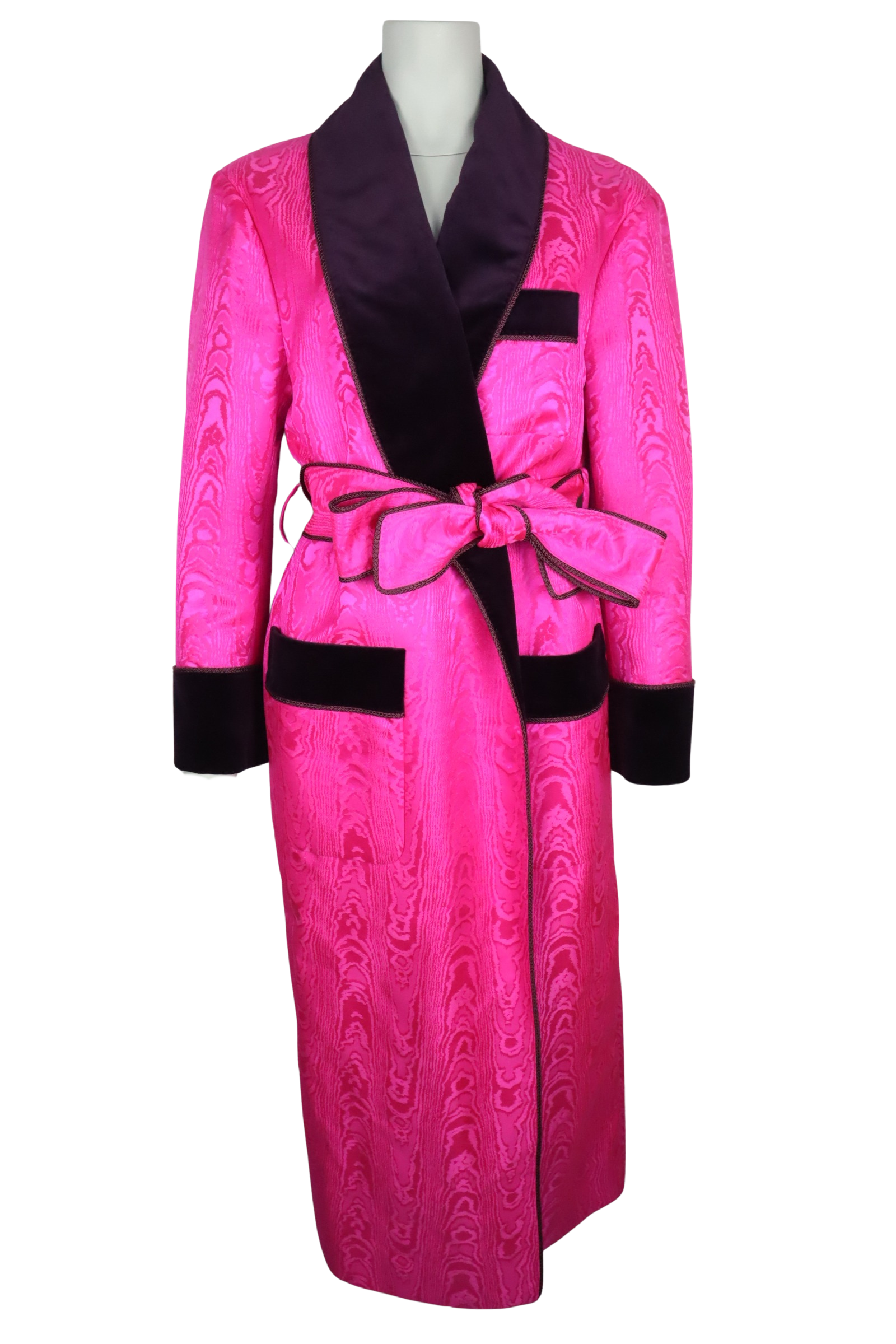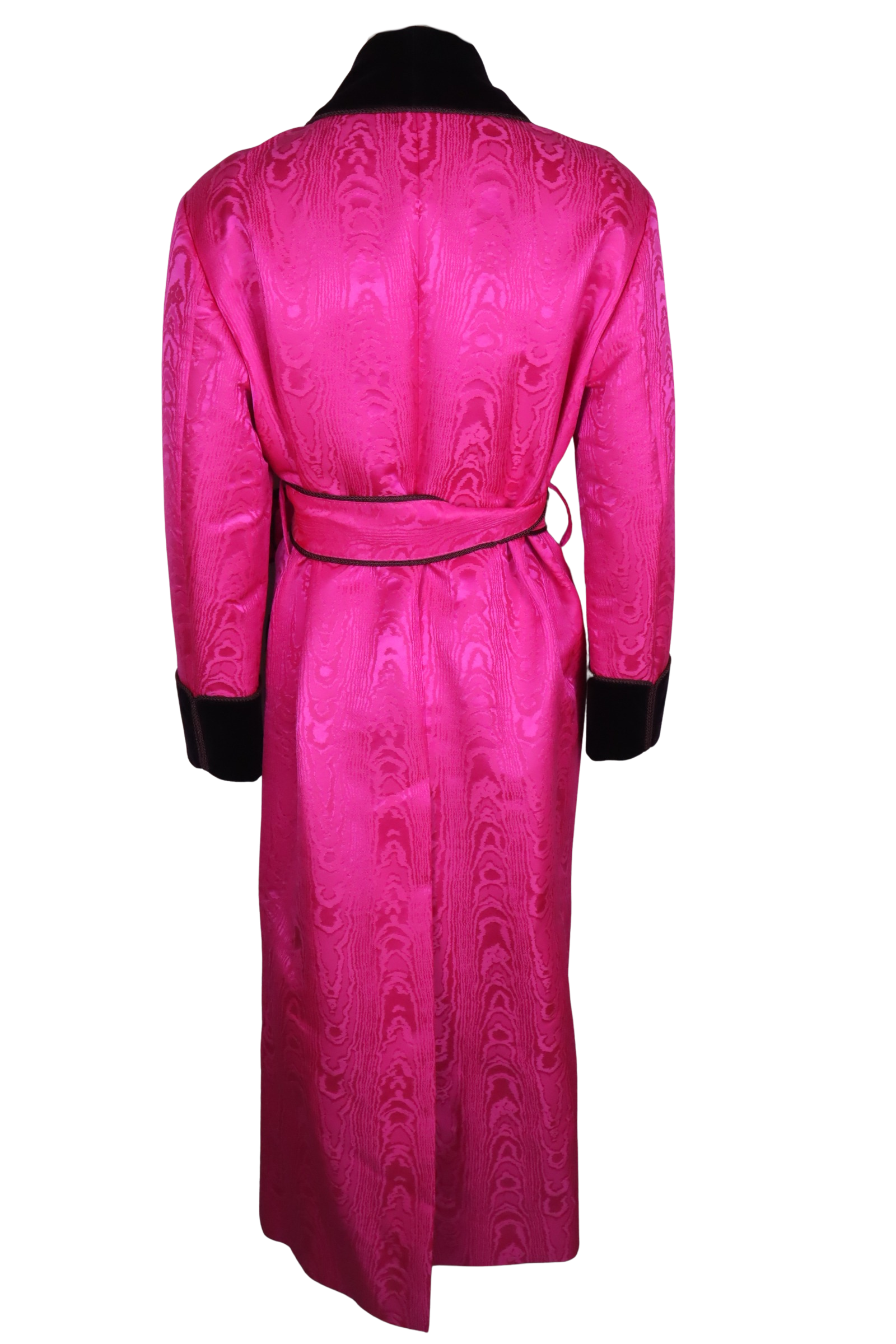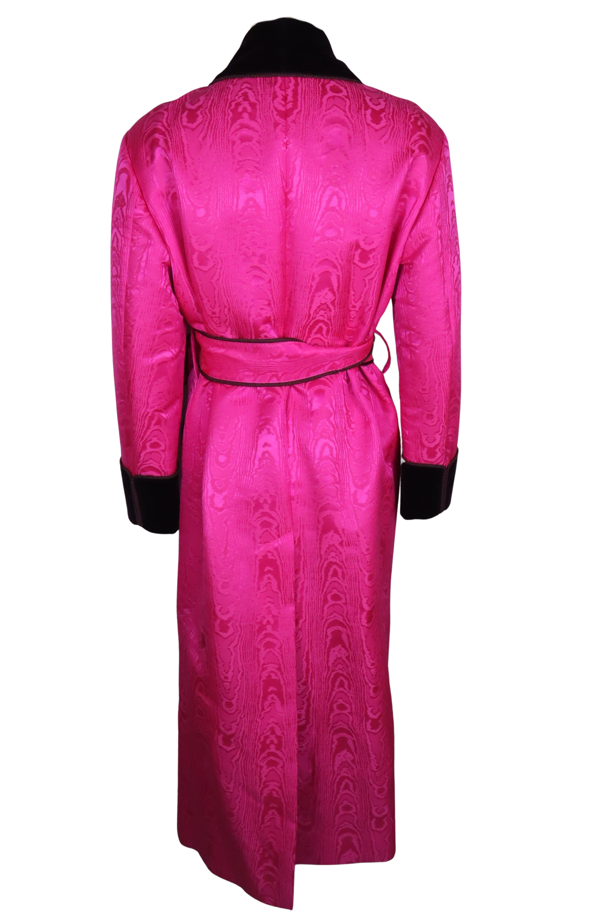 Dieser exklusive Mantel von Dolce & Gabbana ist ein echtes Couture-Statement – extravagant, mutig und glamourös. In leuchtendem Fuchsia mit changierendem Glanz und elegantem Schimmer zieht dieses Modell garantiert alle Blicke auf sich. Der luxuriöse Stoff erinnert durch seine Maserung an edles Moiré, während die tiefschwarzen Samtdetails an Kragen, Taschen und Manschetten einen aufregenden Kontrast setzen.