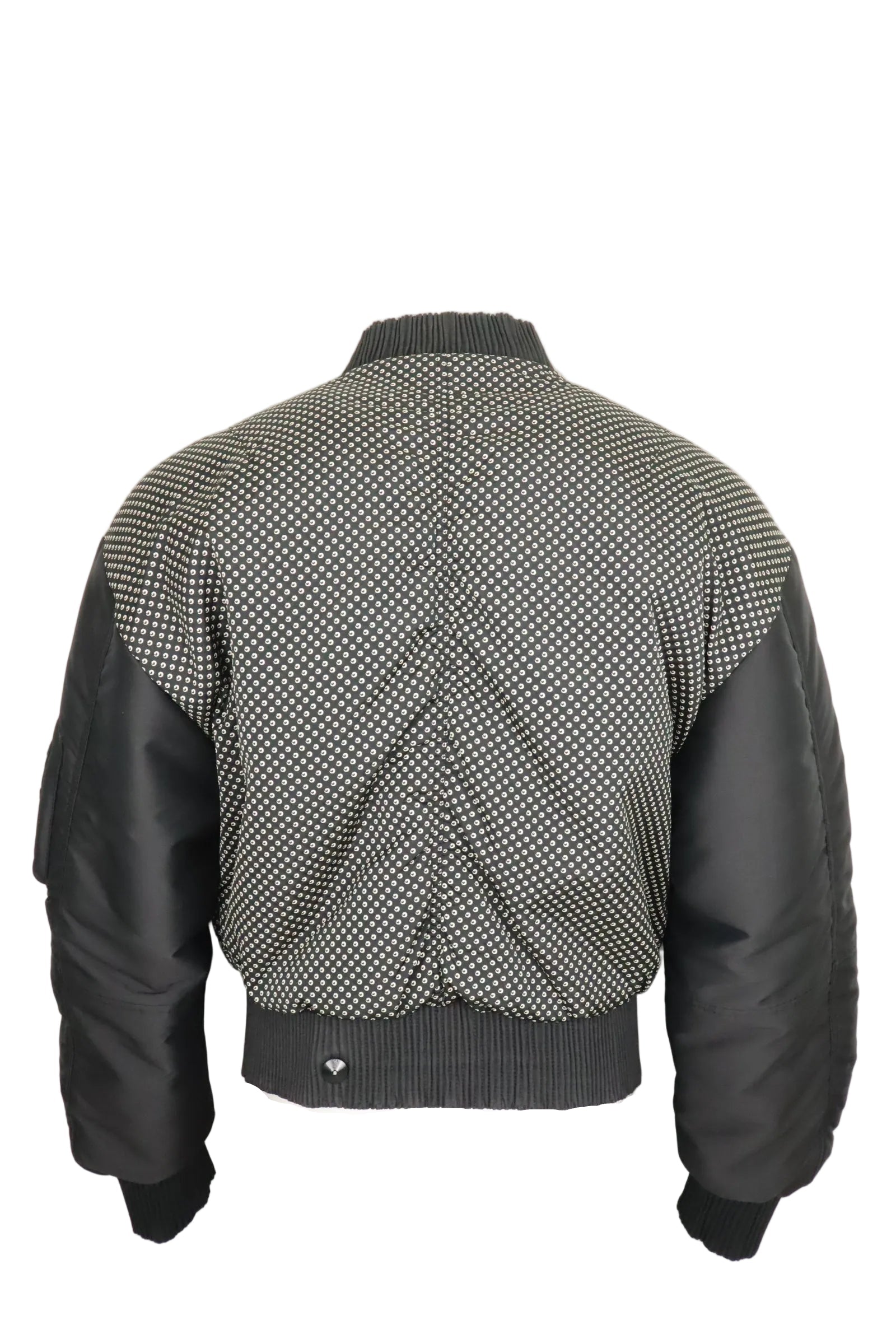 Diese luxuriöse Bomberjacke von Dolce & Gabbana ist ein echtes Statement-Piece für Fashion-Liebhaberinnen mit Sinn für extravagantes Design. Die Vorderseite ist vollständig mit silberfarbenen Nieten besetzt und erzeugt einen glanzvollen, strukturierten Look. Schwarze, matt glänzende Ärmel und Taschenklappen aus technischem Gewebe sorgen für einen spannenden Materialkontrast. Praktische Reißverschlusstaschen, das eingeprägte DG-Logo auf der Brust sowie breite Rippbündchen an Saum und Ärmeln runden das Design perfekt ab. Diese Jacke vereint Luxus mit urbaner Coolness auf höchstem Niveau.