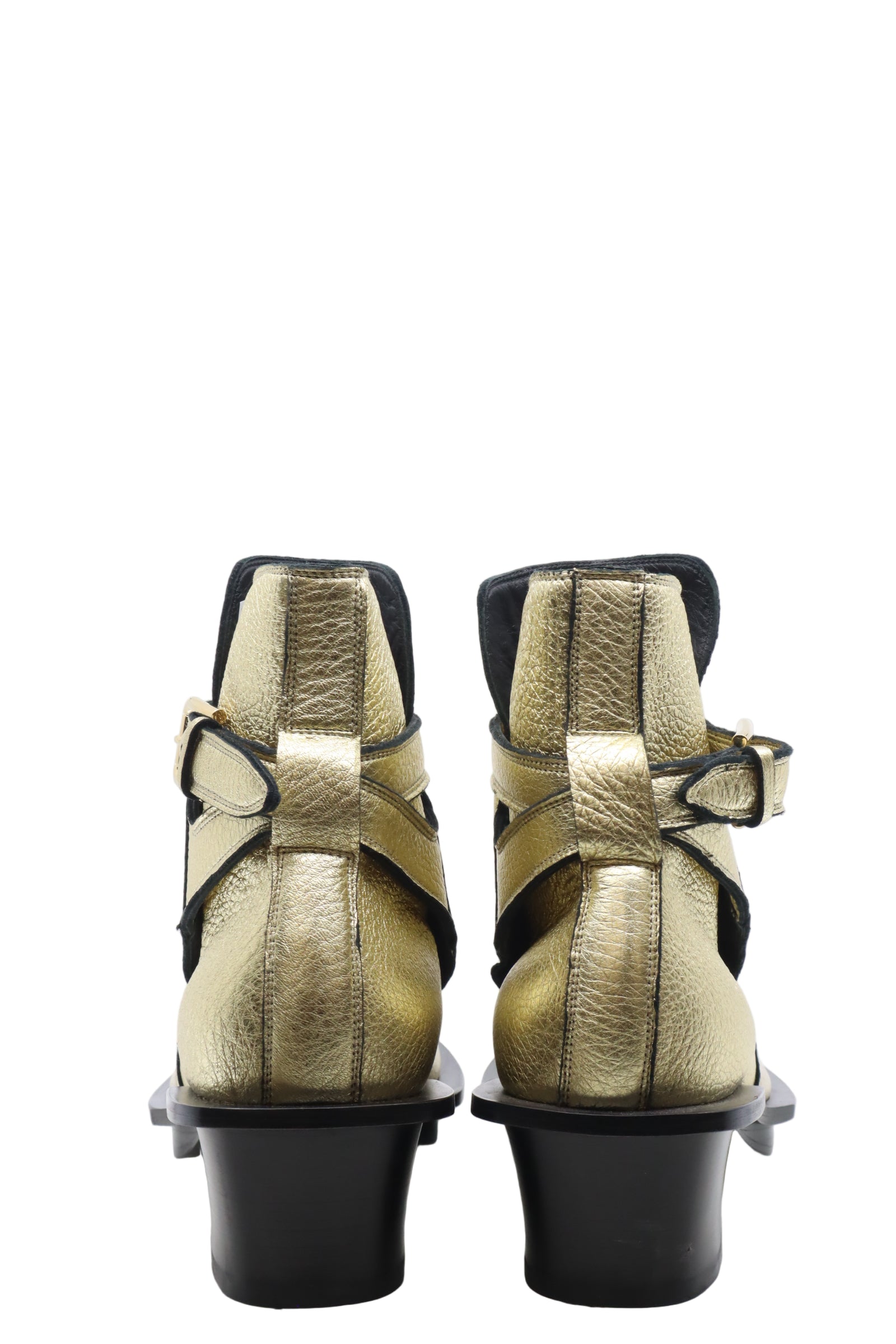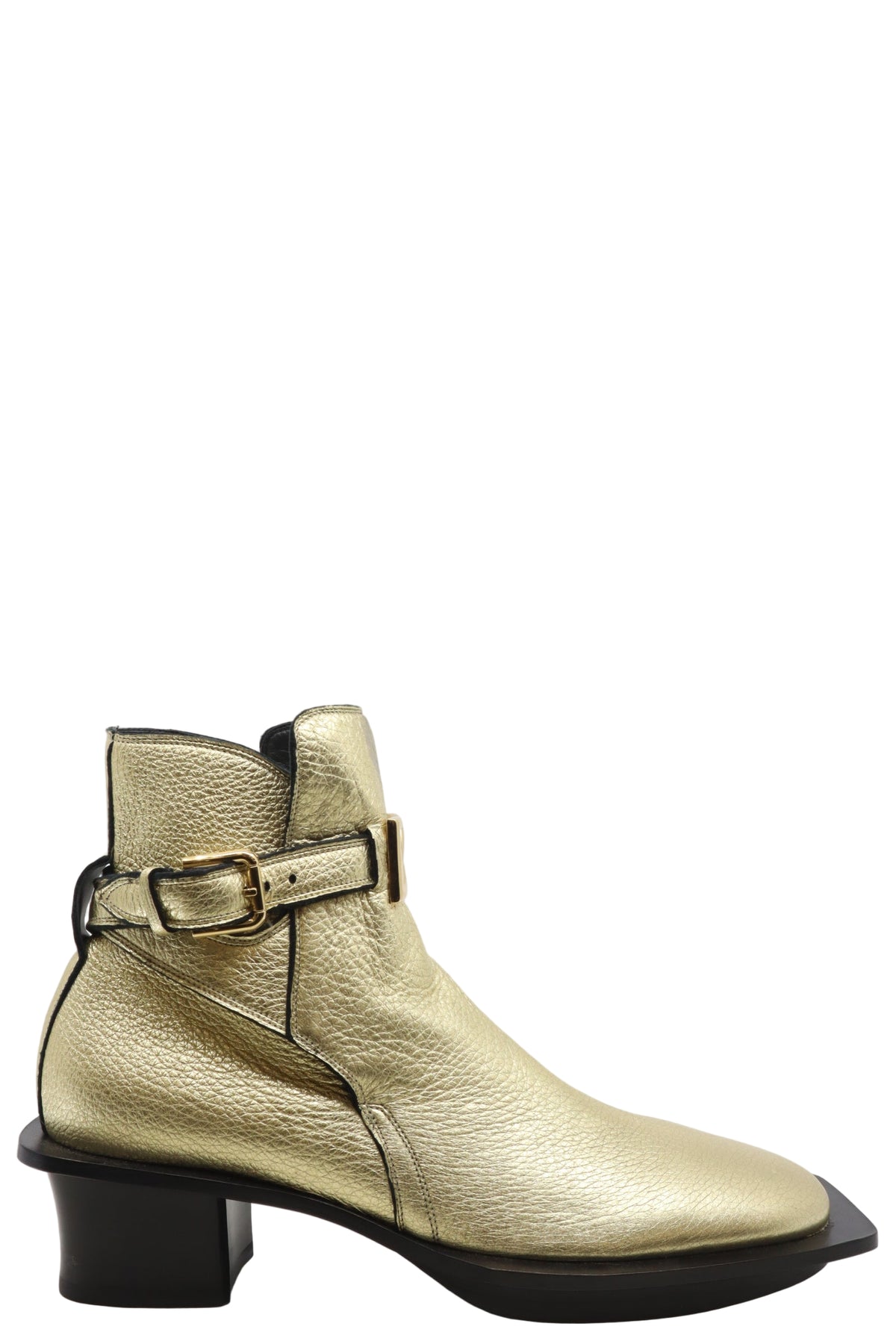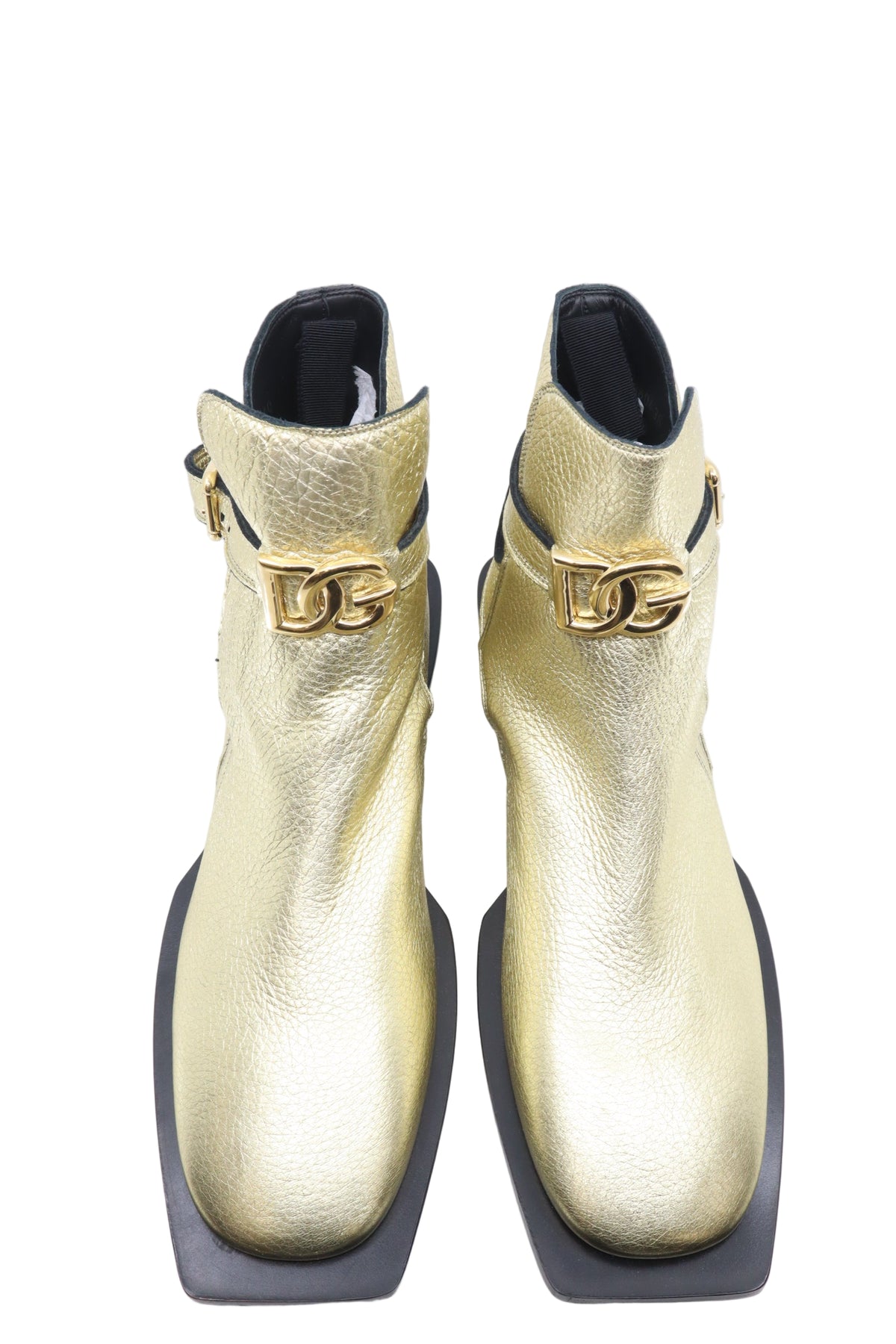 Ein echtes Luxus-Statement: Diese goldfarbenen Ankle Boots von Dolce & Gabbana verbinden italienische Eleganz mit auffälligem Design. Das strukturierte Echtleder mit edlem Metallic-Finish sorgt für einen glänzenden Auftritt, während die goldene Schnalle am Knöchel dem Schuh eine rockige, modische Note verleiht.