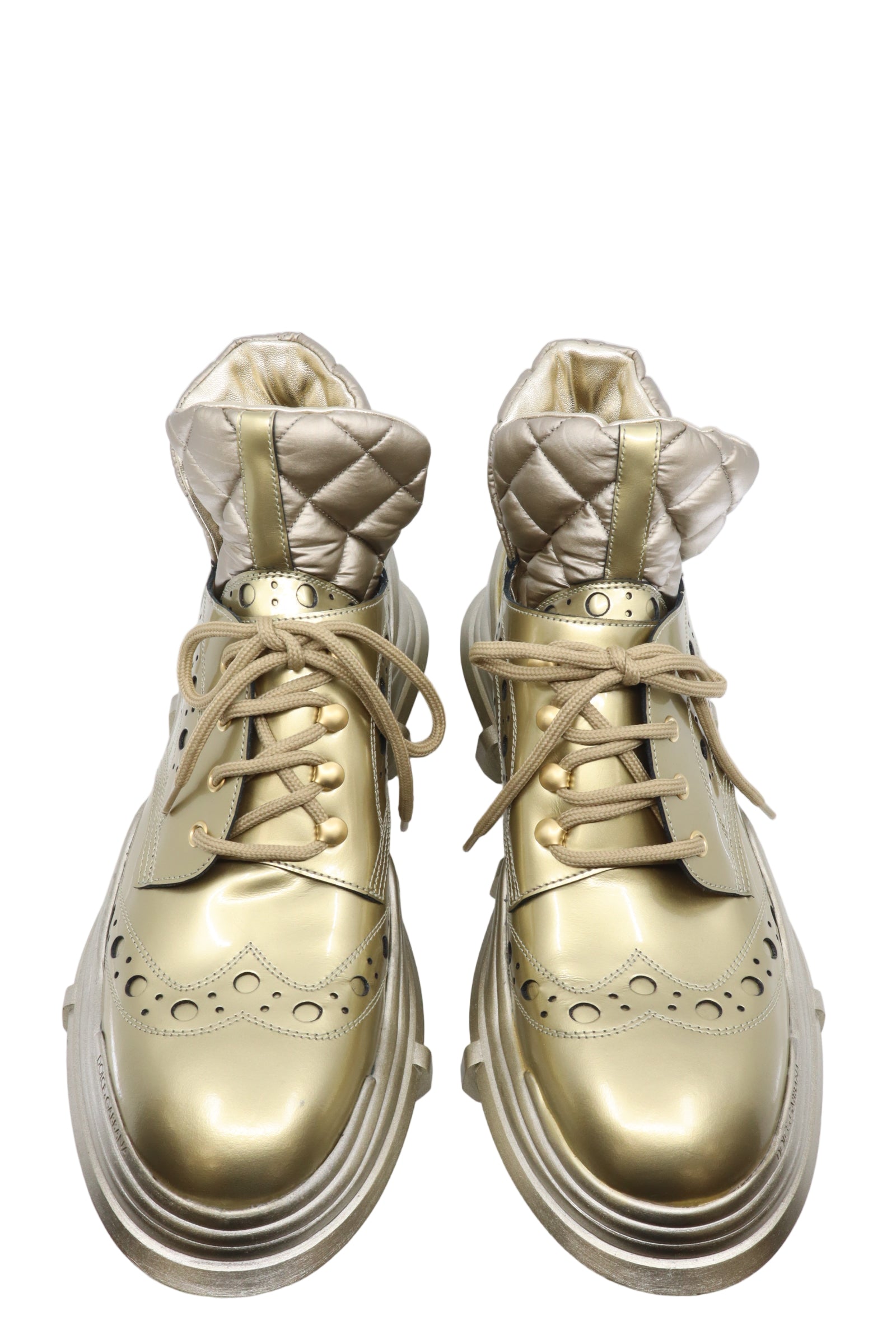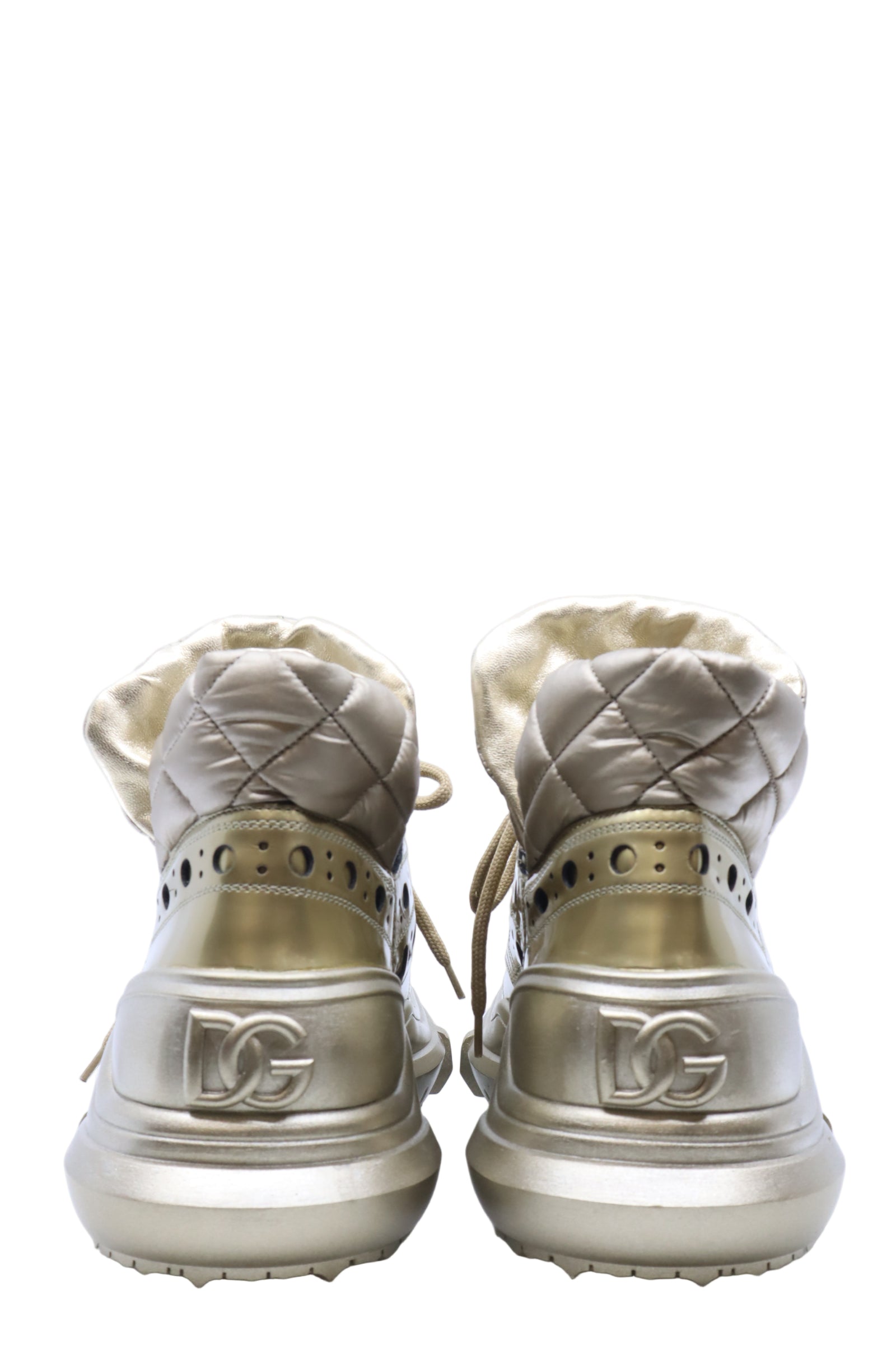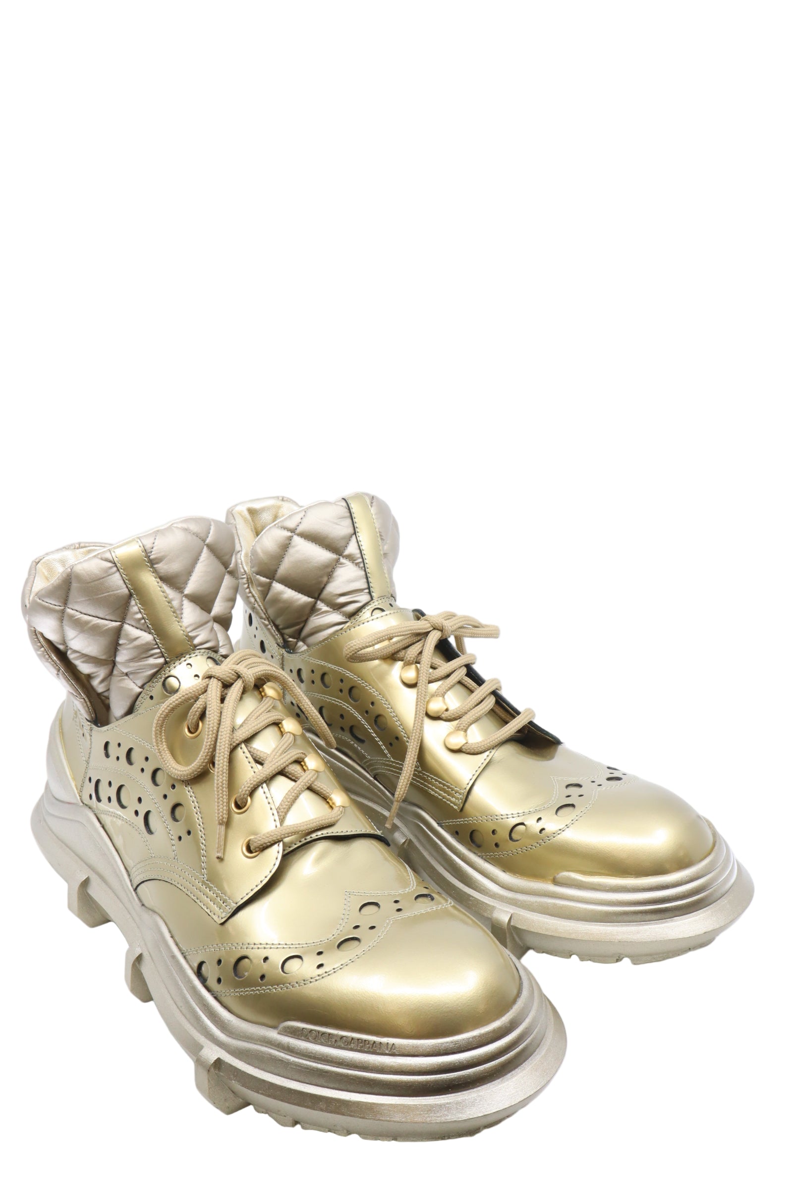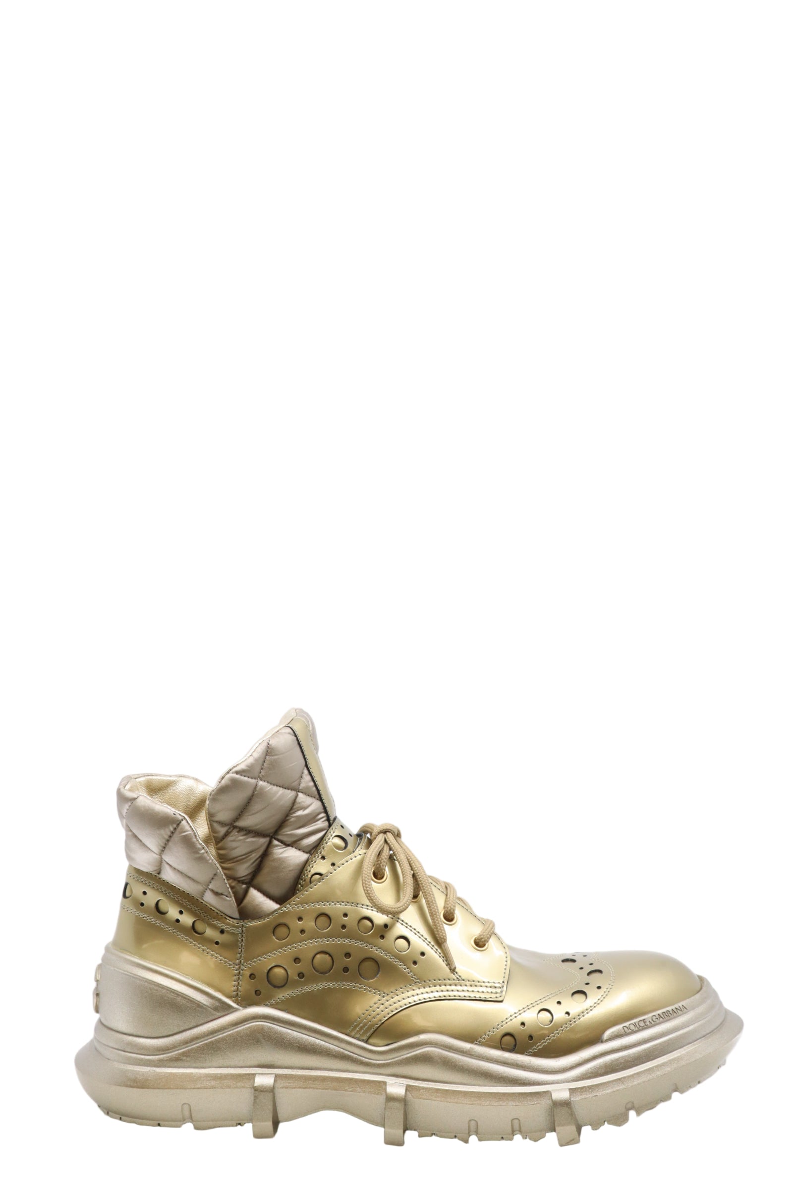 Dieser goldfarbene High-Top Sneaker von Dolce & Gabbana ist ein echtes Statement-Piece. Das extravagante Design kombiniert glänzendes Metallic-Obermaterial mit einer auffällig gesteppten Zunge und markanten Lochmustern im Brogue-Stil. Die voluminöse, profilierte Sohle rundet den Look mit urbanem Charakter ab.