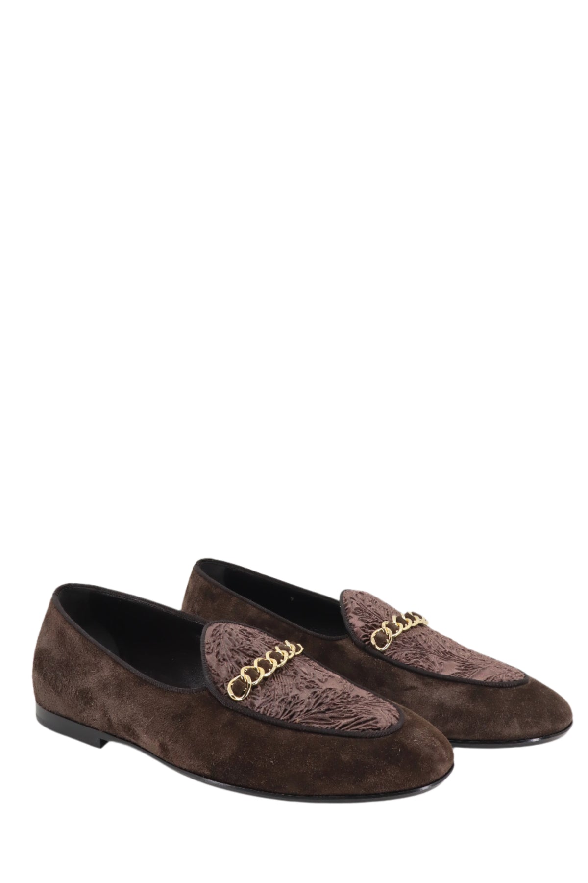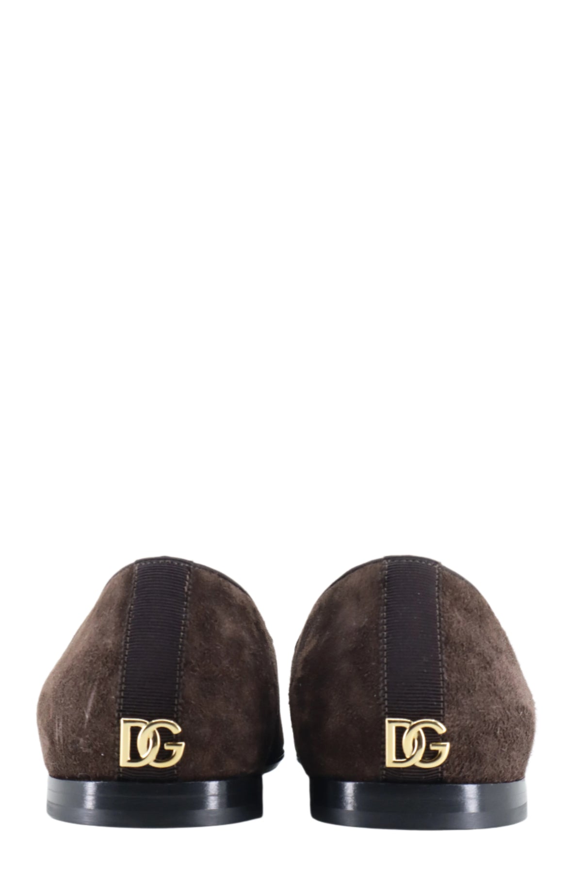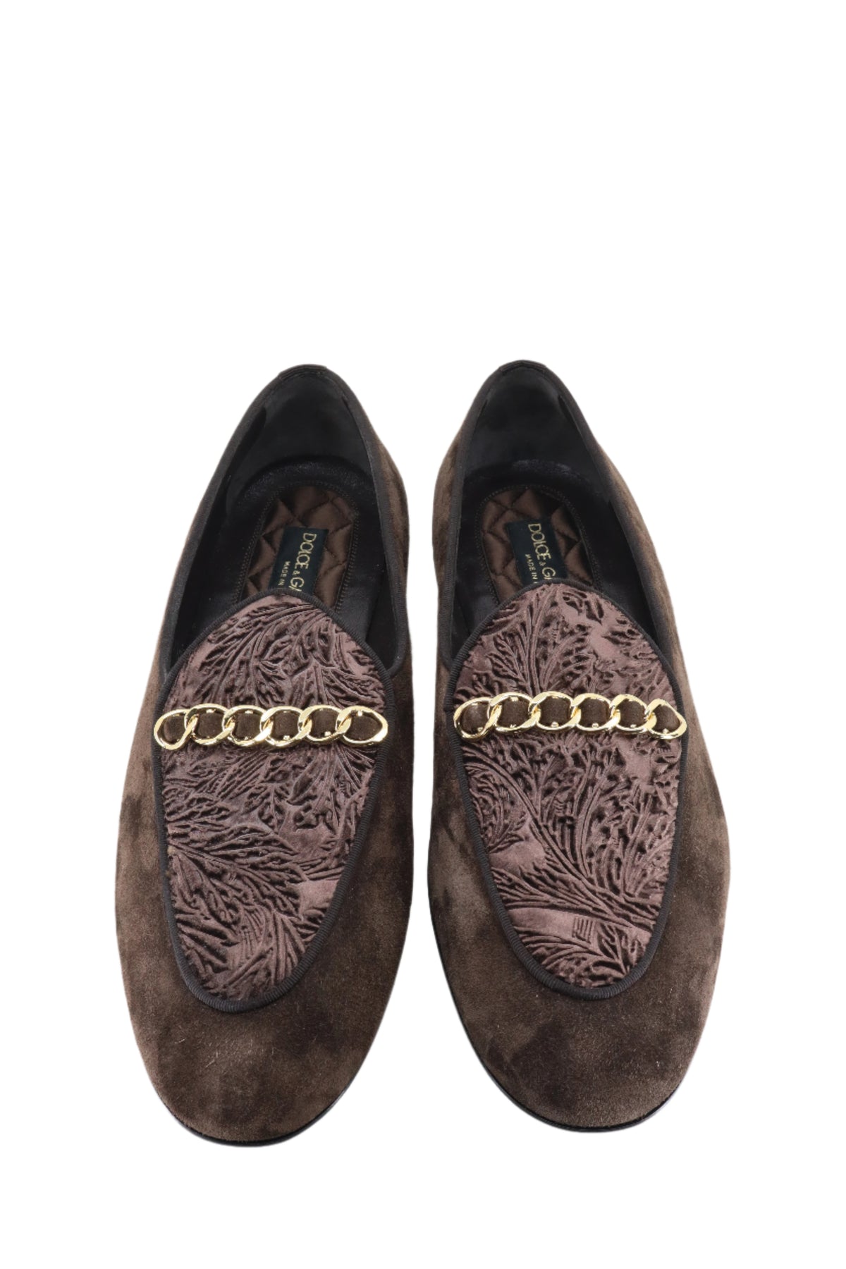 Diese edlen Slipper von Dolce & Gabbana verkörpern stilvolle Zurückhaltung mit einem Hauch Raffinesse. Gefertigt aus weichem, dunkelbraunem Veloursleder und verziert mit einem kunstvoll geprägten Ledereinsatz auf dem Spann samt goldfarbener DG-Spange, bieten sie eine luxuriöse Optik und angenehmen Tragekomfort. Ob zu eleganten Anzügen oder für festliche Anlässe – diese Schuhe ergänzen Ihr Outfit mit dezenter Eleganz und italienischem Feingefühl.