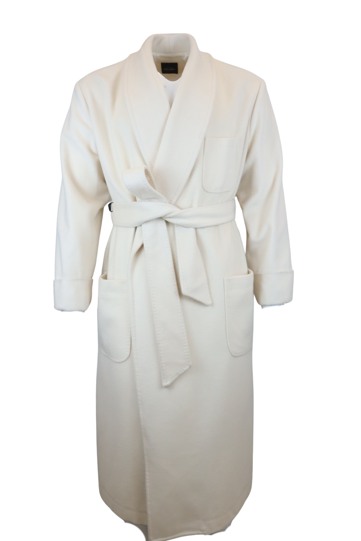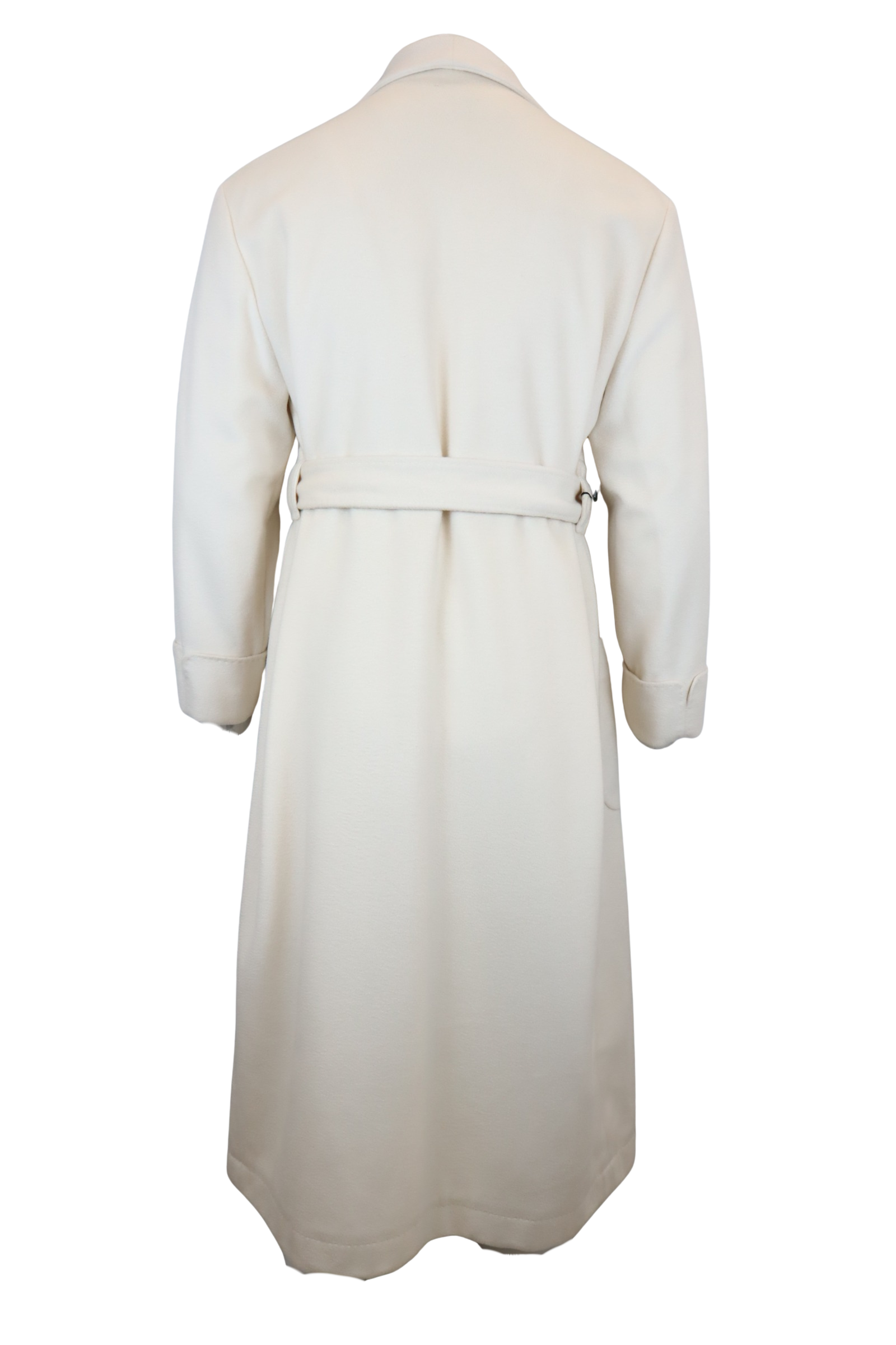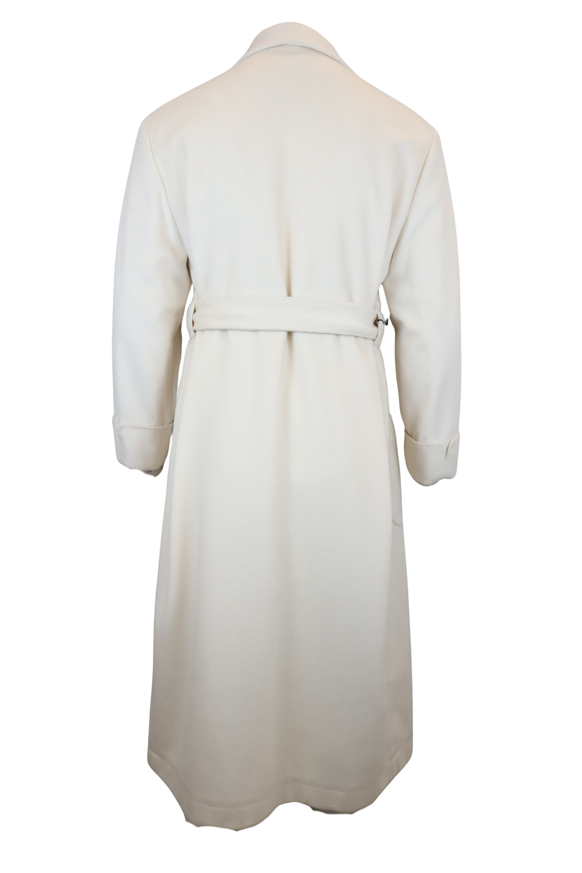 Eleganz in ihrer reinsten Form – dieser cremefarbene Mantel von Dolce & Gabbana besticht durch zeitlose Schlichtheit und luxuriöse Verarbeitung. Der fließende Schnitt mit Schalkragen, breitem Taillengürtel und aufgesetzten Taschen erinnert an einen edlen Kimono-Stil und verleiht dem Look eine exklusive Lässigkeit. Die hochwertige Wollmischung sorgt für ein weiches Tragegefühl und schützt zugleich stilvoll vor Kälte.