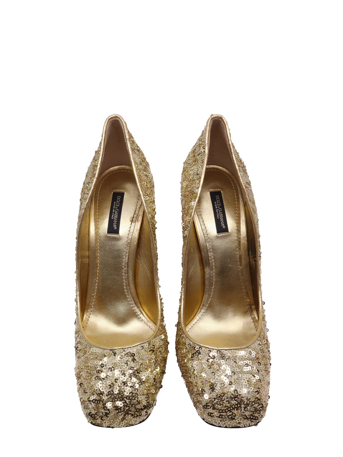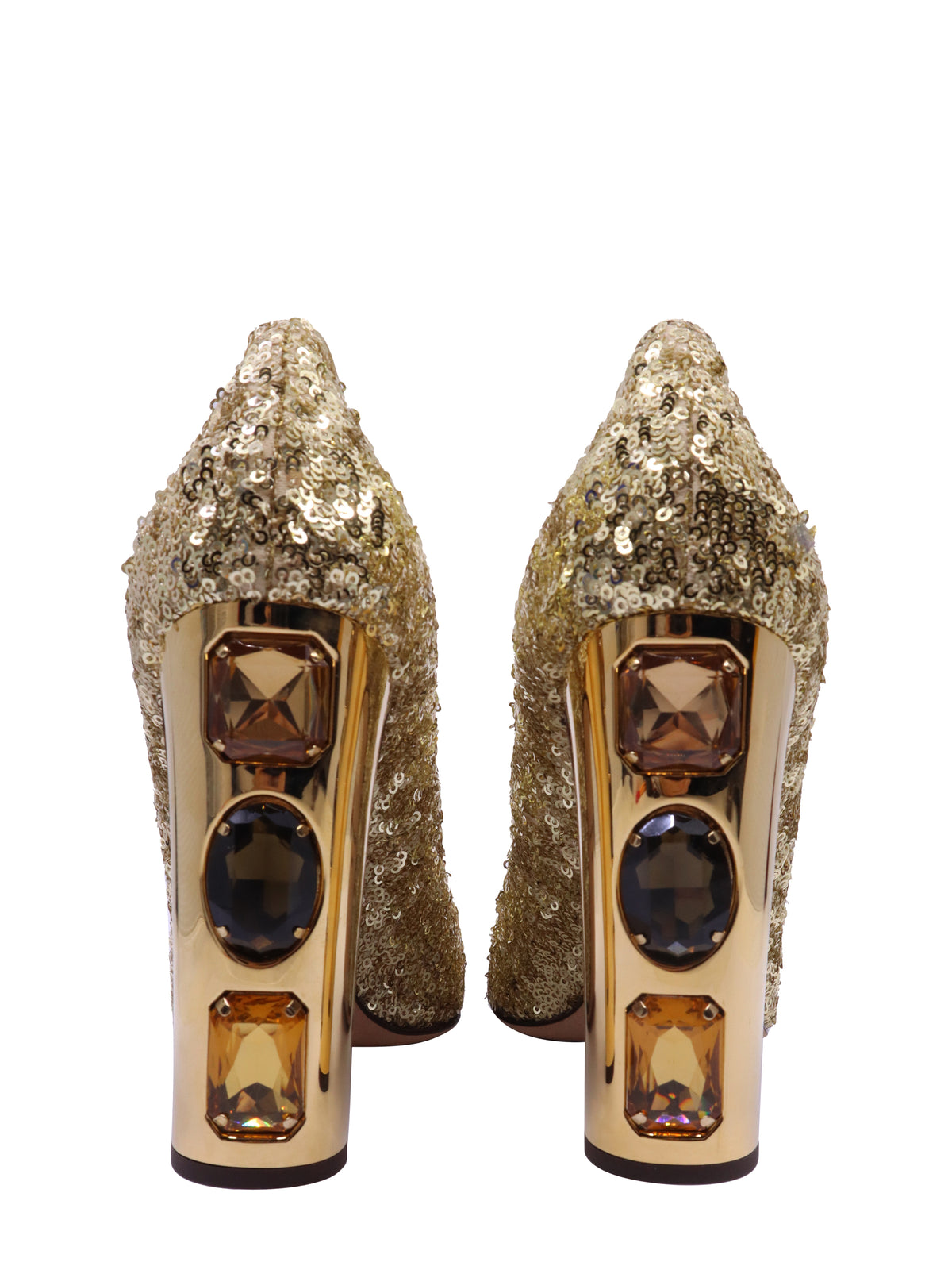 Verleihe deinem Outfit einen Hauch von Luxus mit den Dolce & Gabbana Schuhen! Die glitzernden Gold-Pailletten und funkelnden Diamantsteine auf den Absätzen machen sie zu einem wahren Hingucker. Perfekt für besondere Anlässe oder um jeden Tag ein wenig glamouröser zu gestalten. Gönn dir diese stilvollen High Heels