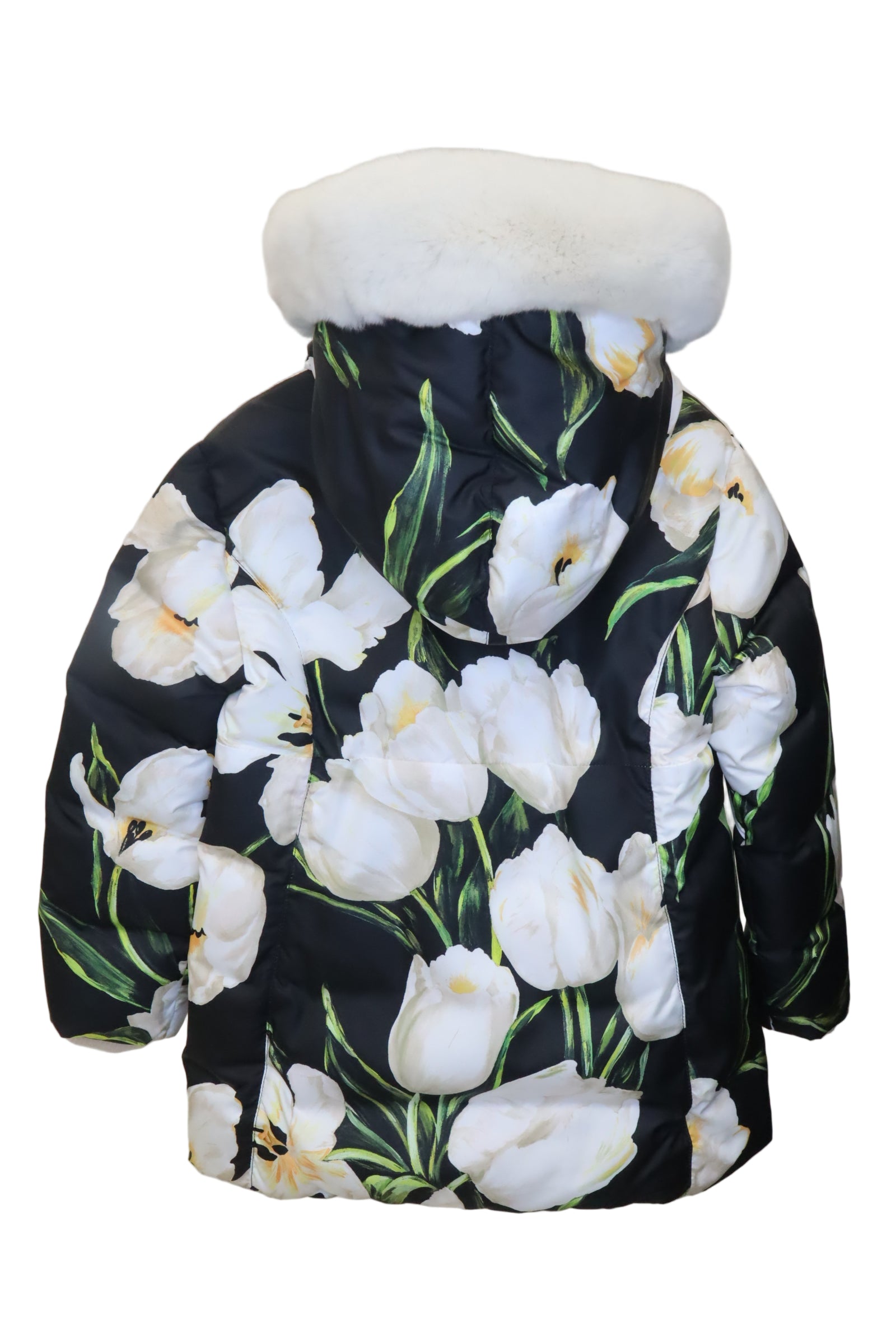 Diese elegante Dolce & Gabbana Kinder-Daunenjacke besticht mit einem wunderschönen Tulpenmuster in Weiß- und Cremetönen auf tiefschwarzem Hintergrund – ein florales Design, das sofort auffällt und absolute Eleganz ausstrahlt.