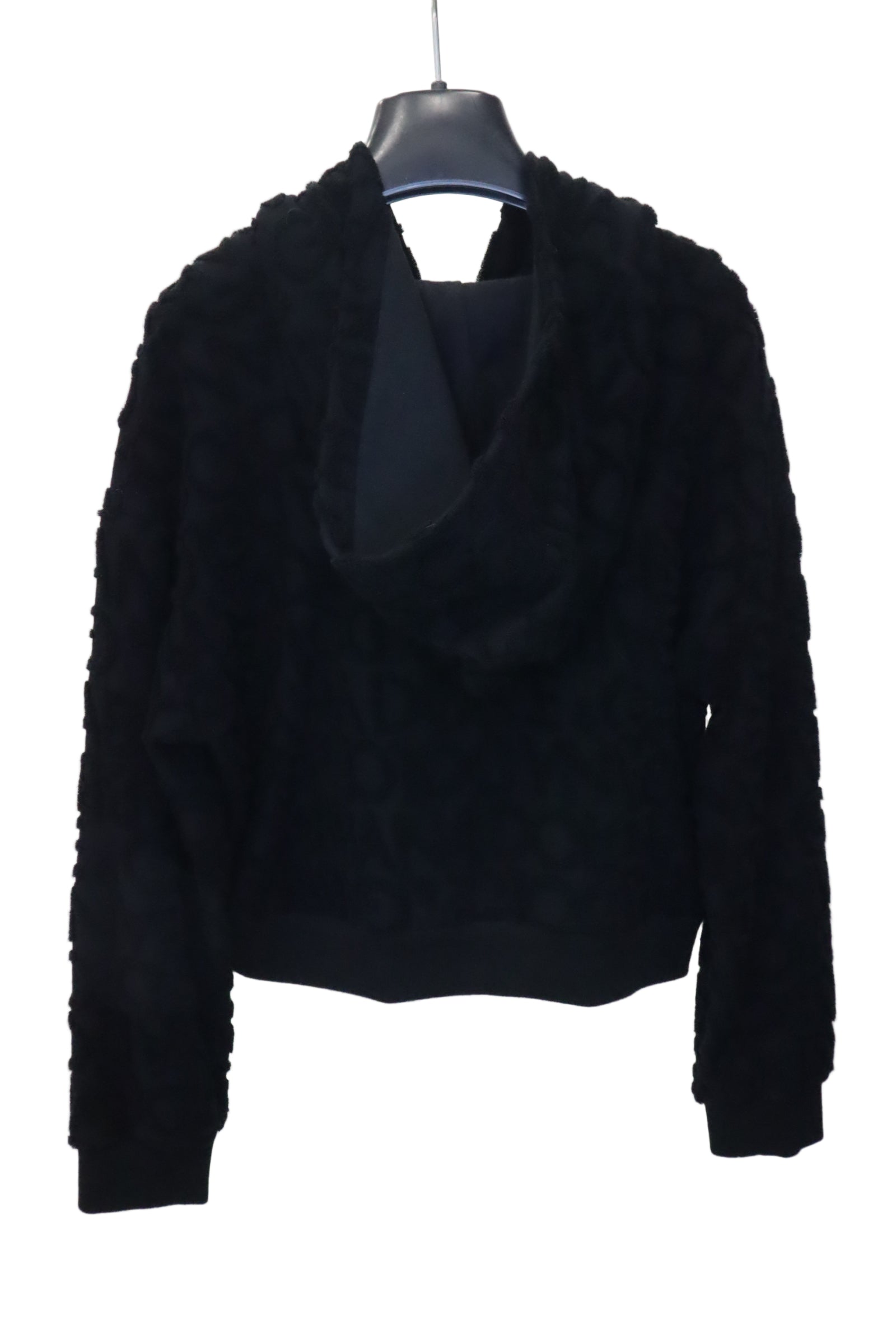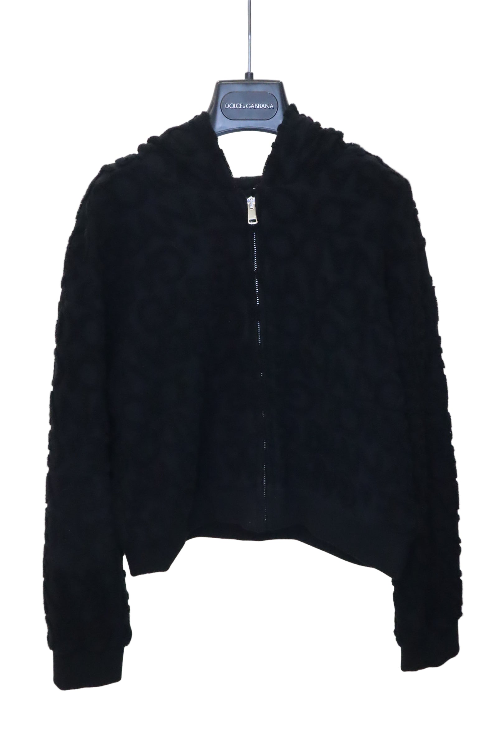 Stylische schwarze Dolce & Gabbana Kinderjacke in Größe 6, gefertigt aus einem weichen, strukturierten Material mit eingewebtem DG-Muster. Die Jacke besitzt eine Kapuze, einen durchgehenden Reißverschluss und gerippte Bündchen – perfekt für einen modernen, gemütlichen Alltagslook.