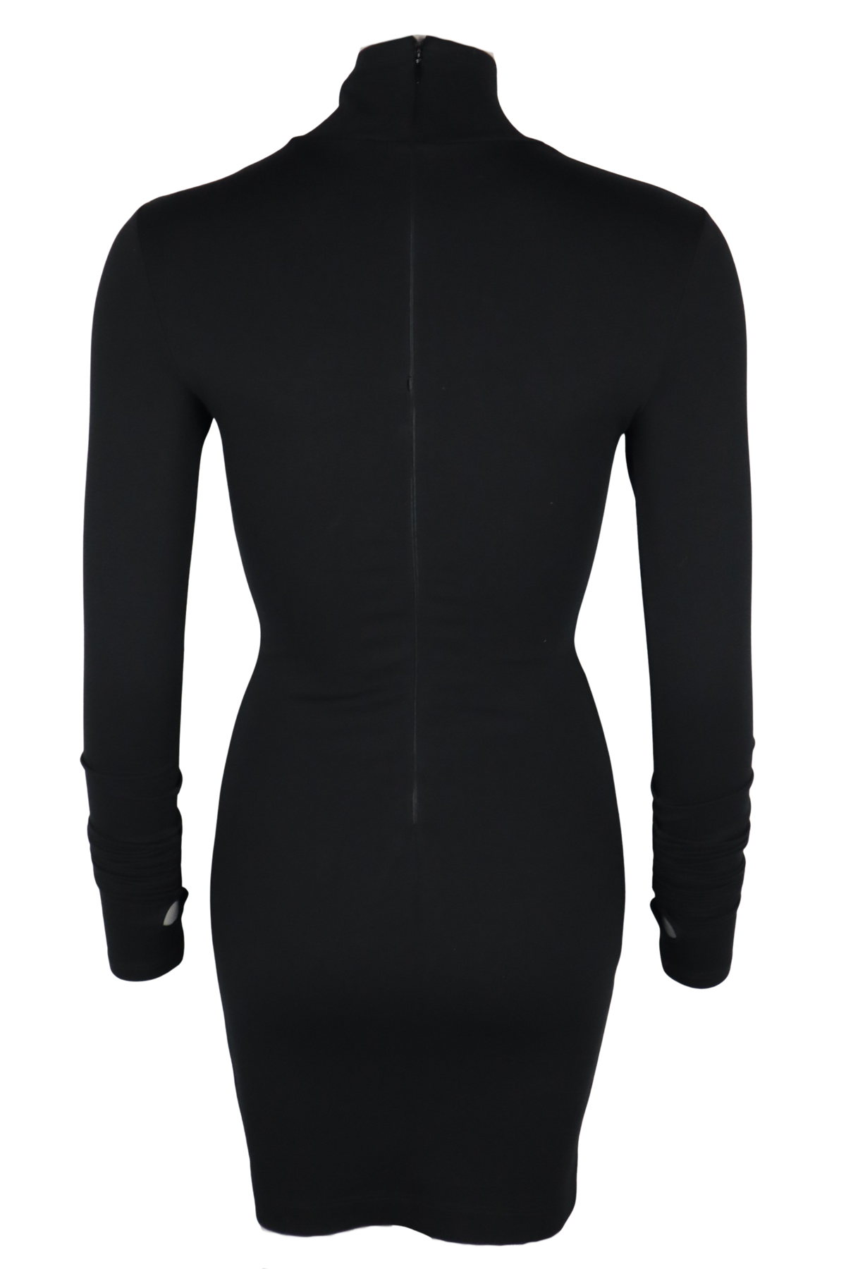 Minimalismus mit maximaler Wirkung – dieses enganliegende Dolce & Gabbana Kleid in klassischem Schwarz überzeugt durch seine cleane Eleganz und moderne Silhouette. Das figurbetonte Design mit langen Ärmeln und hohem Kragen schmeichelt der Körperform und strahlt zeitlose Raffinesse aus.
