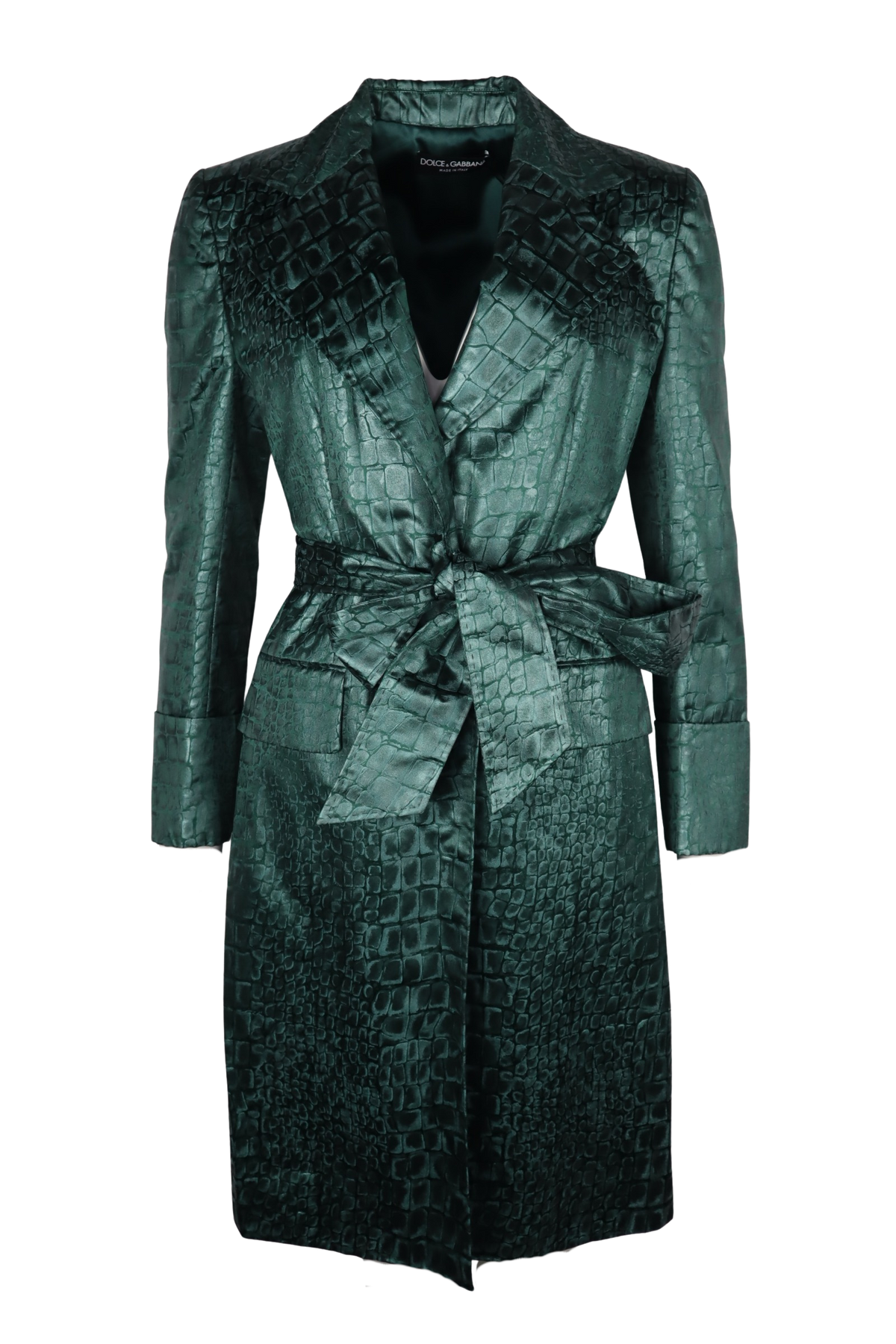 Luxuriös, elegant und ein echtes Statement-Piece – dieser smaragdgrüne Dolce & Gabbana Mantel überzeugt durch sein edles Schimmern und das auffällige Krokoprägungs-Design. Der Taillengürtel betont die feminine Silhouette und sorgt für einen stilvollen, figurbetonten Look.