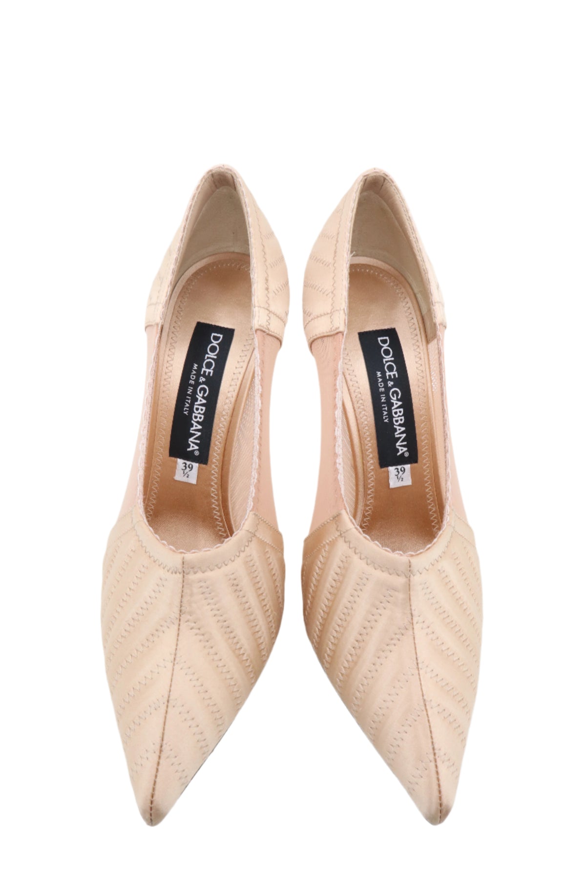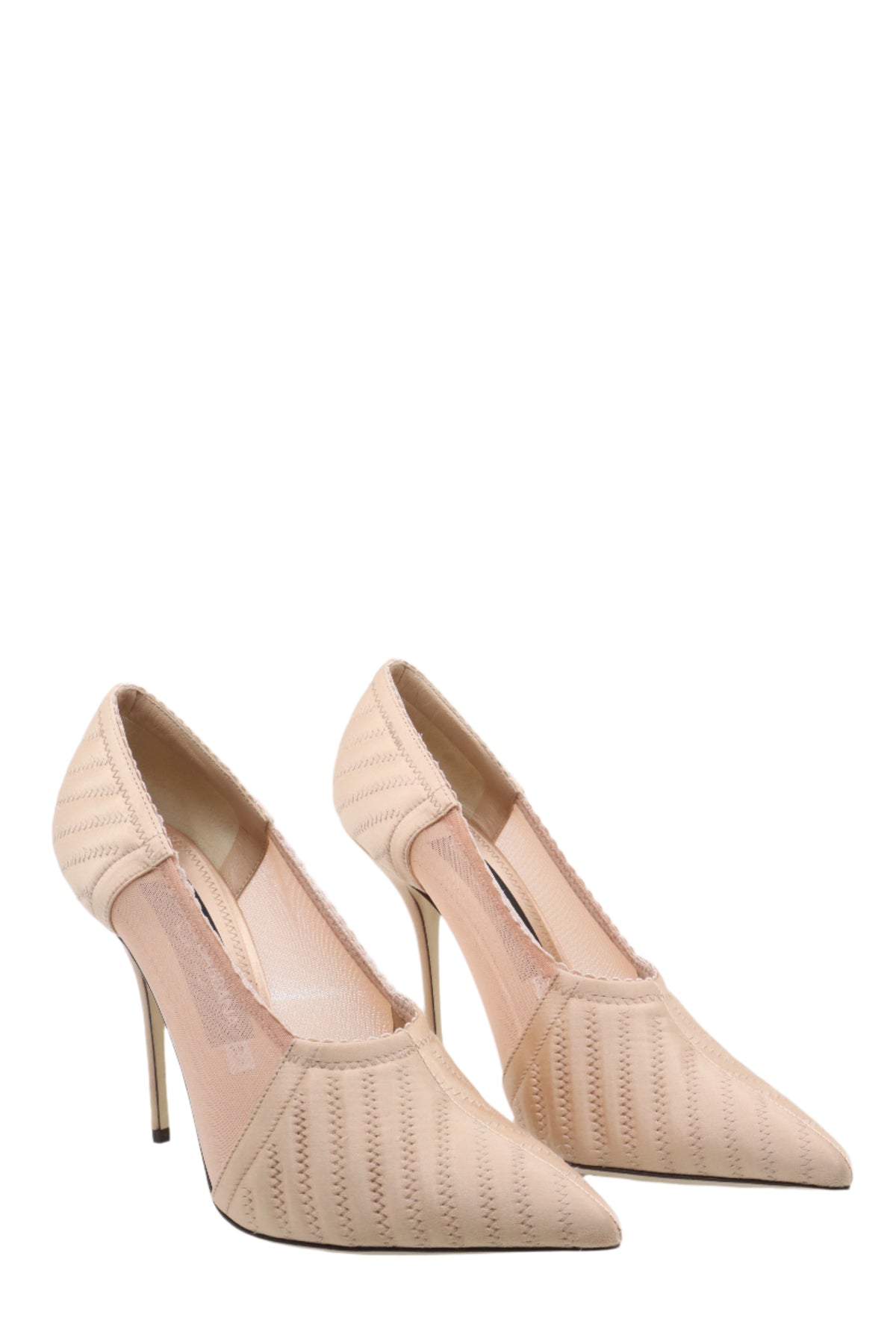 Diese eleganten Pumps von Dolce & Gabbana verkörpern feminine Raffinesse und höchste Handwerkskunst. Das zart roséfarbene Obermaterial mit feiner Steppung und transparentem Mesh-Einsatz sorgt für einen modernen, luftigen Look. Der hohe Stiletto-Absatz streckt die Silhouette und verleiht jedem Outfit eine edle Note – perfekt für besondere Anlässe oder stilvolle Business-Looks.