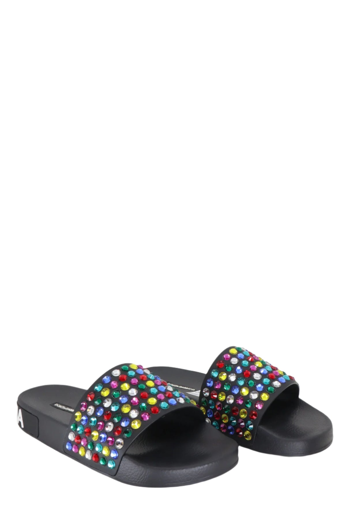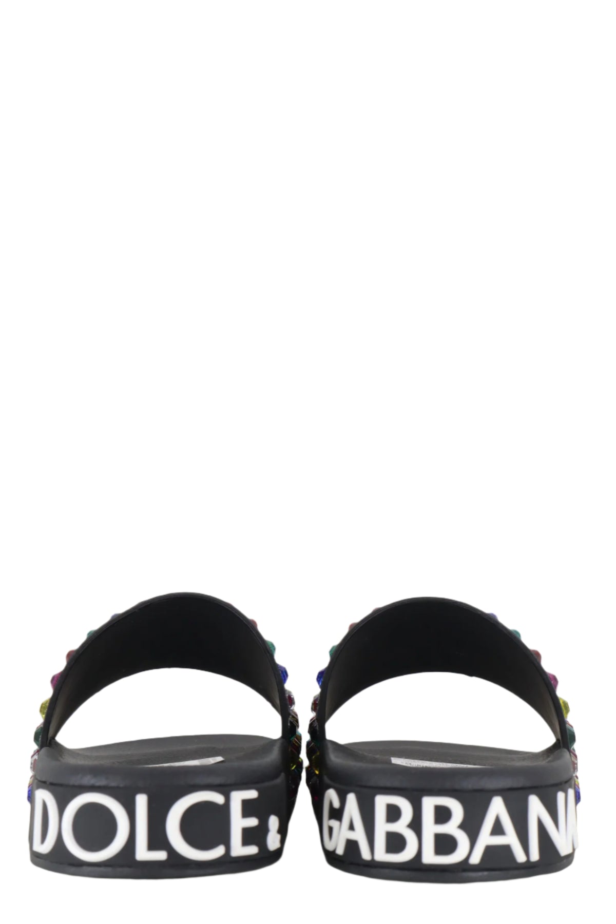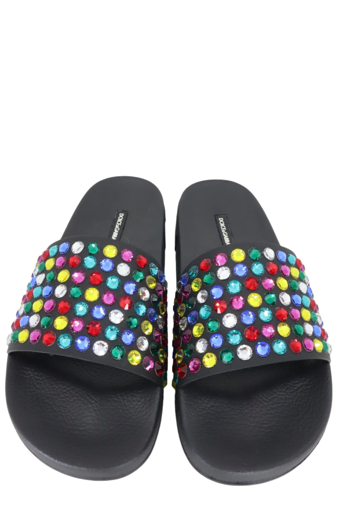 Diese farbenfrohen Slides von Dolce & Gabbana bringen pure Lebensfreude an deine Füße. Der breite Riemen ist mit einer Vielzahl an bunten Kristallsteinen besetzt, die im Licht in allen Regenbogenfarben funkeln – ein echtes Highlight für alle, die gern auffallen. Das schwarze Grunddesign sorgt für einen stilvollen Kontrast und macht die Farben noch intensiver.