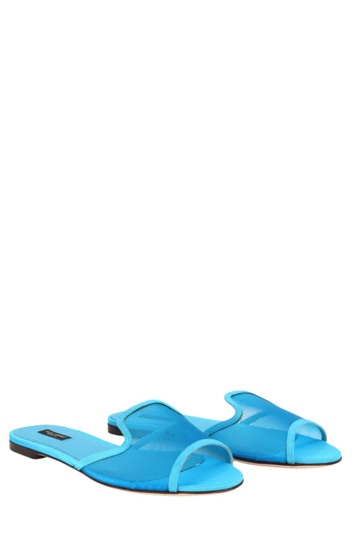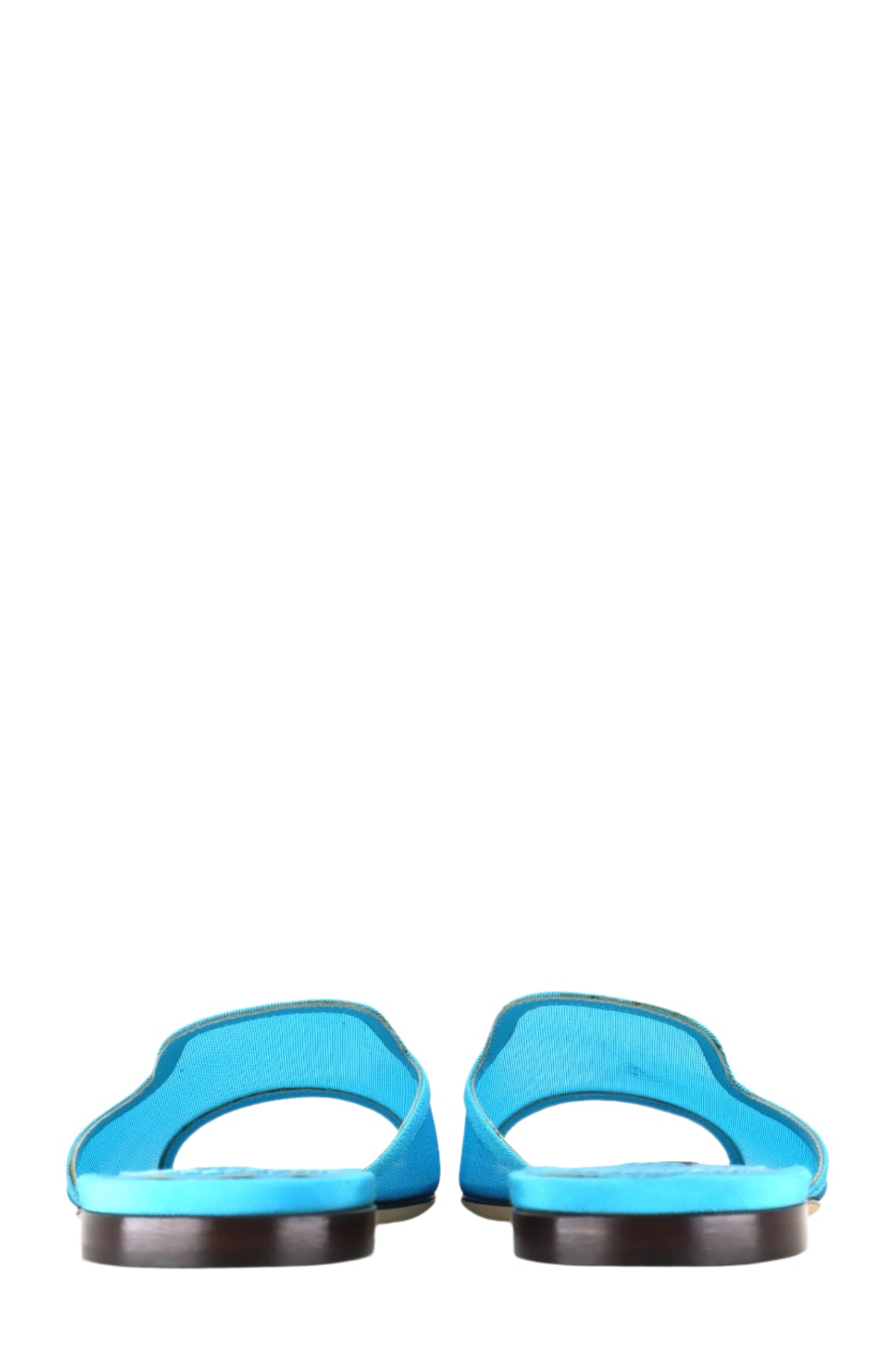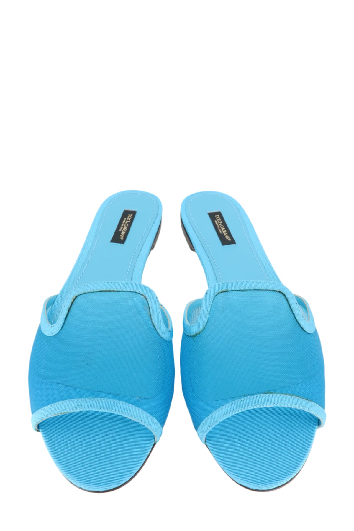 Diese zarten Slides von Dolce & Gabbana verbinden sommerliche Leichtigkeit mit femininer Raffinesse. Das Modell besticht durch seine luftige Verarbeitung aus halbtransparentem Mesh in einem frischen türkisblauen Farbton. Der schlichte Schnitt mit offener Zehenpartie und filigranem Riemen macht die Sandale zum idealen Begleiter für warme Tage.
