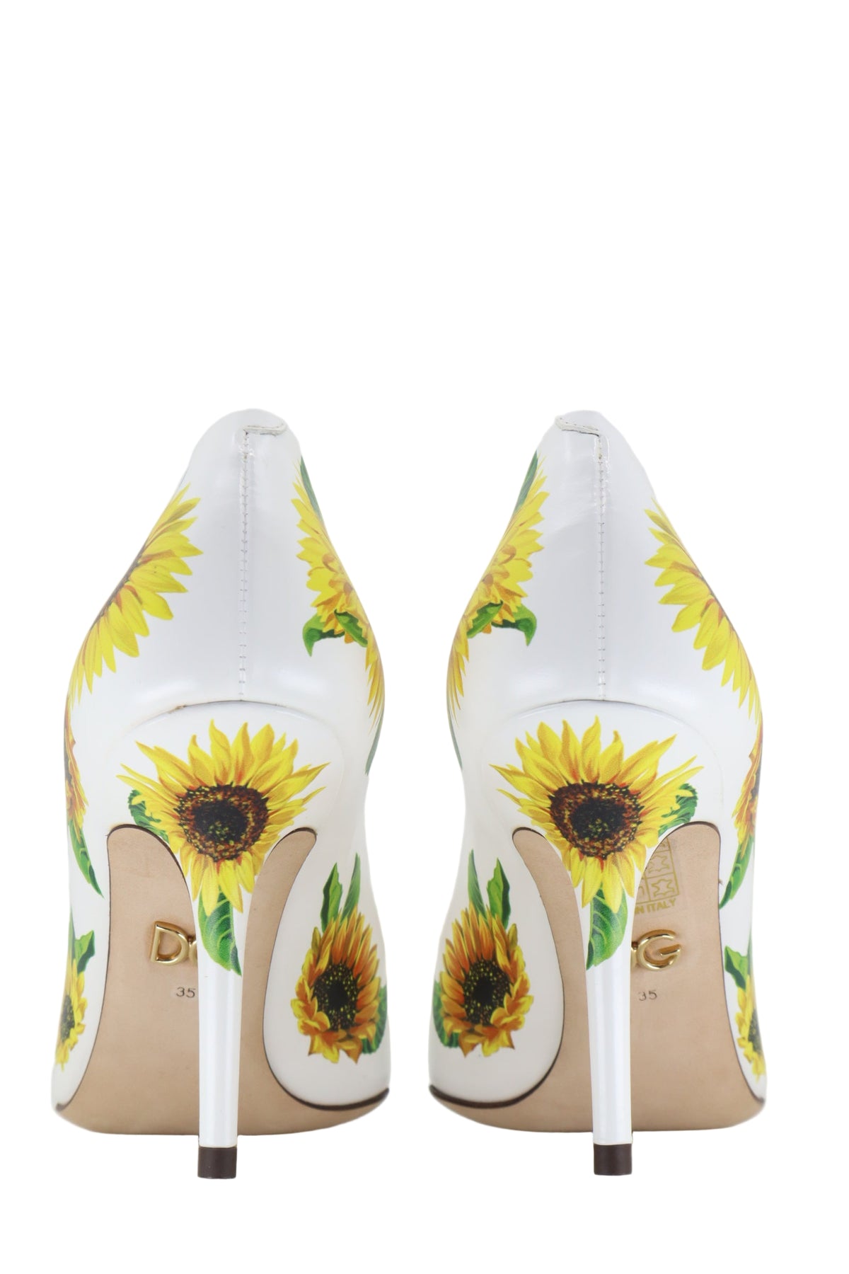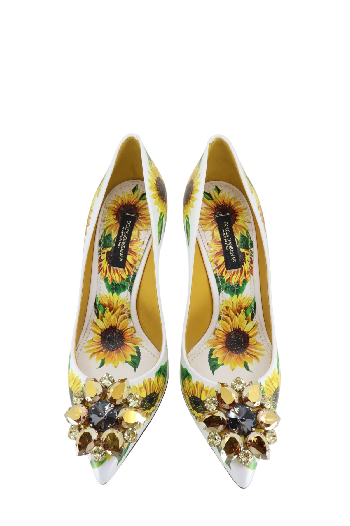 Ein Hauch von Sommer für Ihre Garderobe – diese verspielten Pumps von Dolce & Gabbana vereinen Eleganz mit mediterranem Flair. Das weiße Obermaterial ist mit leuchtend gelben Sonnenblumen verziert und bringt sofort gute Laune in jedes Outfit. Die feine Silhouette mit hohem, schmalem Absatz zaubert eine feminine Linie, während das funkelnde Schmuckdetail auf der Schuhspitze für glamouröse Akzente sorgt.