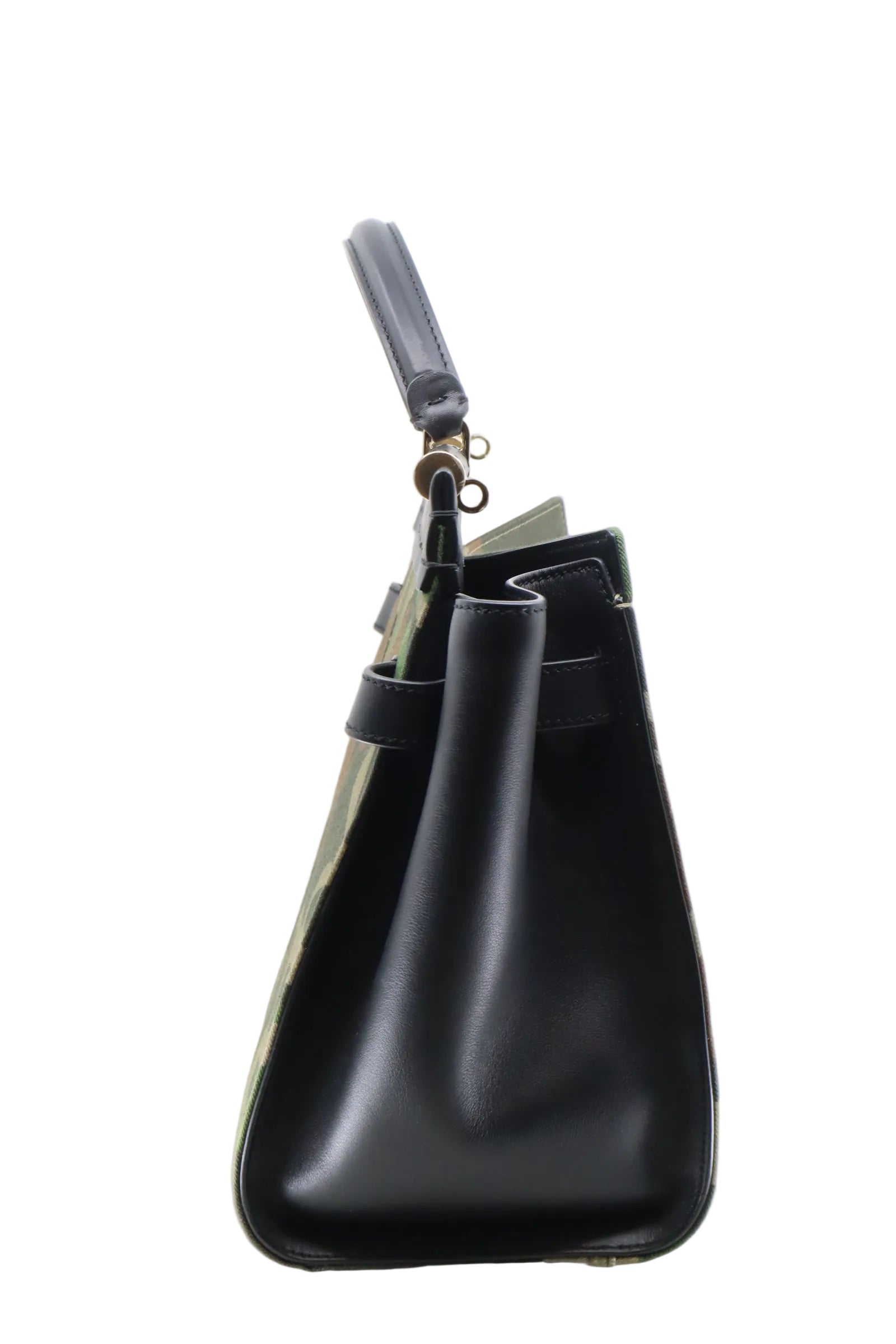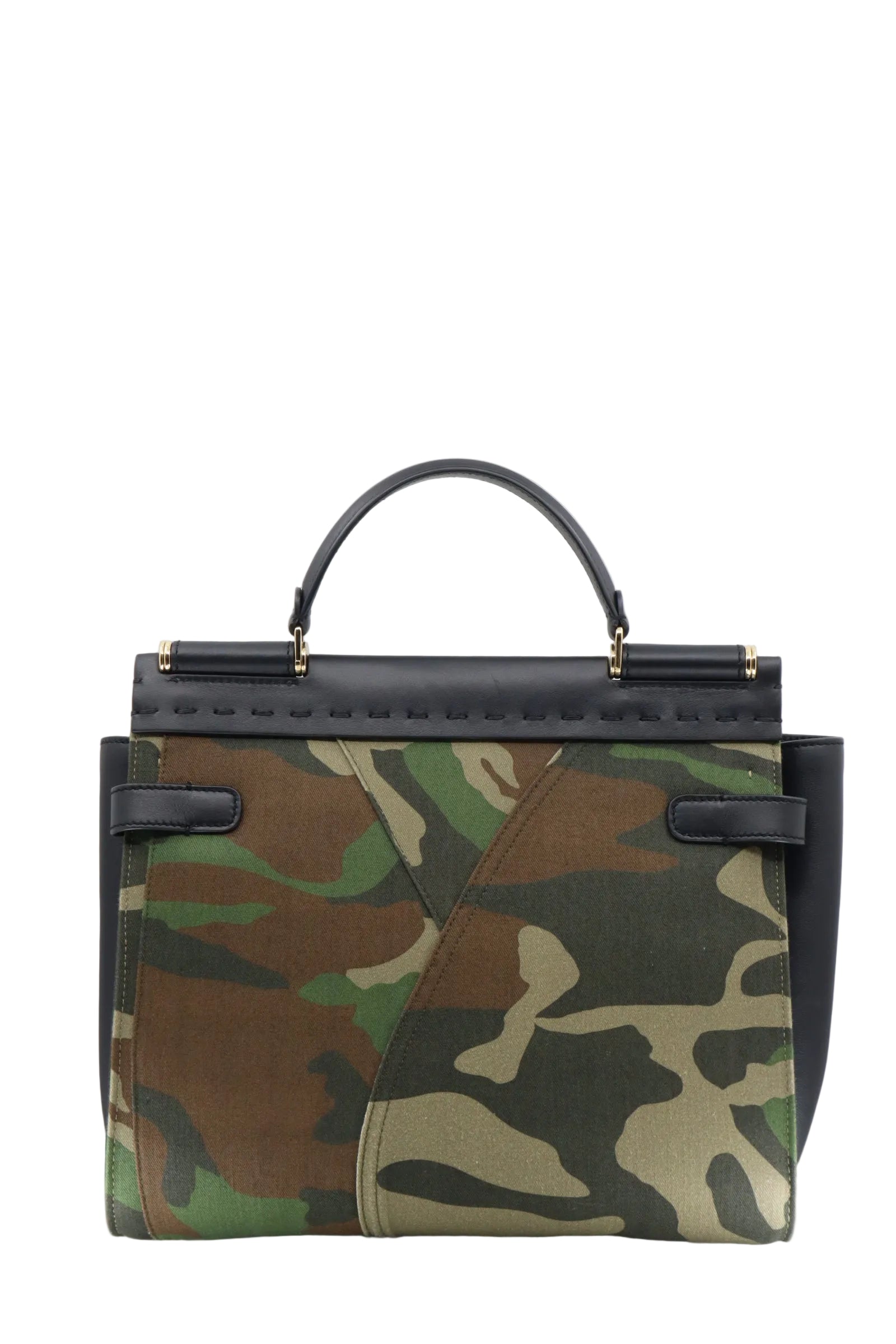 Diese exklusive Dolce & Gabbana Tasche vereint luxuriösen Tragekomfort mit einem markanten Design für stilbewusste Persönlichkeiten. Die Kombination aus schwarzem Leder und Canvas in modernem Camouflage-Muster macht diese Tasche zu einem echten Statement-Piece. Mit goldfarbenen Details und klaren Linien strahlt sie sowohl Eleganz als auch urbanen Chic aus. Die strukturierte Form sorgt für Stabilität, während der kurze Tragegriff und die seitlichen Elemente Funktionalität und Raffinesse miteinander verbinden.