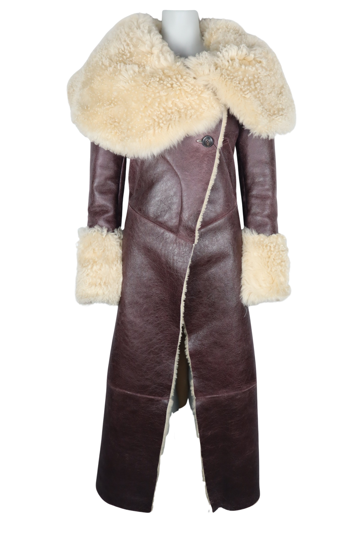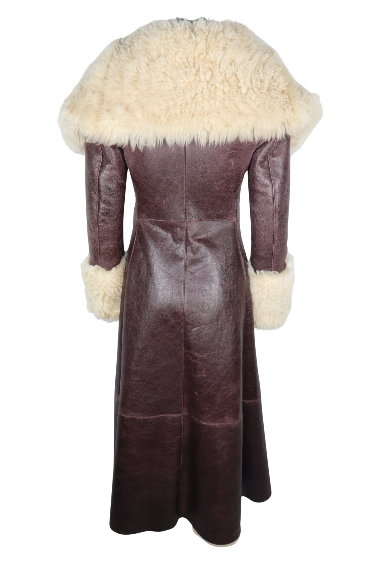 Ein luxuriöser Hingucker für die kalte Jahreszeit – dieser exklusive Marni Mantel verbindet edles Design mit maximalem Komfort. Gefertigt aus hochwertigem, dunkelbraunem Leder, ist er innen vollständig mit weichem Schaffell gefüttert und bietet so Wärme und Eleganz zugleich. Das Highlight ist der großzügige cremefarbene Schaffellkragen, der sich elegant über die Schultern legt und dem Mantel eine dramatische, luxuriöse Note verleiht. Passend dazu sind die Ärmelabschlüsse ebenfalls mit Schaffell besetzt, was den Look harmonisch abrundet.