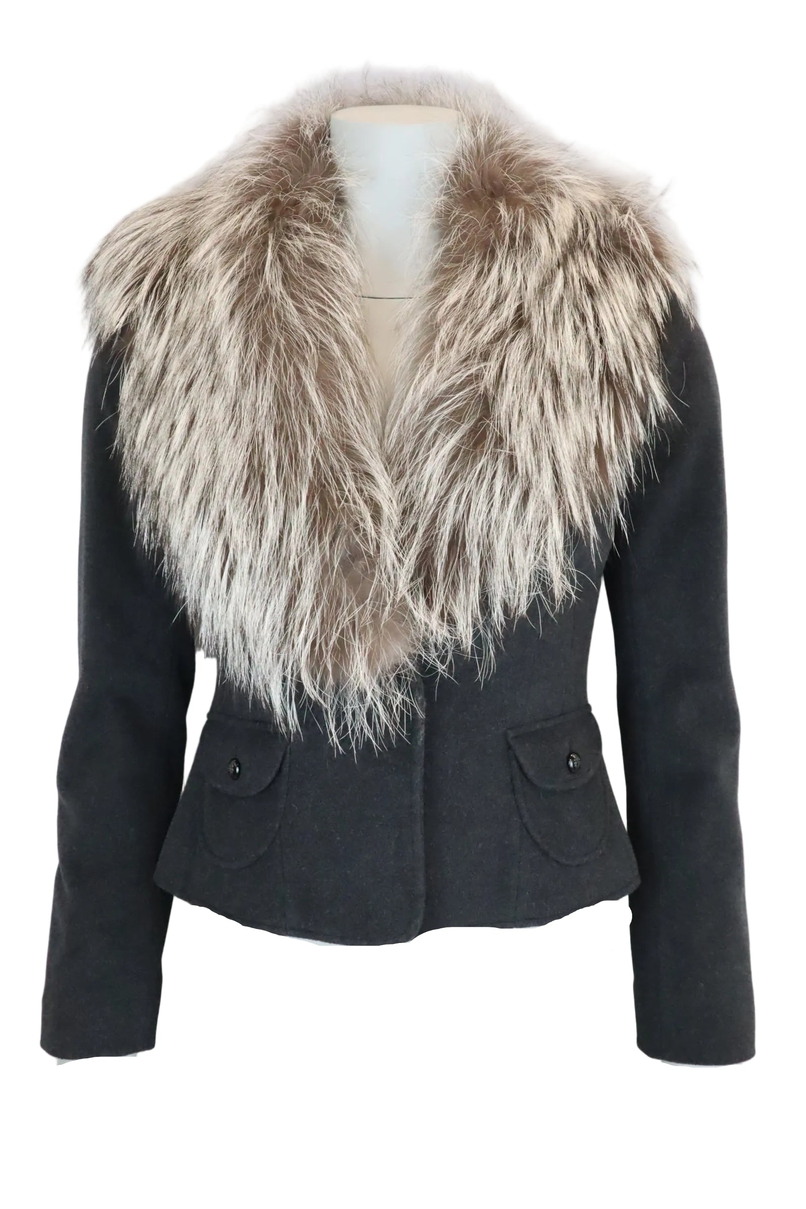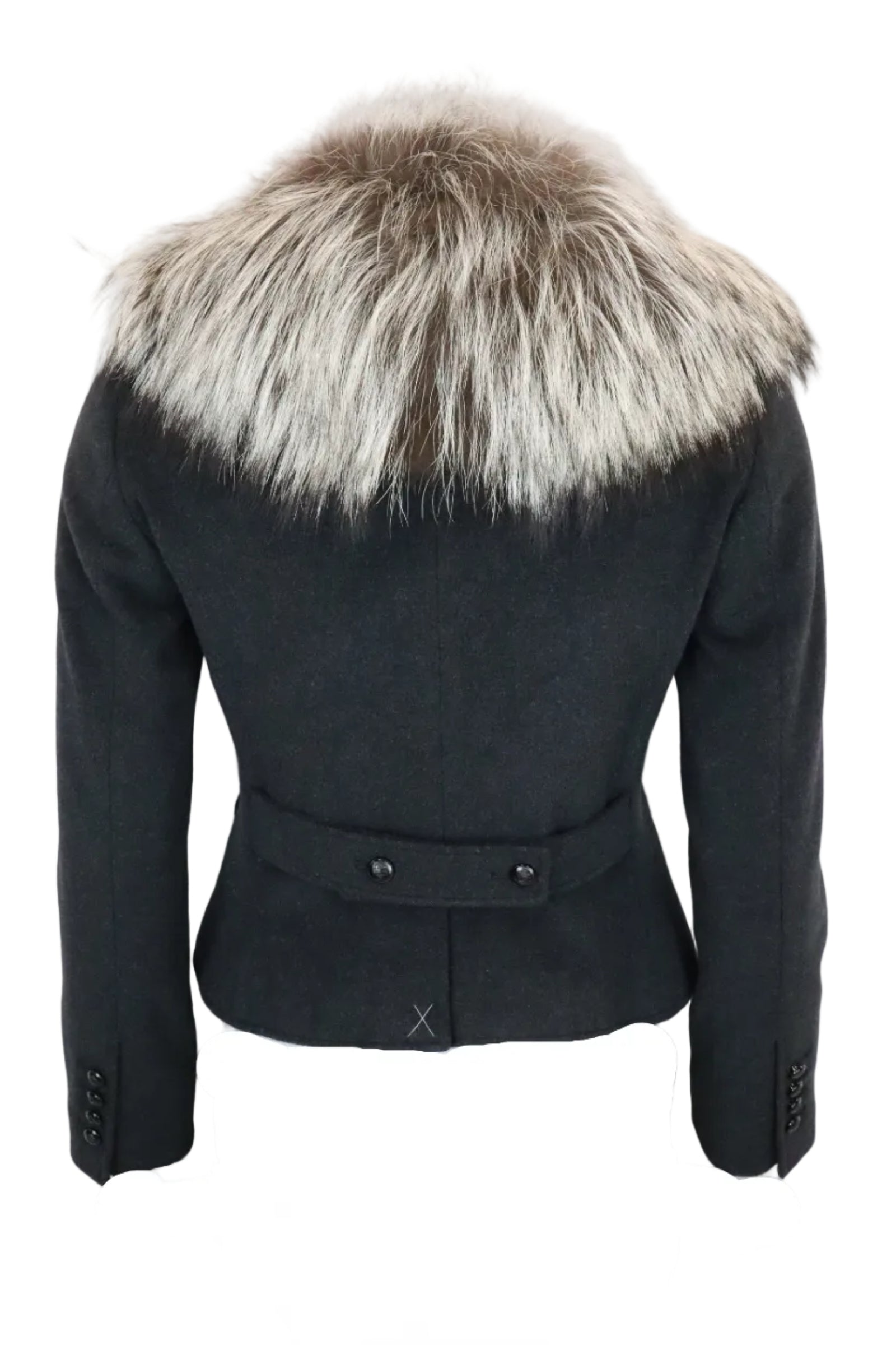 Diese elegante Jacke von Dolce & Gabbana vereint klassischen Chic mit luxuriösen Details. Der taillierte Schnitt aus schwarzem Wollstoff betont die feminine Silhouette und sorgt für eine stilvolle Passform. Das Highlight ist der voluminöse Kragen aus hochwertigem Kunstpelz in Naturtönen, der dem Look eine extravagante Note verleiht und gleichzeitig wunderbar wärmt.