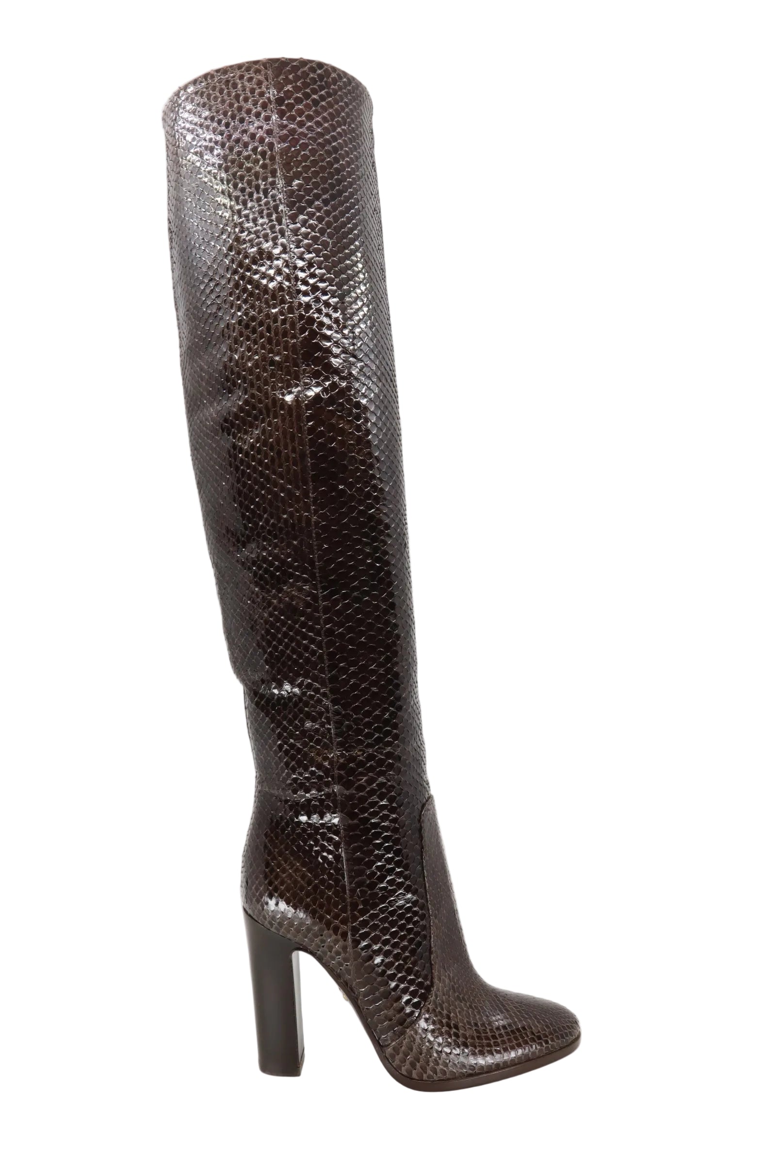 Luxus trifft Extraklasse: Diese kniehohen Stiefel von Dolce & Gabbana sind ein eindrucksvolles Statement für stilbewusste Frauen mit einem Gespür für außergewöhnliche Eleganz. Das edle Schlangenleder-Finish in einem satten Dunkelbraun verleiht dem Schuh eine verführerische Textur und glänzende Tiefe. Der hohe Blockabsatz sorgt für eine feminine Silhouette und bietet gleichzeitig Stabilität und Komfort.
