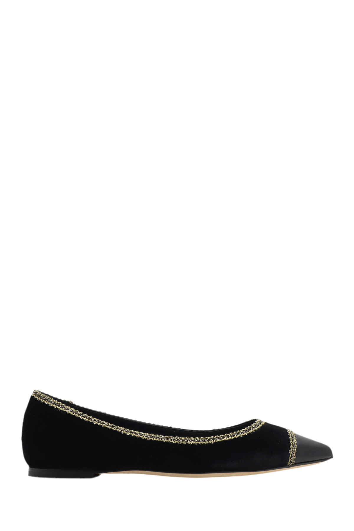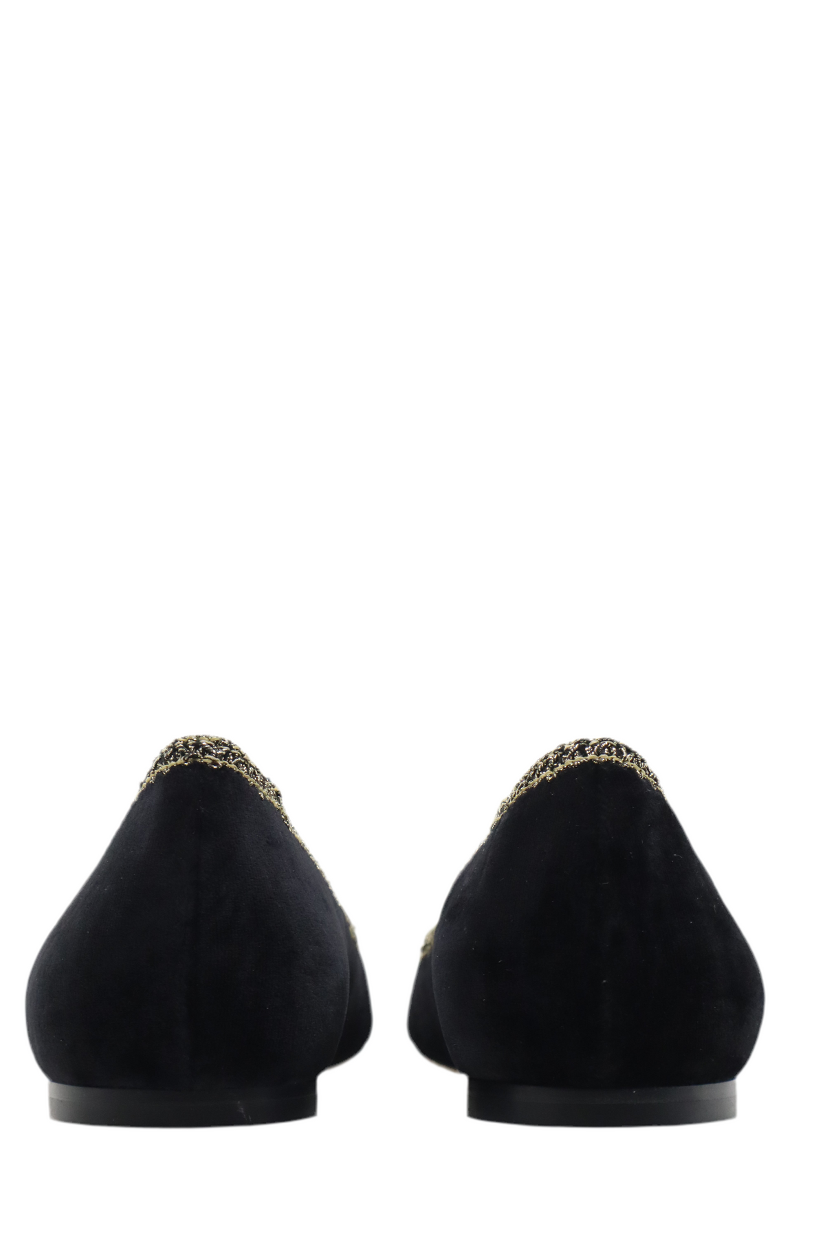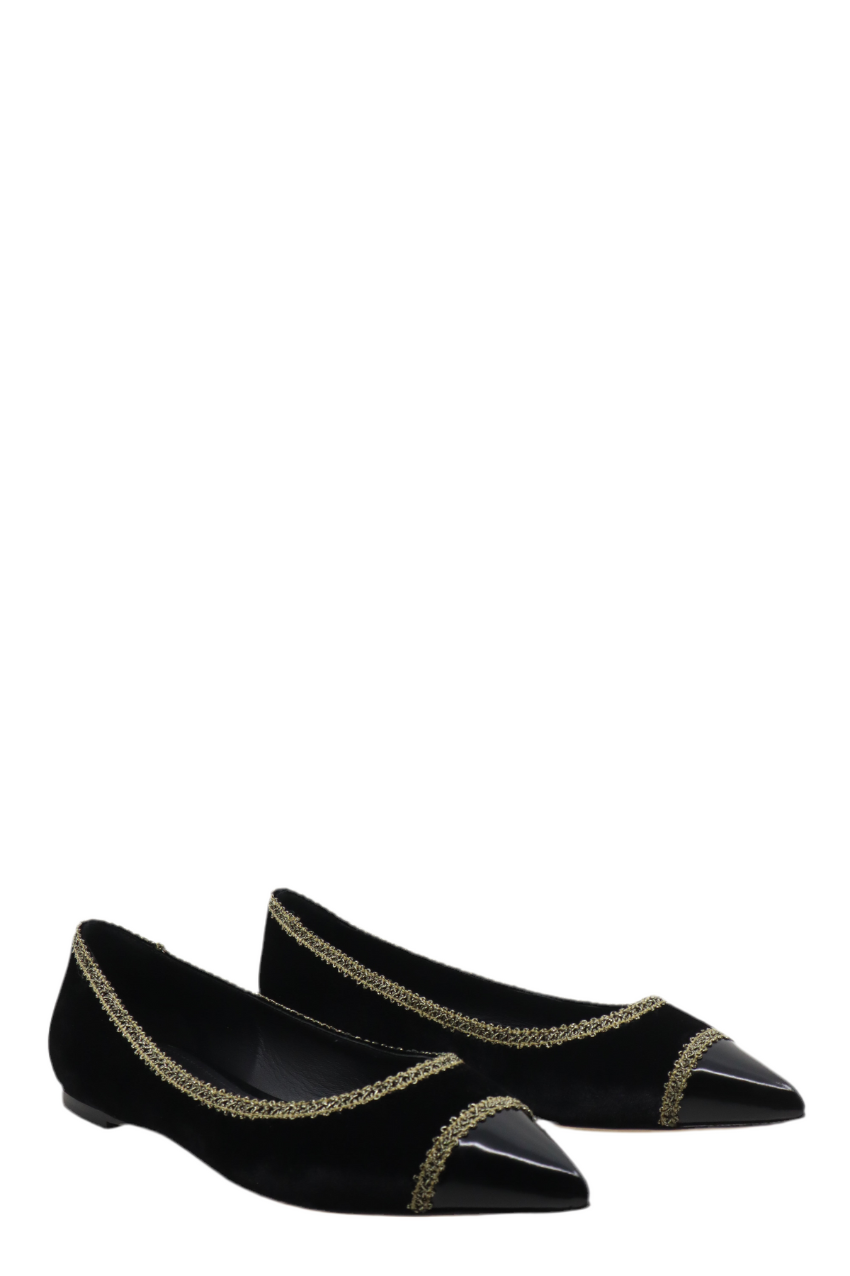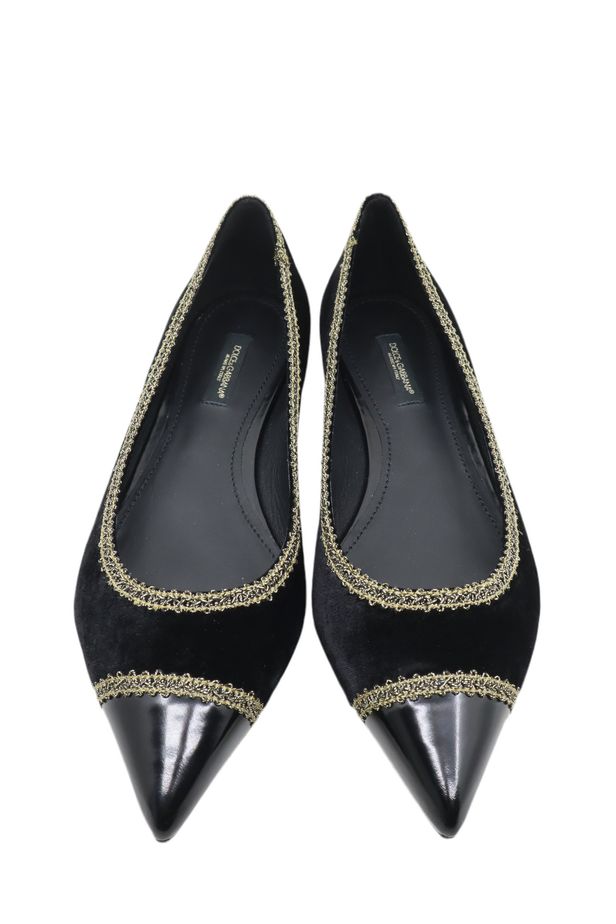 Diese edlen Ballerinas von Dolce & Gabbana vereinen klassischen Chic mit luxuriösen Details. Das tiefschwarze Samt-Obermaterial wird durch feine, goldfarbene Zierstickereien elegant akzentuiert. Die spitz zulaufende Kappe in Lederoptik rundet das Design stilvoll ab und verleiht dem flachen Schuh eine feminine Note. Ideal für elegante Tagesoutfits oder stilvolle Abende – ein Schuh, der Komfort und Klasse perfekt kombiniert.