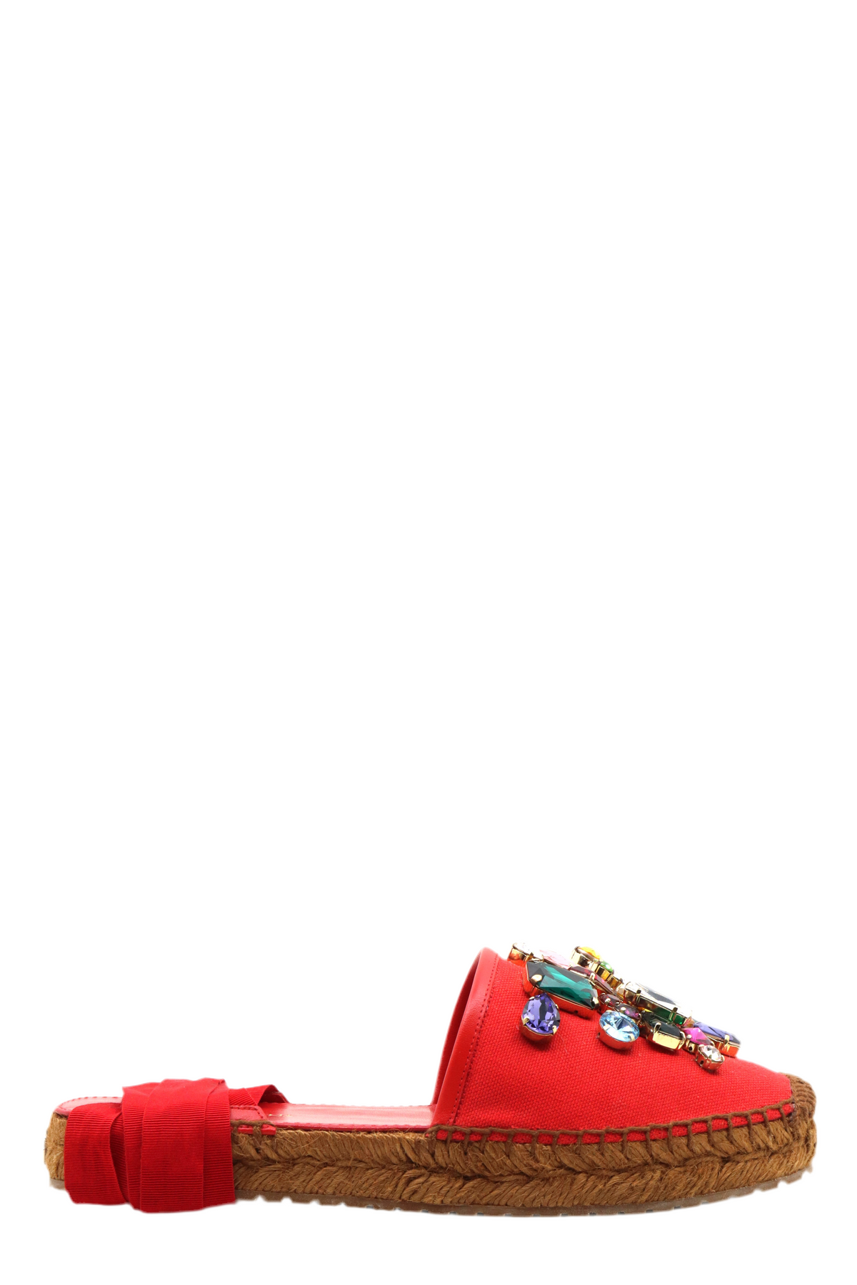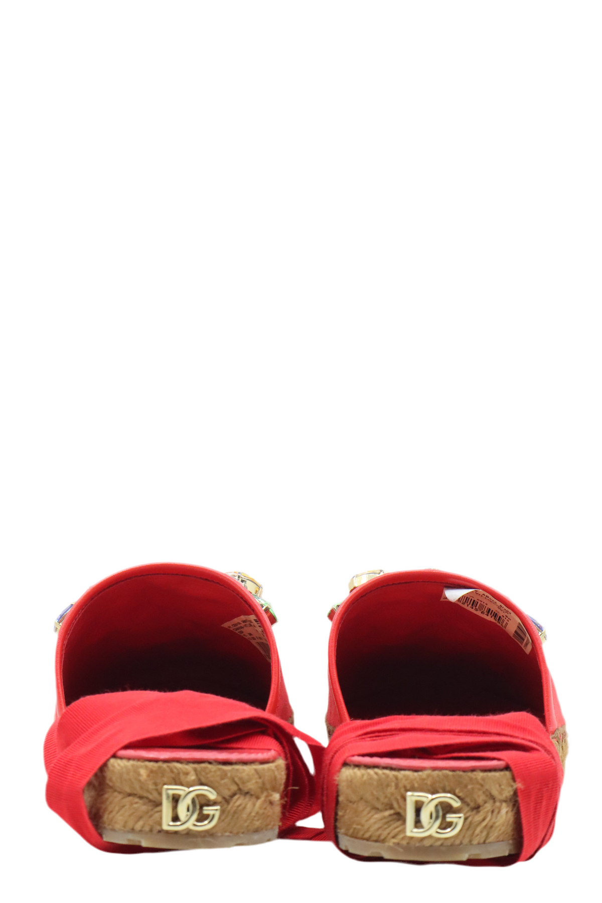 Diese sommerlichen Pantoletten von Dolce & Gabbana sind die perfekte Mischung aus Komfort und Glamour. Das leuchtend rote Obermaterial aus Textil wird durch funkelnde, bunte Strasssteine kunstvoll verziert und verleiht jedem Outfit eine fröhliche Note. Die Bastsohle unterstreicht den Espadrilles-Charakter und sorgt für ein angenehmes Laufgefühl. Ein femininer Schleifendetail an der Ferse rundet das verspielte Design ab – ideal für stilvolle Urlaubsmomente oder sonnige City-Tage.