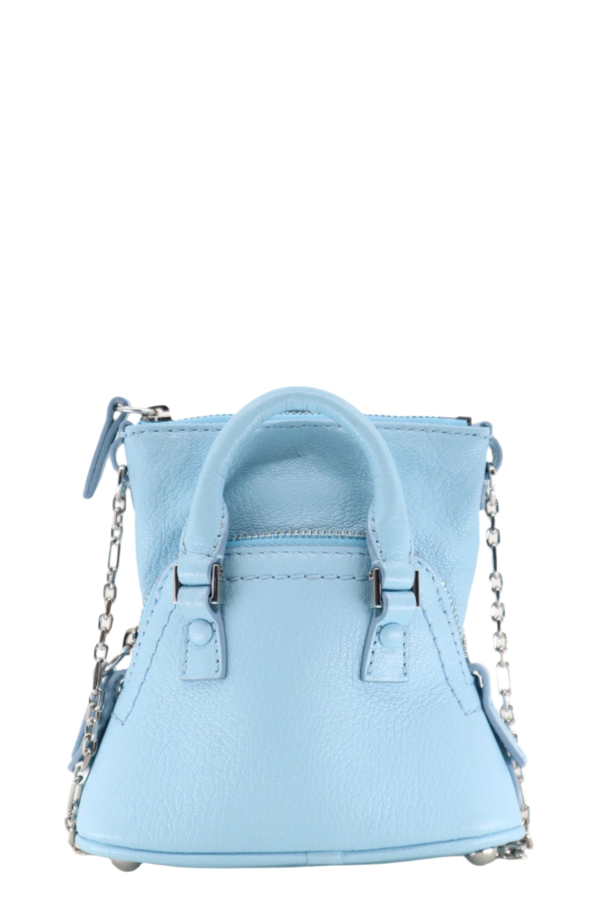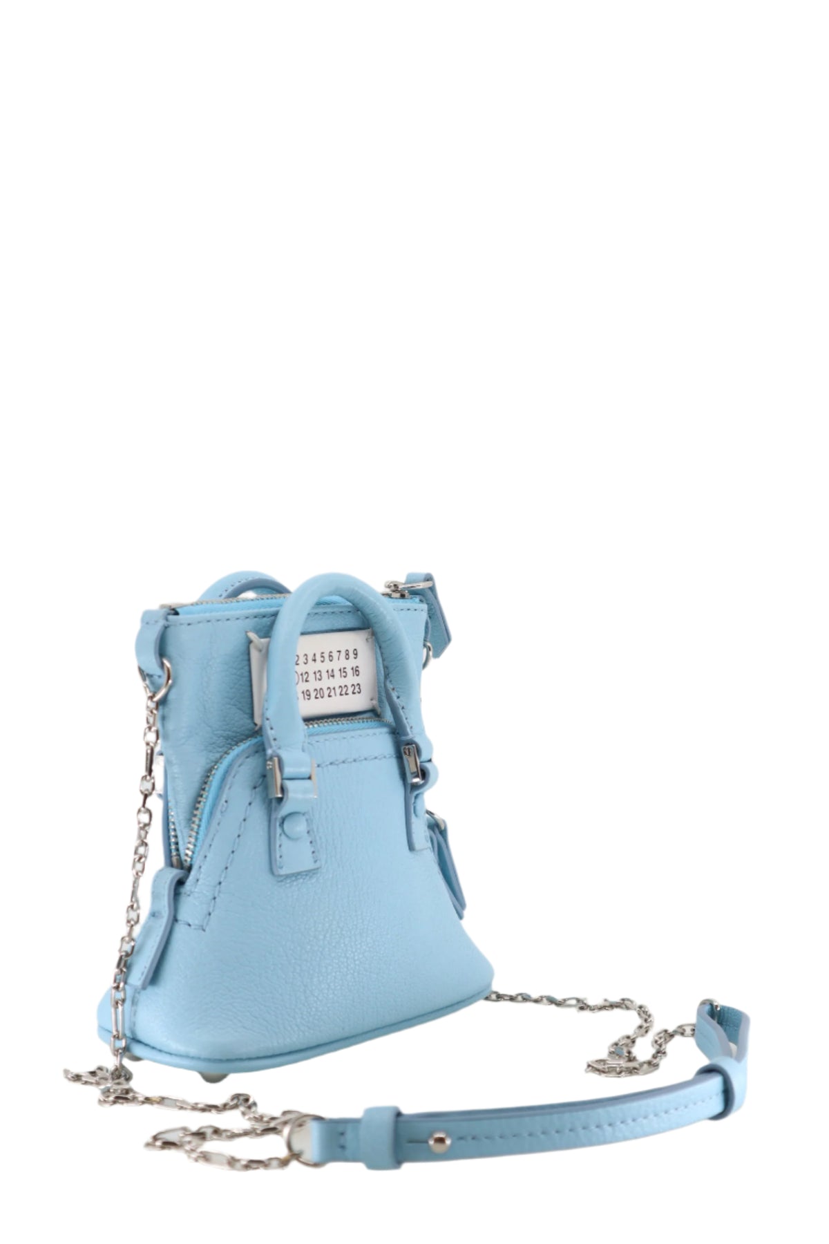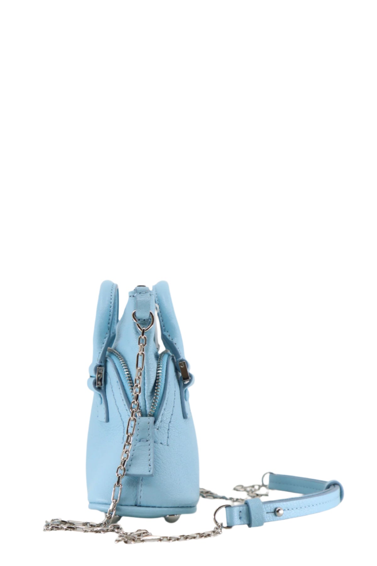 Die kompakte Maison Margiela Tasche in zartem Hellblau vereint modische Raffinesse mit höchster Funktionalität. Gefertigt aus hochwertigem Glattleder mit strukturierter Oberfläche bietet sie trotz ihrer kleinen Größe einen stilvollen Auftritt. Die silberfarbene Gliederkette dient als Schulterriemen und verleiht der Tasche einen urbanen, modernen Touch. Das ikonische Margiela-Label mit den Ziffern auf der Front rundet das Design markentypisch ab – ein echtes Statement für modebewusste Frauen.