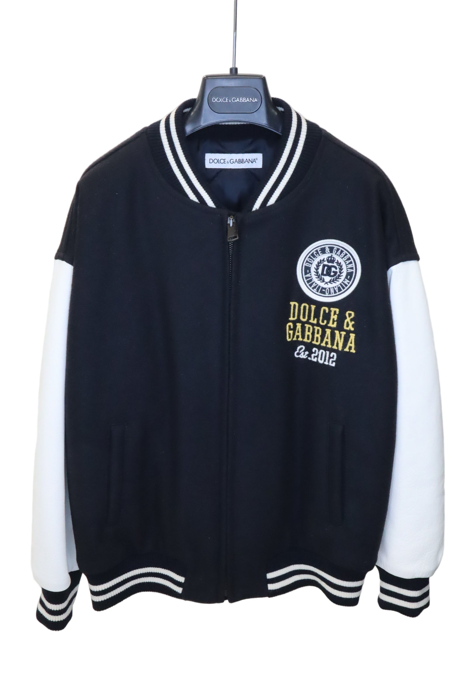 Auf der Brust setzen die detailreichen Stickereien – darunter das runde DG-Wappen und der goldene Dolce & Gabbana Est. 2012 Schriftzug – hochwertige Markenakzente. Gestreifte Bündchen an Kragen, Ärmeln und Saum verleihen der Jacke einen klassischen, sportlichen Look. Ein stylisches Statement-Piece für kleine Fashion-Fans, das Komfort und Premium-Design ideal verbindet.