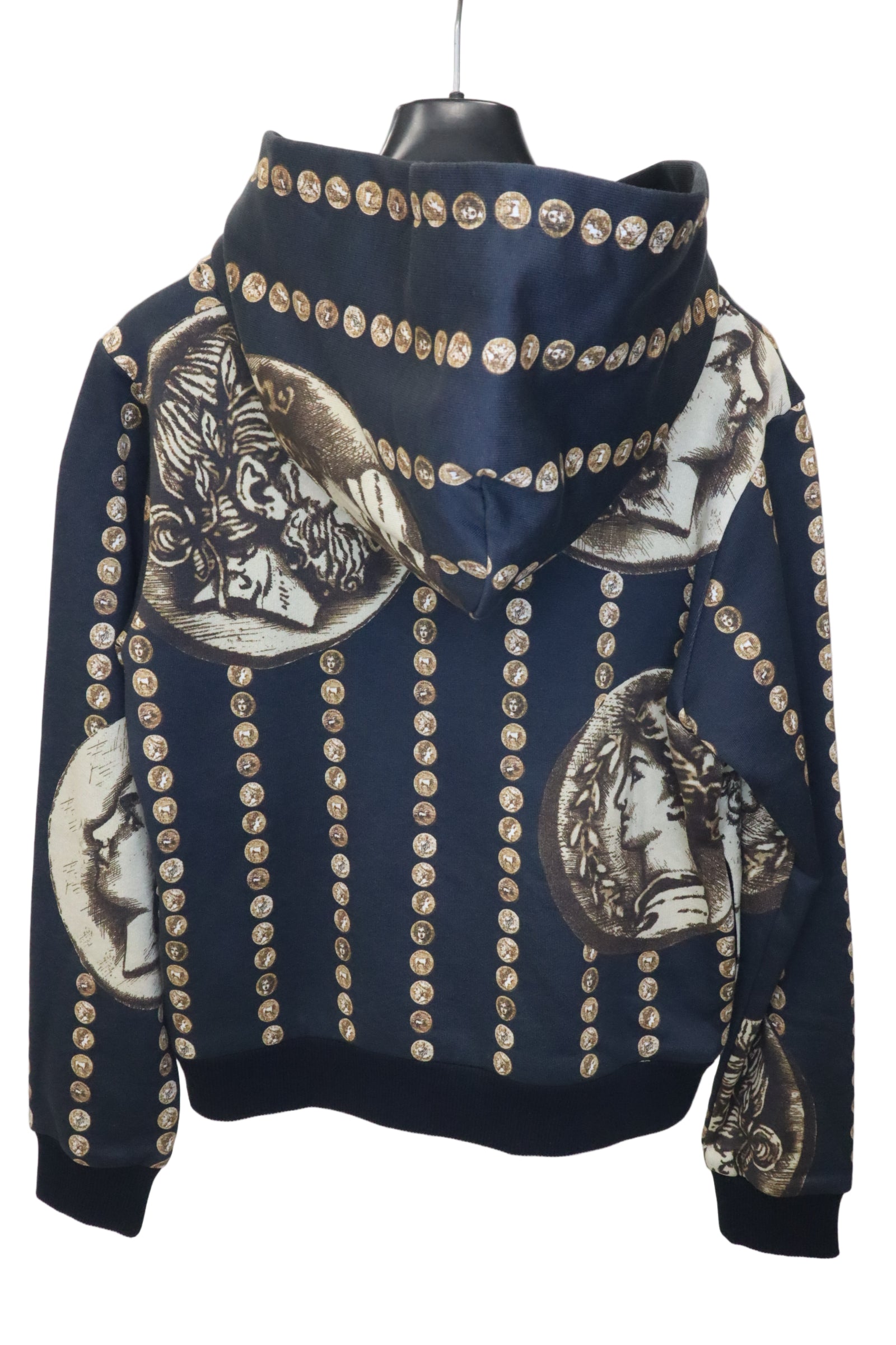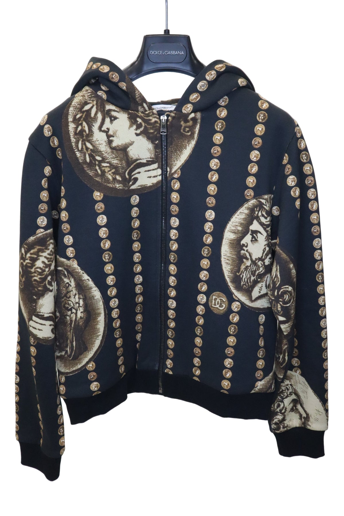 Dieser luxuriöse Dolce & Gabbana Kinder Hoodie präsentiert sich in einem edlen Schwarzton mit aufwendigem, antik inspiriertem Münz- und Portrait-Print. Die kunstvollen gold-braunen Motive verleihen dem Hoodie eine extravagante, fast schon royale Ausstrahlung – ein echtes Highlight für kleine Fashion-Liebhaber.