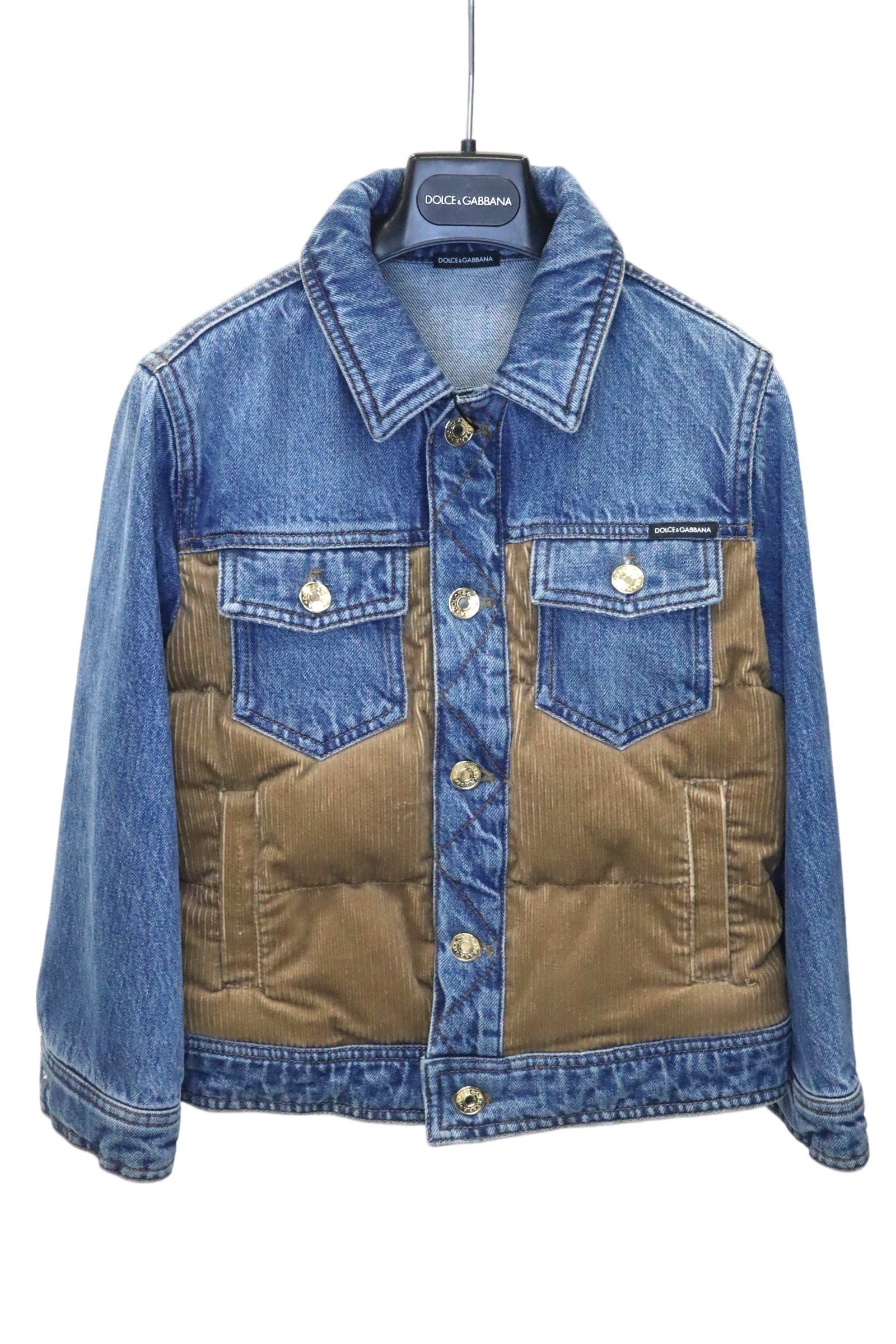 Diese außergewöhnliche Dolce & Gabbana Kinder Jacke kombiniert auf stilvolle Weise zwei Materialien zu einem echten Designer-Highlight. Der obere Teil aus klassischem, kräftigem Denim verleiht der Jacke einen coolen, lässigen Look, während der untere Teil aus wattiertem, braunem Stoff einen luxuriösen und zugleich funktionalen Akzent setzt.