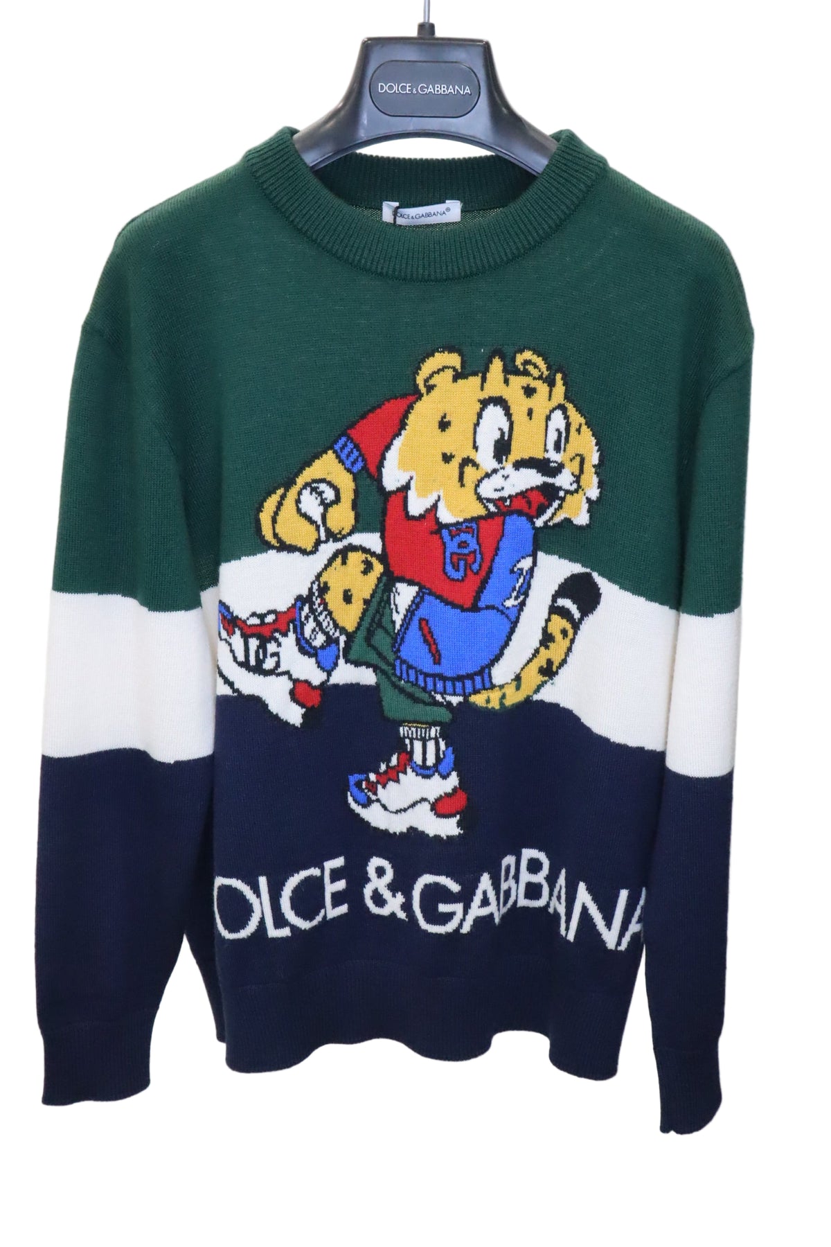 Dieser exklusive Dolce & Gabbana Kinder Pullover begeistert mit seinem farbenfrohen, verspielten Design. Die Kombination aus sattem Dunkelgrün, Reinweiß und Navy-Blau schafft einen stylischen Colorblock-Look, der perfekt von der großen, detailreichen Cartoon-Großkatze auf der Vorderseite ergänzt wird.