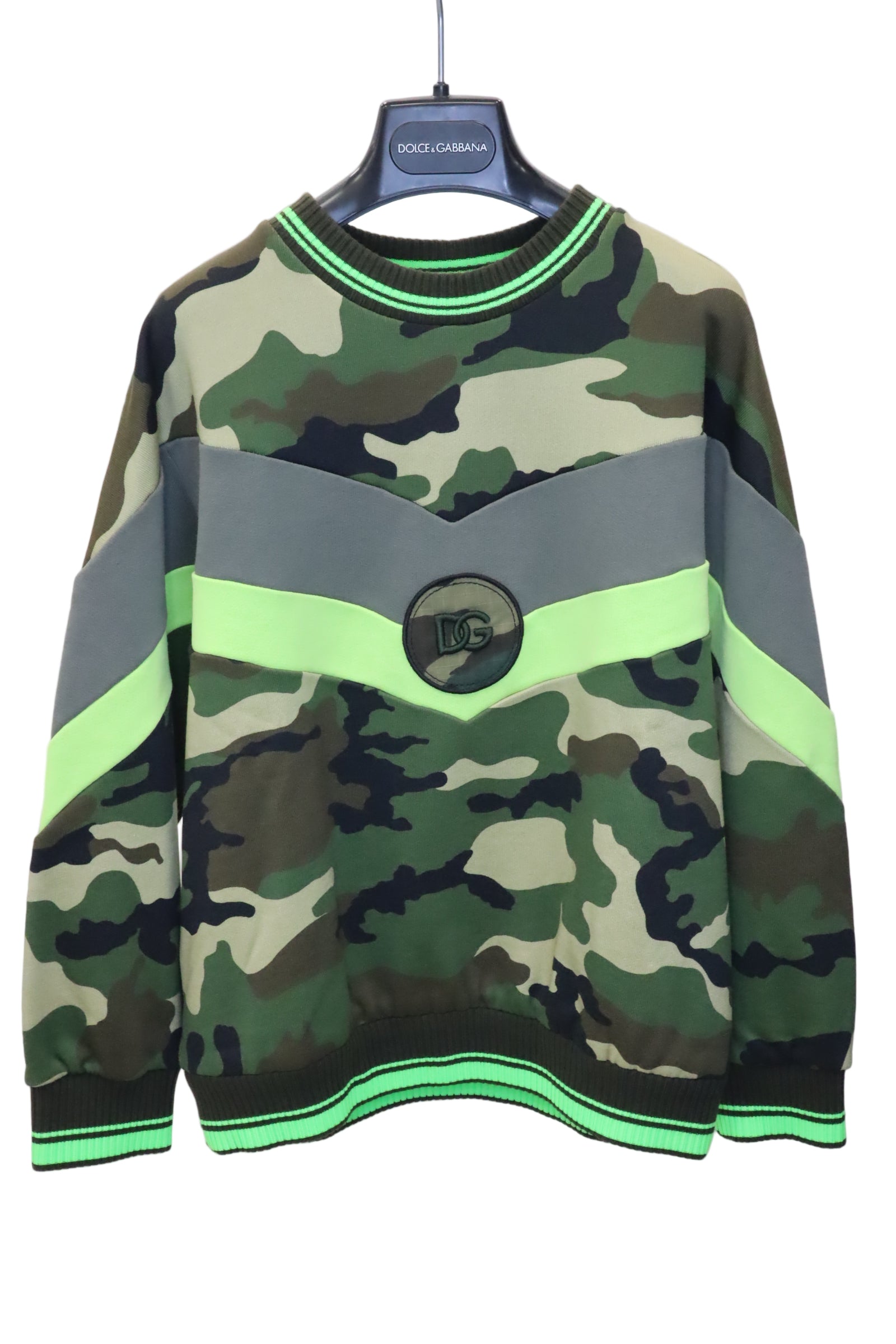 Dieses auffällige Dolce & Gabbana Kinder Sweatshirt kombiniert ein modernes Camouflage-Muster mit sportlichen Neon-Highlights. Die kräftigen Grüntöne des Camo-Prints werden durch graue und leuchtend neongelbe Streifen dynamisch unterbrochen und verleihen dem Sweatshirt einen trendigen, energiegeladenen Look.