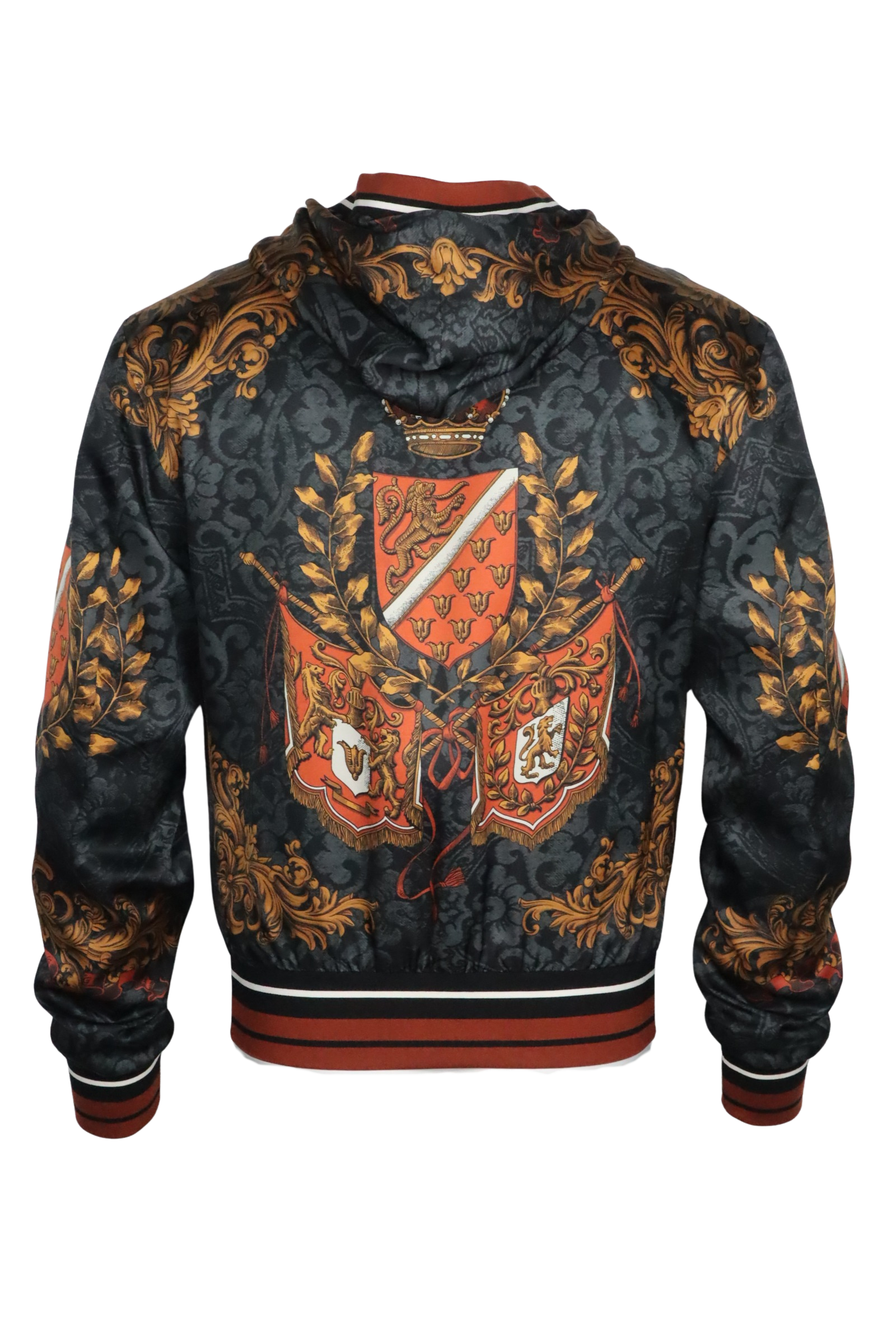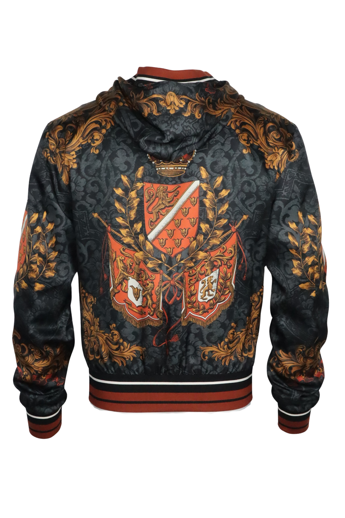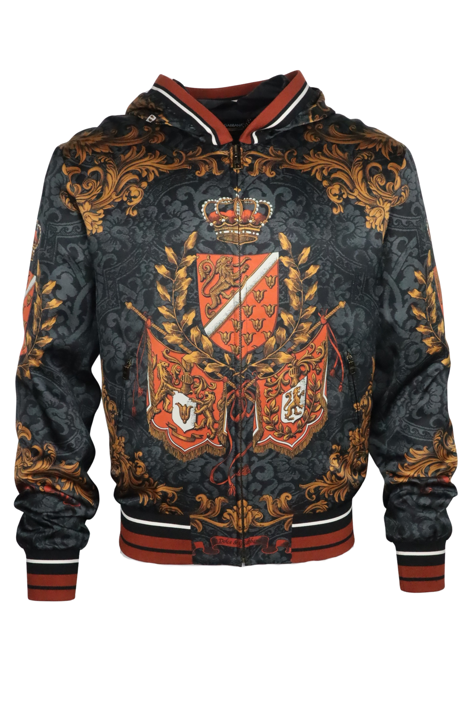 Ein echter Blickfang: Diese extravagante Jacke von Dolce & Gabbana überzeugt mit einem aufwendig gestalteten Barock-Print in satten Gold- und Rottönen auf schwarzem Grund. Das auffällige Wappenmotiv mit Krone, Löwen und Lorbeerkranz zieht alle Blicke auf sich und verleiht dem Modell eine royale Ausstrahlung. Die Kapuze, der sportive Schnitt und die gestreiften Bündchen setzen moderne, urbane Akzente – perfekt für alle, die Mode als Ausdruck von Persönlichkeit sehen.