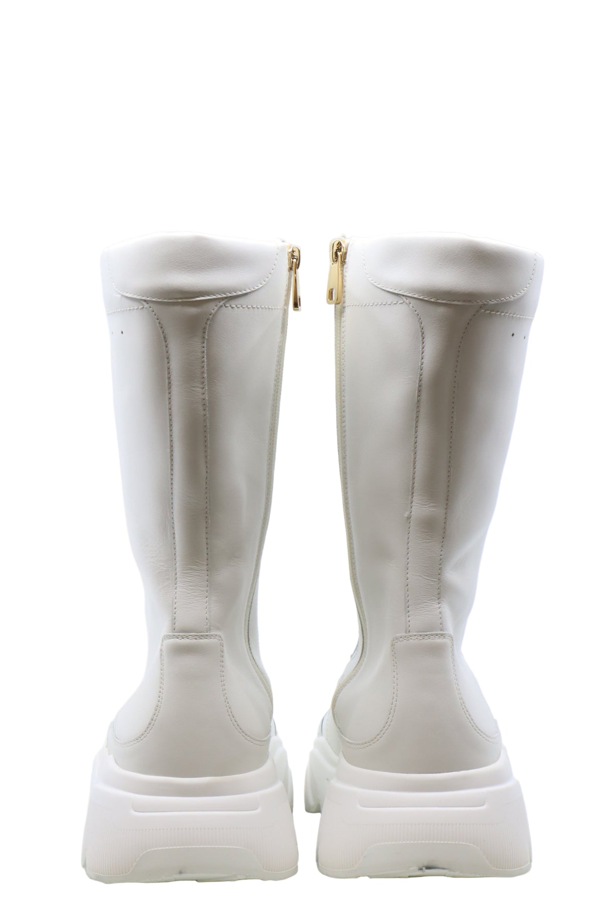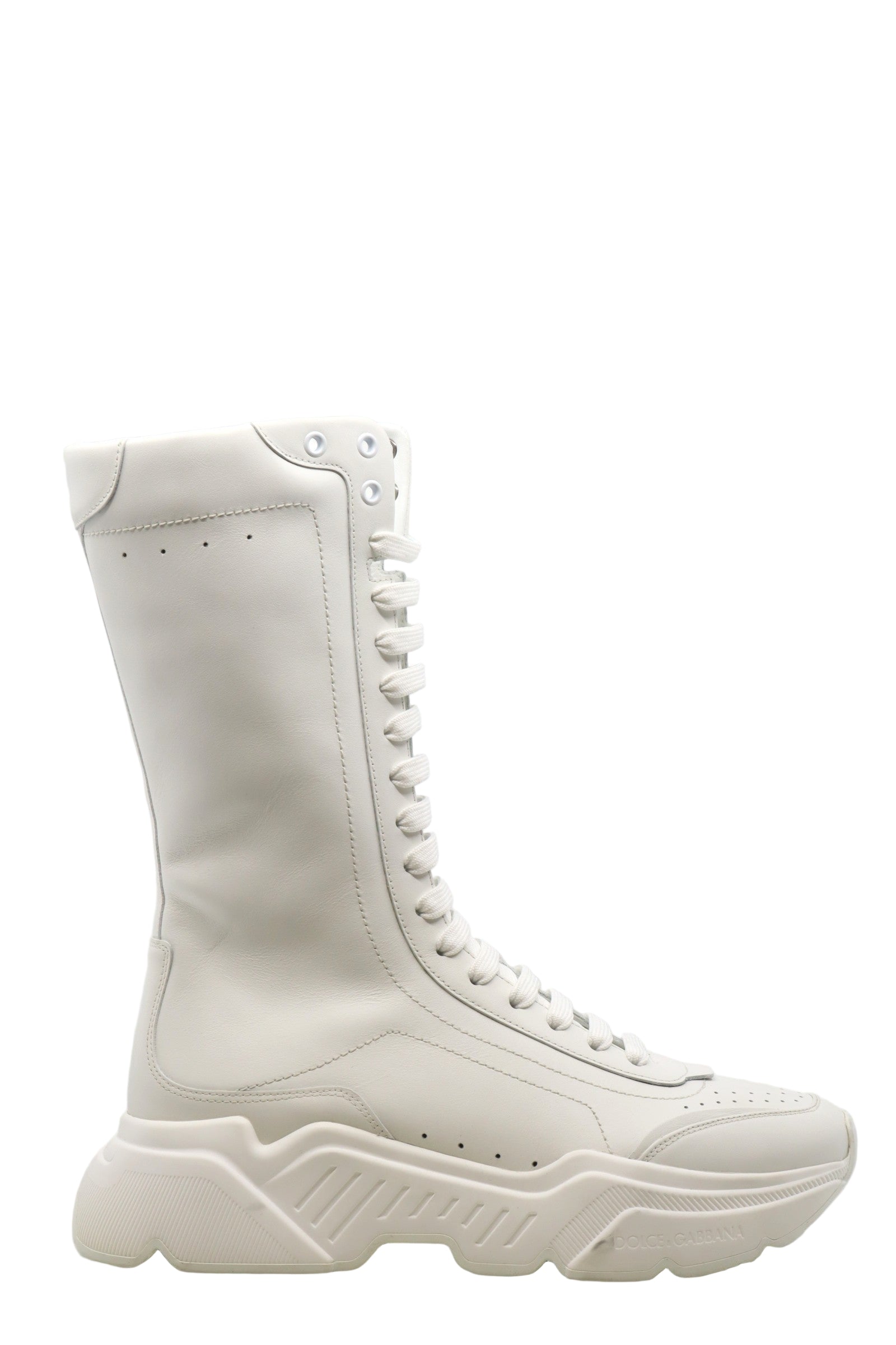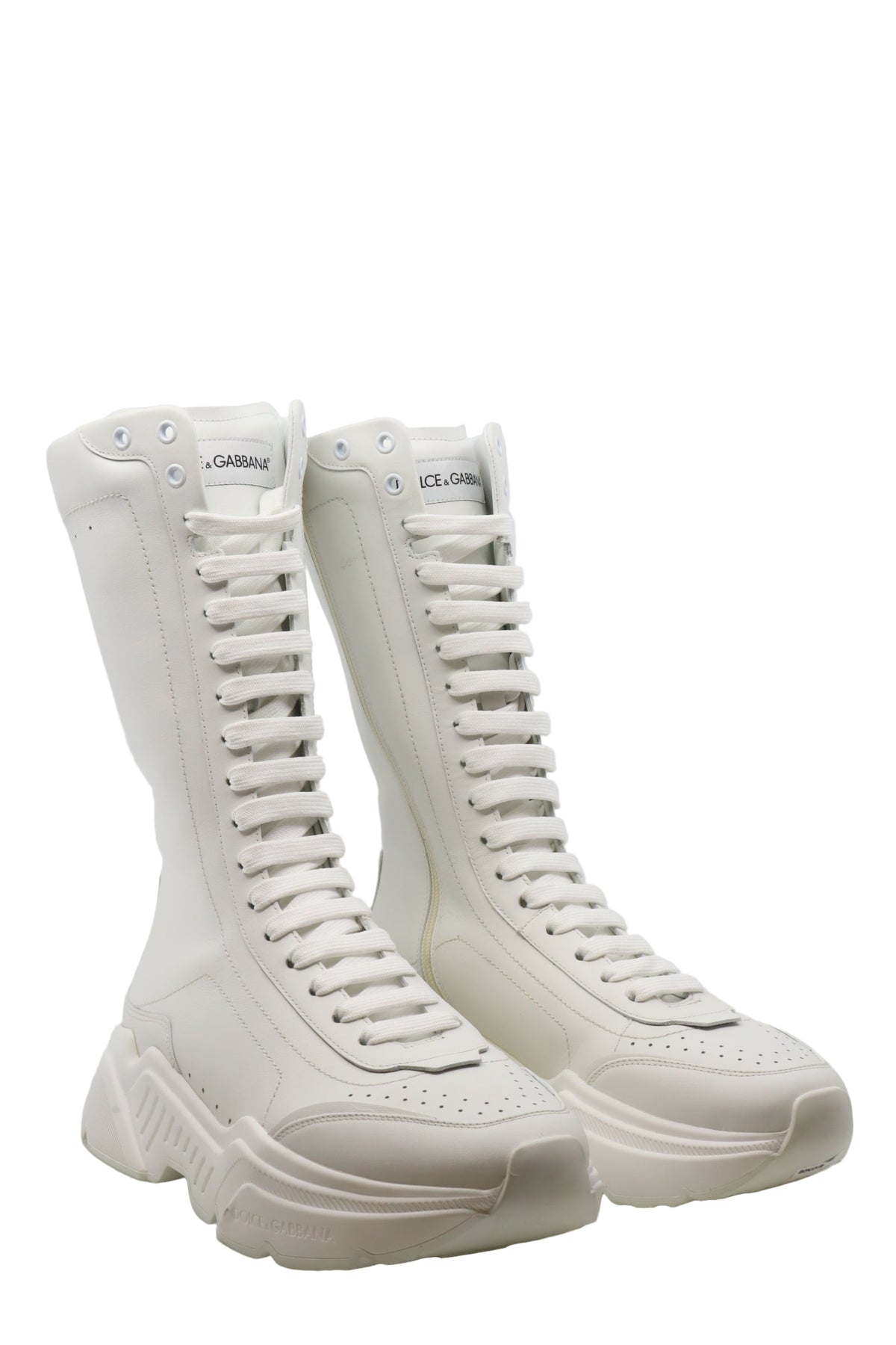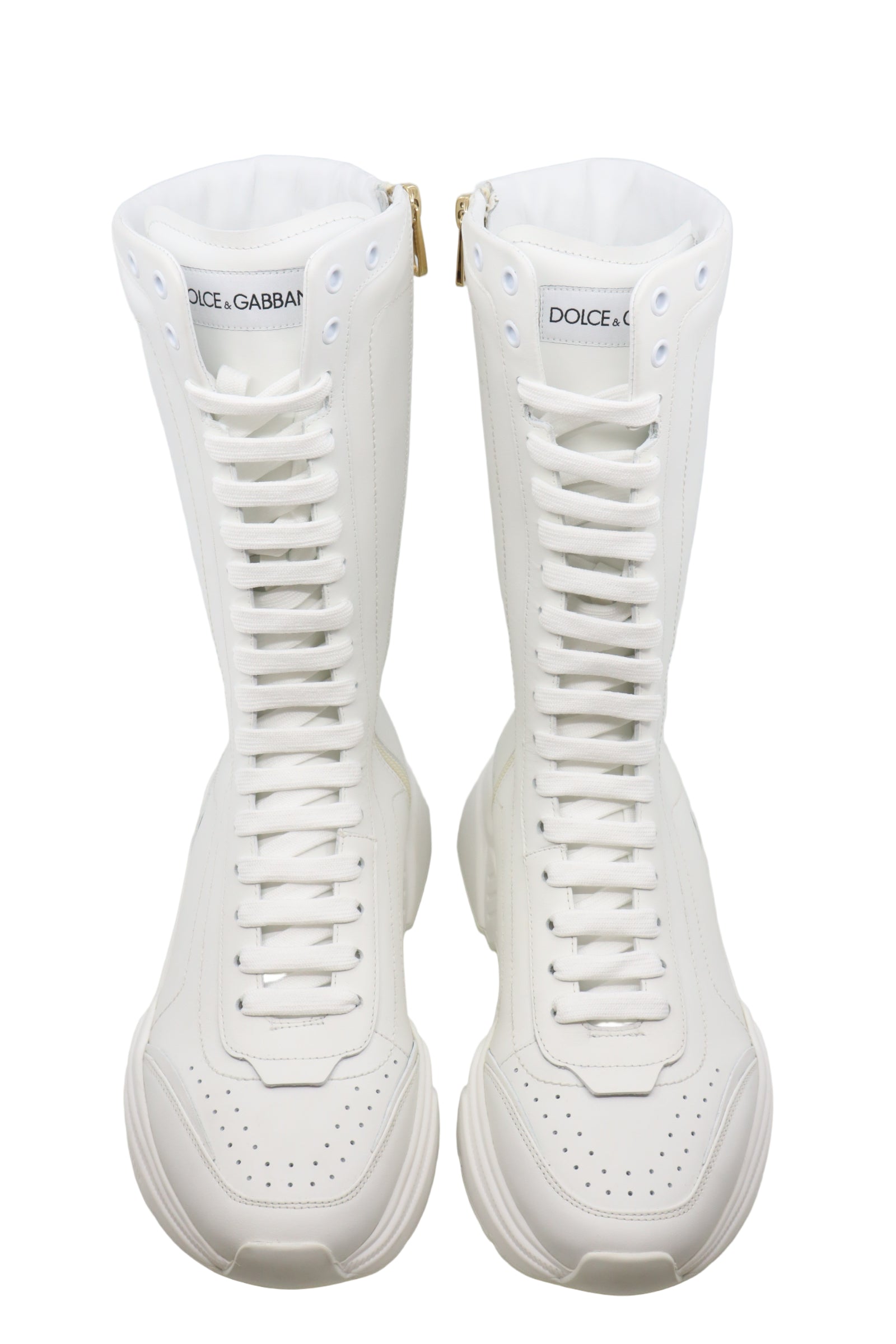 Diese extravaganten High-Top Boots von Dolce & Gabbana sind ein echtes Fashion-Statement. In cleanem Off-White gehalten, vereinen sie futuristisches Design mit urbaner Coolness. Das weiche Leder sorgt für hohen Tragekomfort, während die markante, strukturierte Chunky-Sohle jedem Schritt Ausdruck verleiht. Die durchgehende Schnürung bis zum Schaftabschluss unterstreicht den modernen, sportlich-eleganten Stil. Ideal für modebewusste Damen oder Herren, die mutig neue Wege gehen.