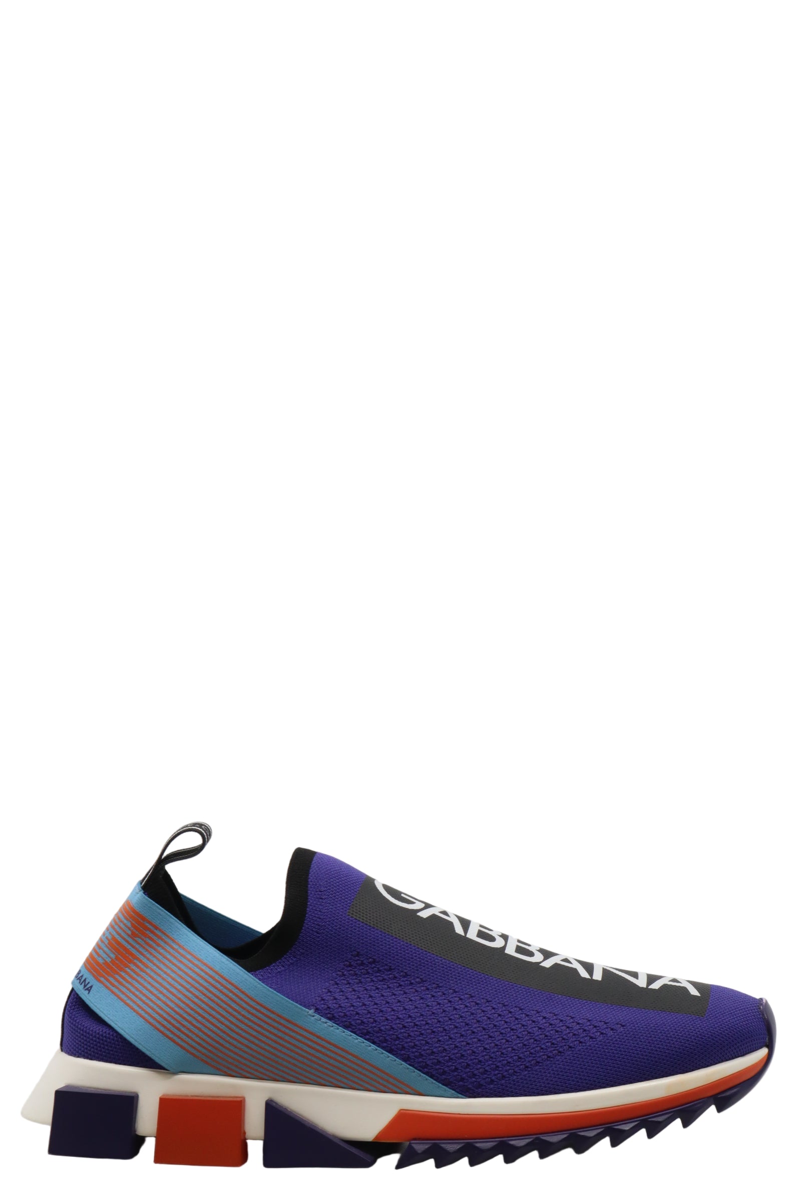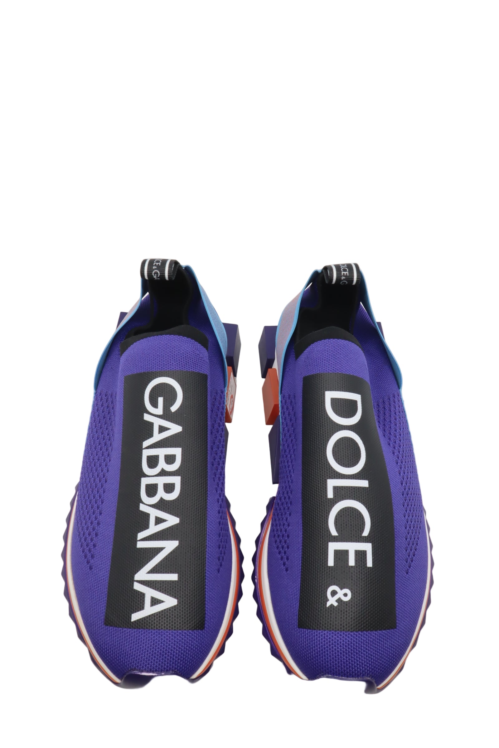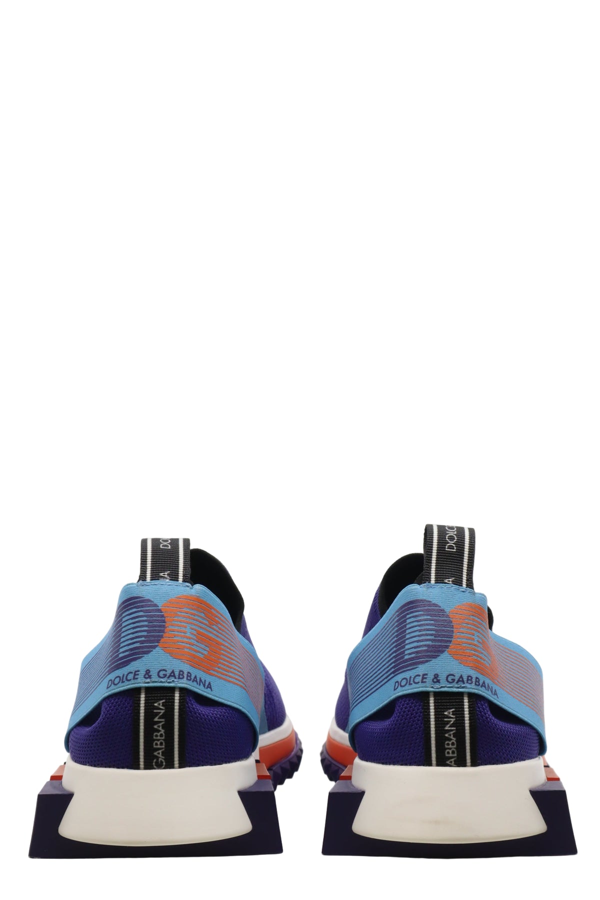 Diese sportlich-futuristischen Slip-On Sneaker von Dolce & Gabbana setzen ein klares Fashion-Statement. Das atmungsaktive Mesh-Obermaterial in kräftigem Violett wird durch kontrastierende Farbakzente in Orange, Blau, Weiß und Lila sowie den markanten Logoschriftzug auf dem Spann betont. Die geometrisch designte Sohle sorgt nicht nur für Aufsehen, sondern bietet auch optimalen Halt und Tragekomfort. Ideal für alle, die Sportlichkeit mit avantgardistischem Design verbinden möchten.
