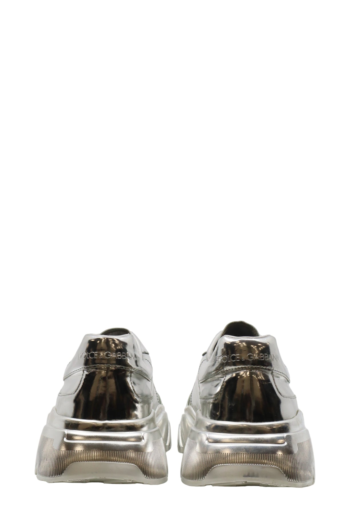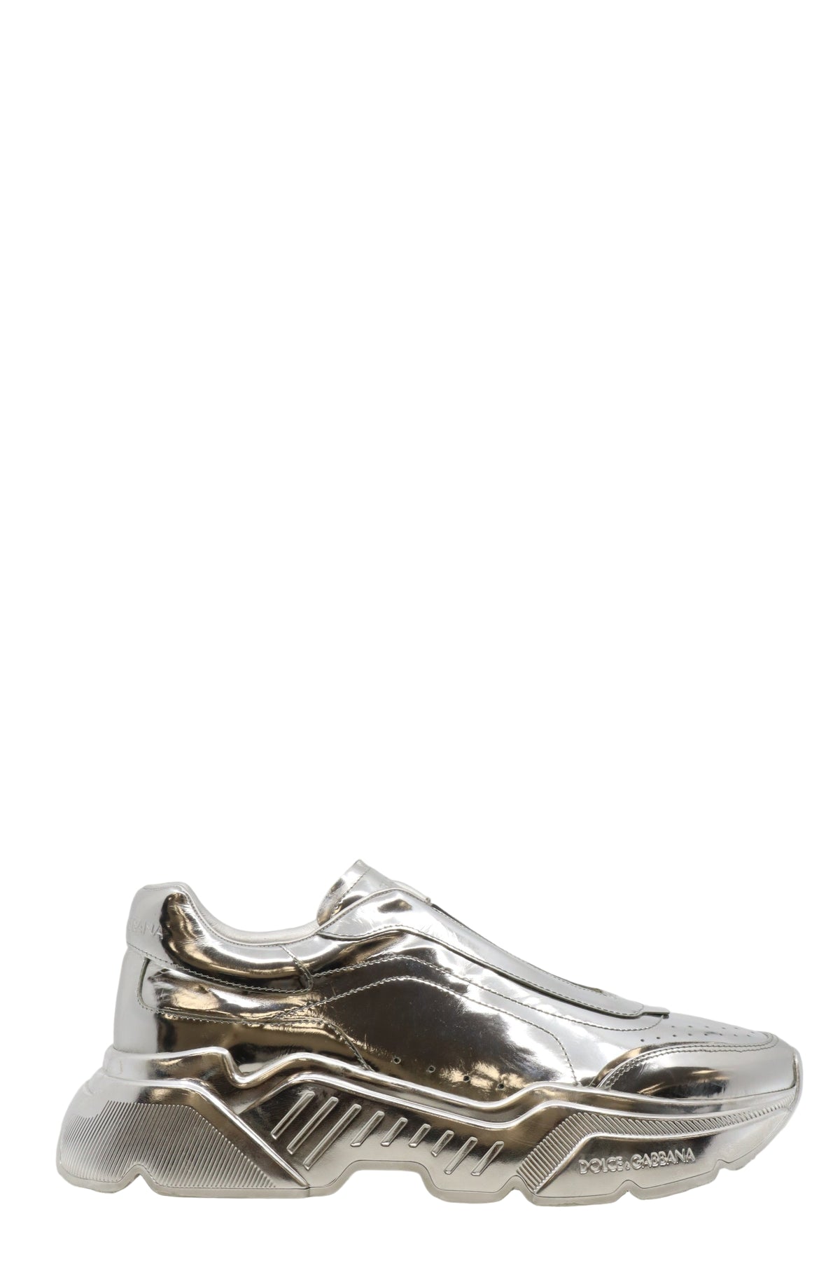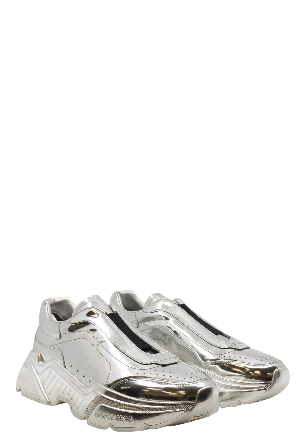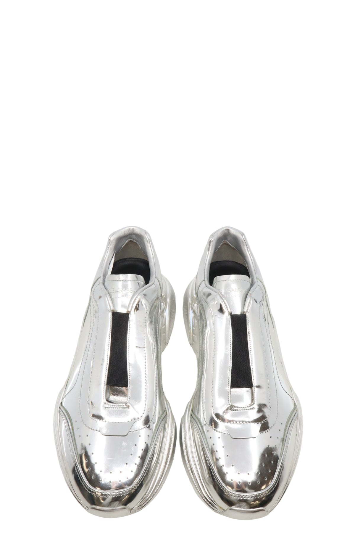 Diese futuristischen Sneaker von Dolce & Gabbana sind ein echtes Highlight für Modeenthusiasten. Das komplett silbermetallisch glänzende Obermaterial verleiht dem Schuh einen avantgardistischen Look, der modernste Streetwear mit luxuriösem High-Fashion-Flair vereint. Die voluminöse Sohle sorgt für Stabilität und Komfort, während das minimalistische Design ohne sichtbare Schnürung einen cleanen, progressiven Touch bietet. Ein echtes Statement für Männer mit Stil, die das Besondere suchen.