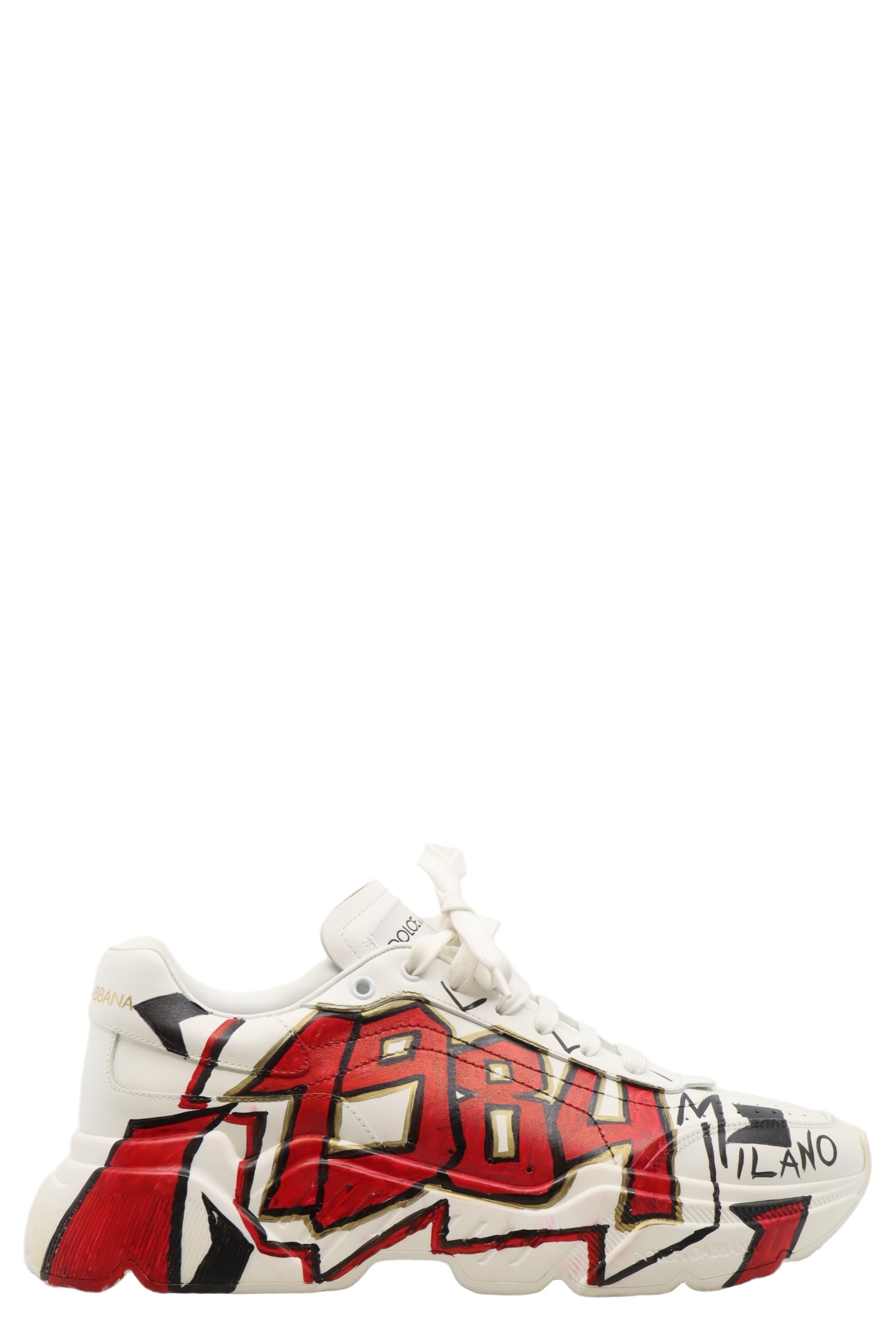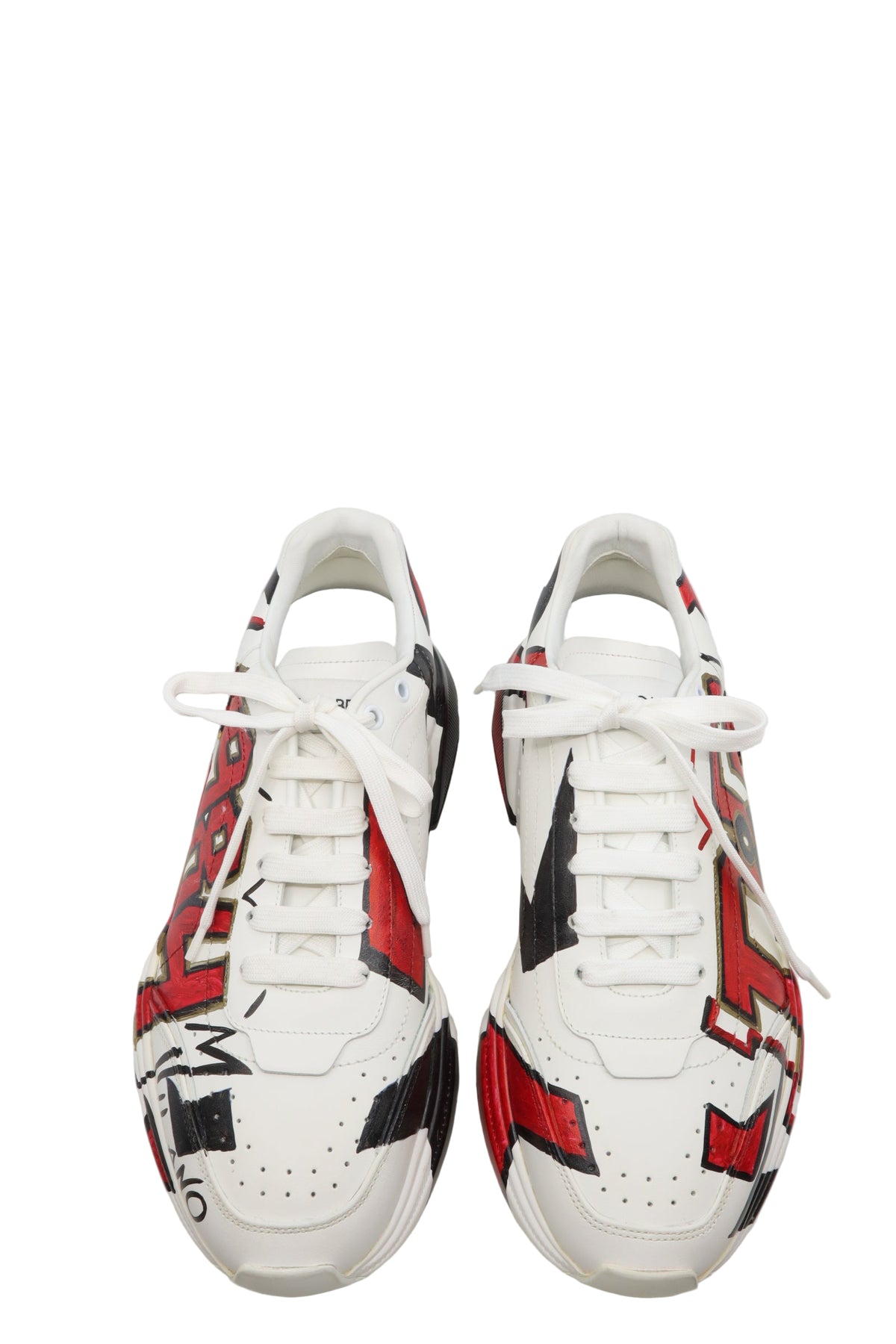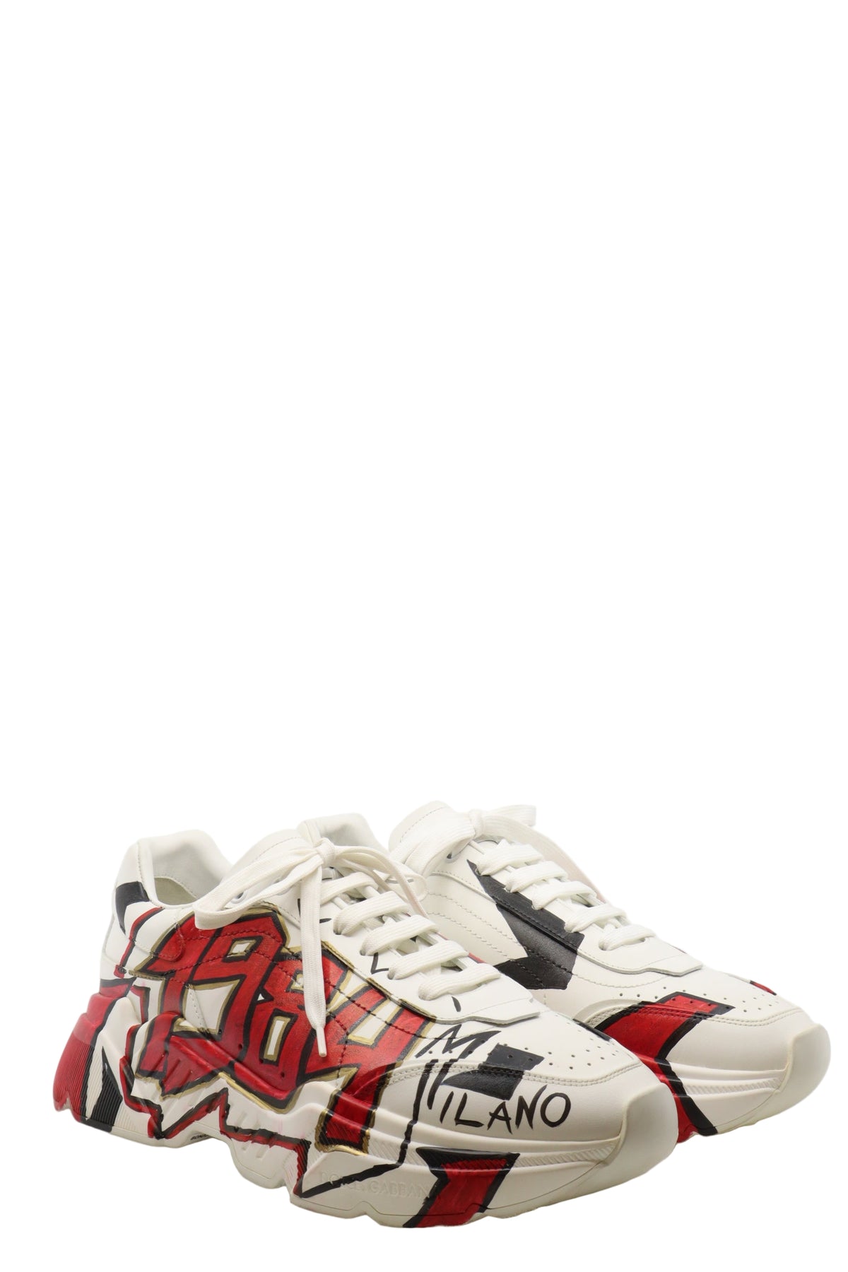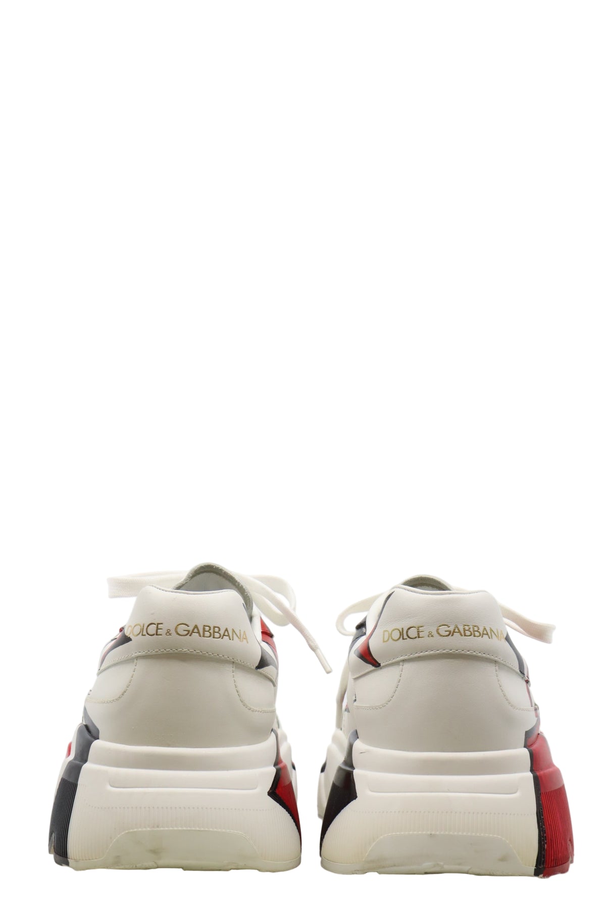 Diese exklusiven Sneaker von Dolce & Gabbana vereinen urbanen Streetstyle mit italienischer Handwerkskunst. Das auffällige Design mit grafischen Elementen in Rot, Schwarz und Gold auf weißem Leder zieht sofort alle Blicke auf sich. Die wuchtige Sohle sorgt nicht nur für einen modernen Look, sondern bietet auch hervorragenden Tragekomfort. Perfekt für modebewusste Männer, die ein Statement setzen wollen – diese Schuhe verkörpern Individualität, Stil und Mut zur Extravaganz.