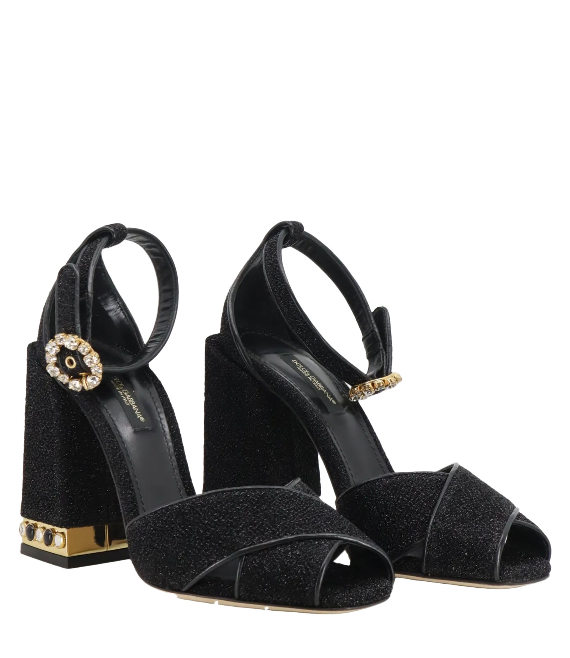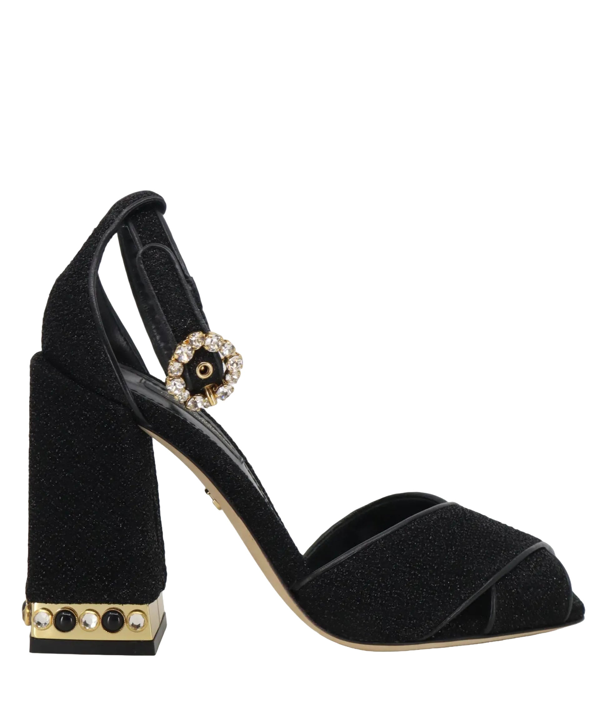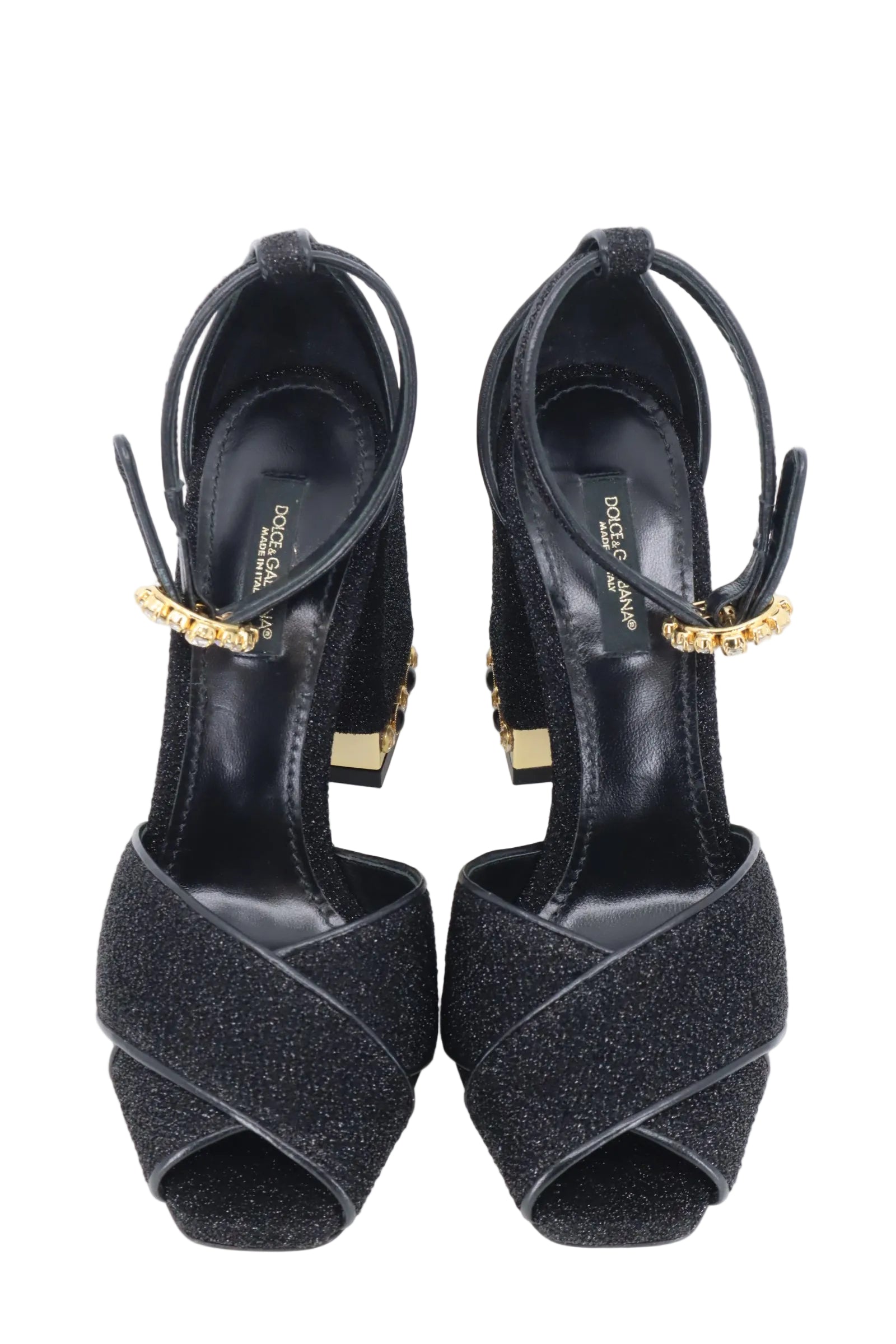 Diese edlen High Heels von Dolce & Gabbana vereinen pure Eleganz mit luxuriösen Details. Das tiefschwarze Glitzerfinish sorgt für einen glamourösen Auftritt, während der breite Blockabsatz mit goldfarbenen und schwarzen Schmucksteinen stilvolle Akzente setzt. Die funkelnde, mit Strass besetzte Schnalle verleiht dem Riemchenverschluss einen Hauch von Vintage-Chic. Die weiche Innenausstattung sorgt dabei für hohen Tragekomfort – ideal für festliche Anlässe oder stilvolle Abendgarderobe.