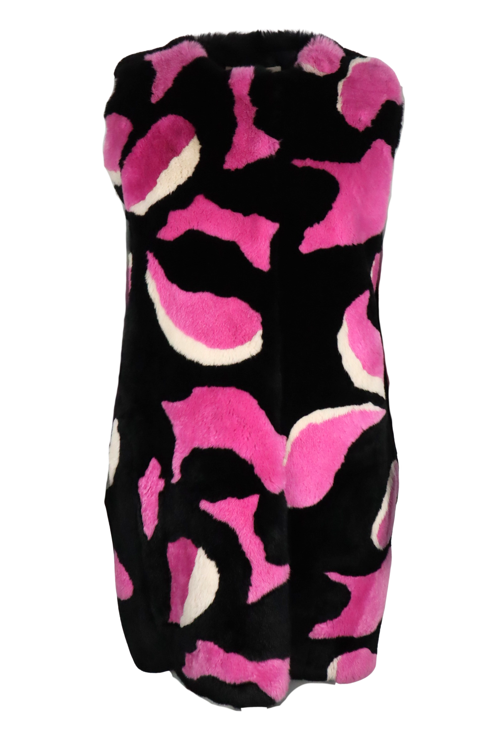 Diese luxuriöse Fellweste von Marni ist ein echtes Kunstwerk für Fashion-Liebhaberinnen, die das Besondere suchen. Mit ihrem auffälligen Farbspiel aus Pink, Schwarz und Creme in abstraktem Muster zieht sie sofort alle Blicke auf sich und bringt frischen Wind in jede Herbst- und Wintergarderobe.