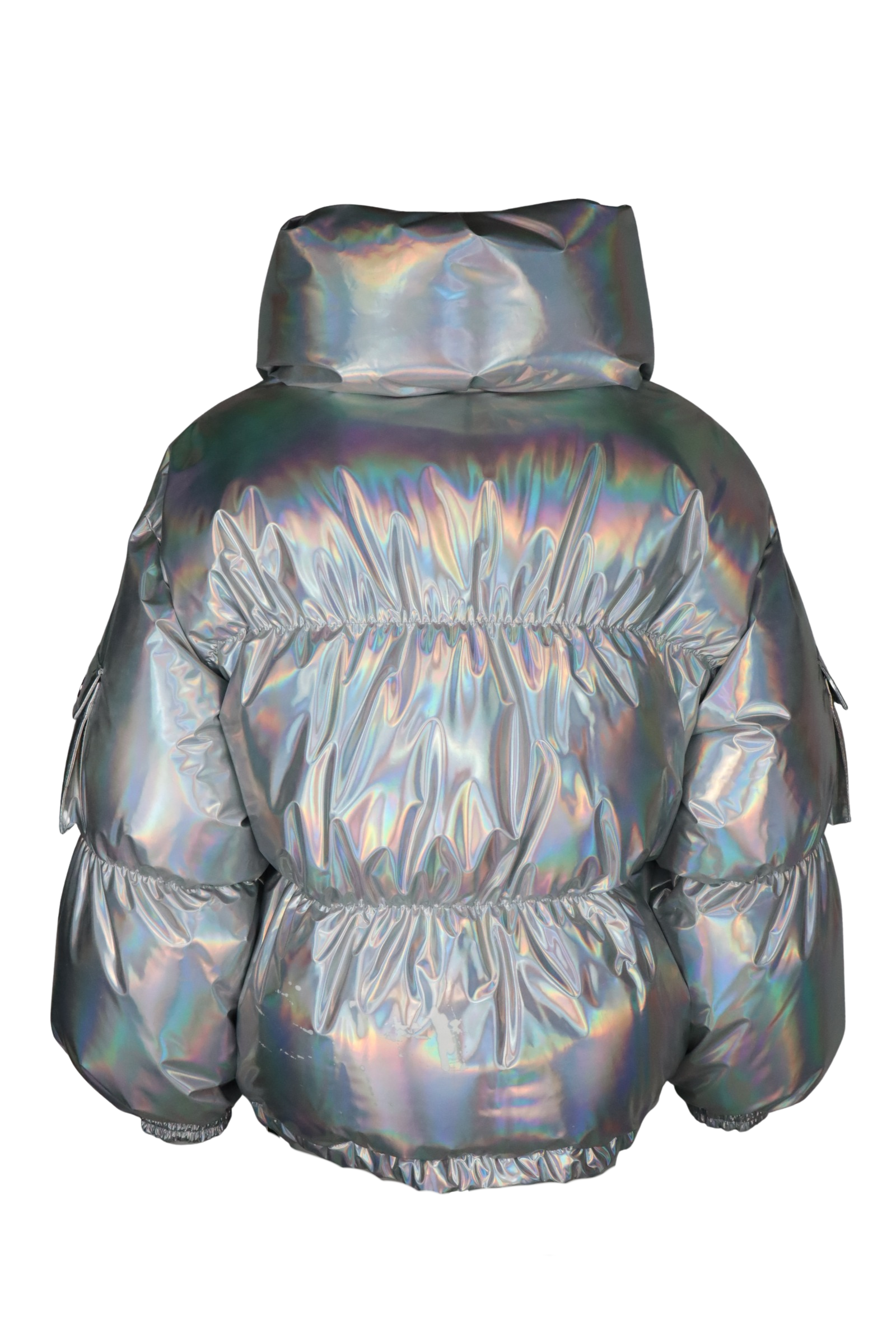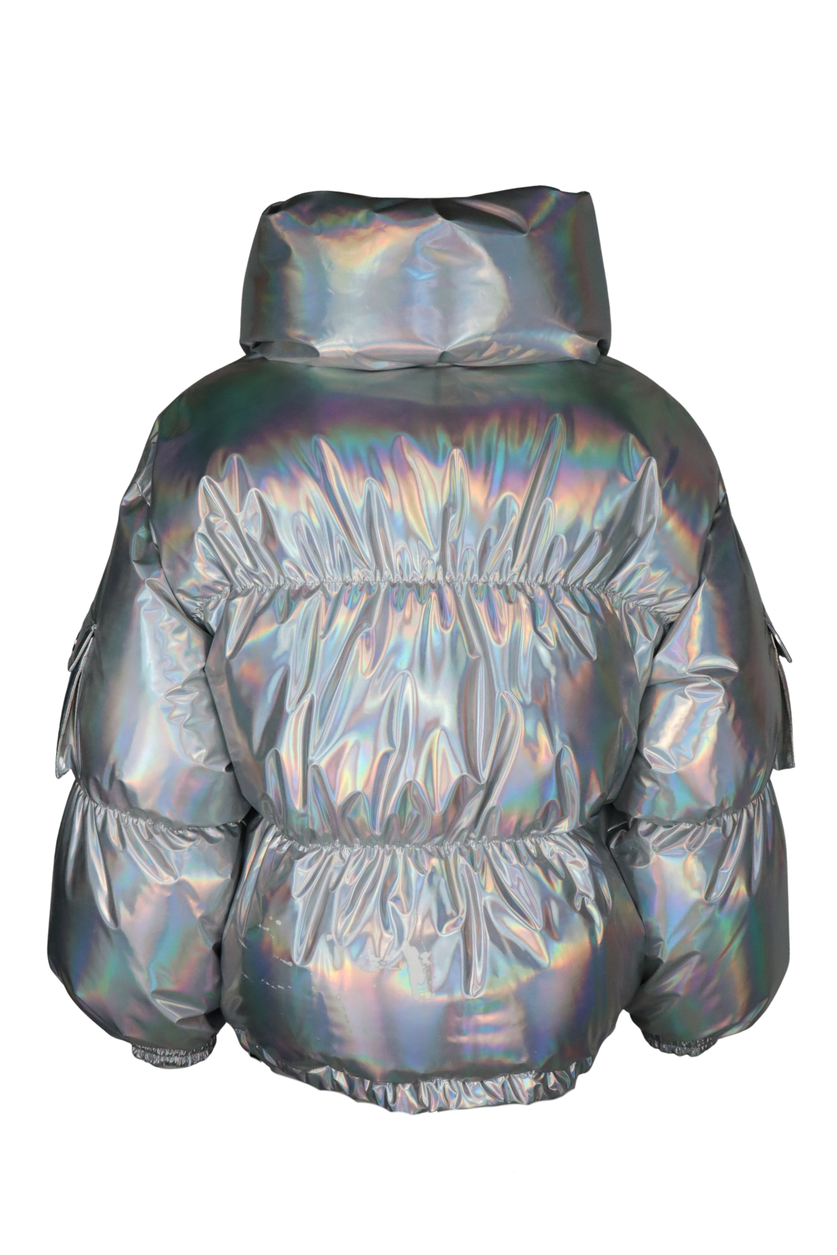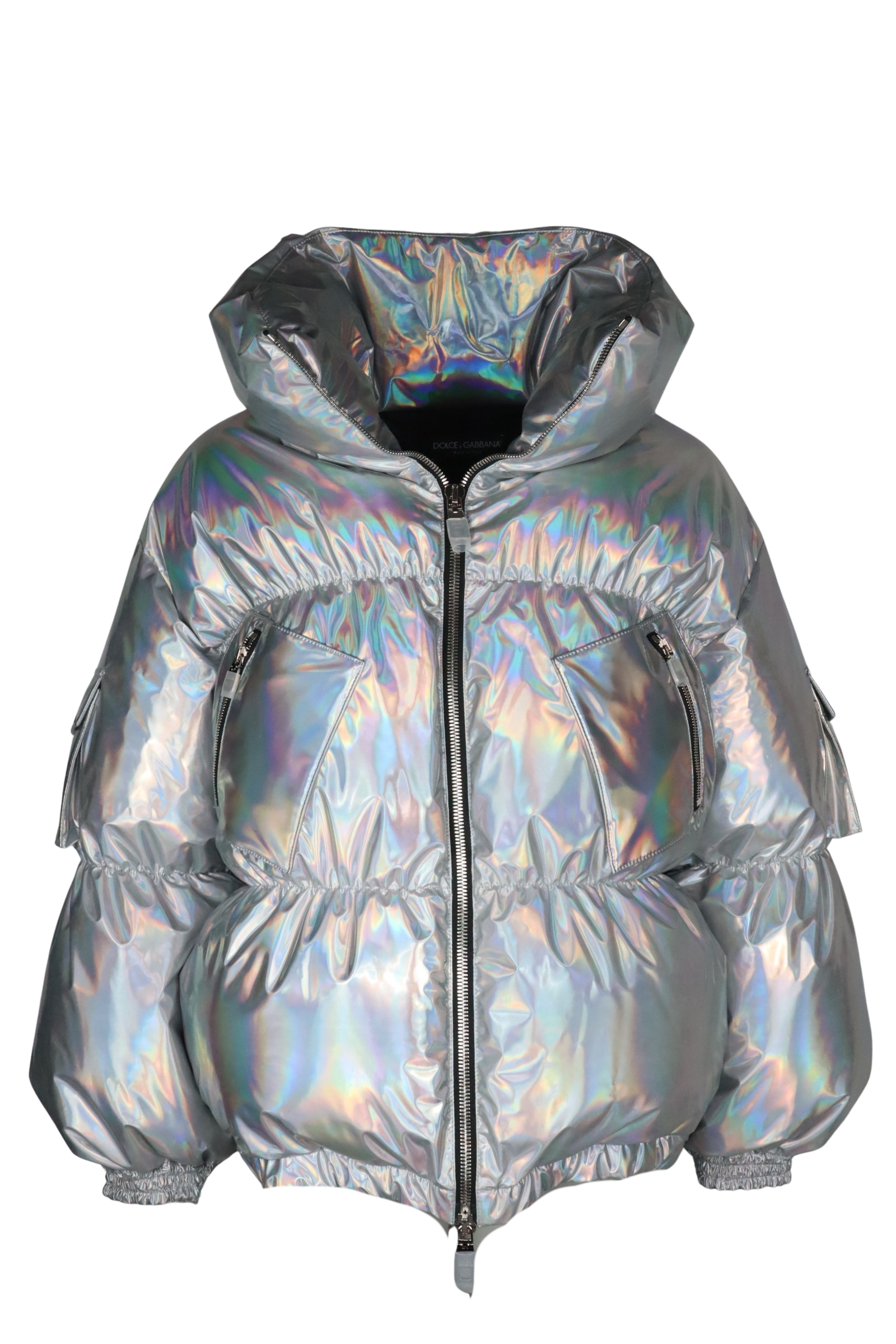 Diese futuristische Jacke von Dolce & Gabbana setzt ein klares Statement: glänzendes Hologramm-Finish in Silber trifft auf voluminöse Steppung und ein modernes Oversize-Design. Große aufgesetzte Taschen, elastische Bündchen und eine schützende Kapuze machen sie nicht nur stylisch, sondern auch funktional – perfekt für modebewusste Trendsetterinnen.