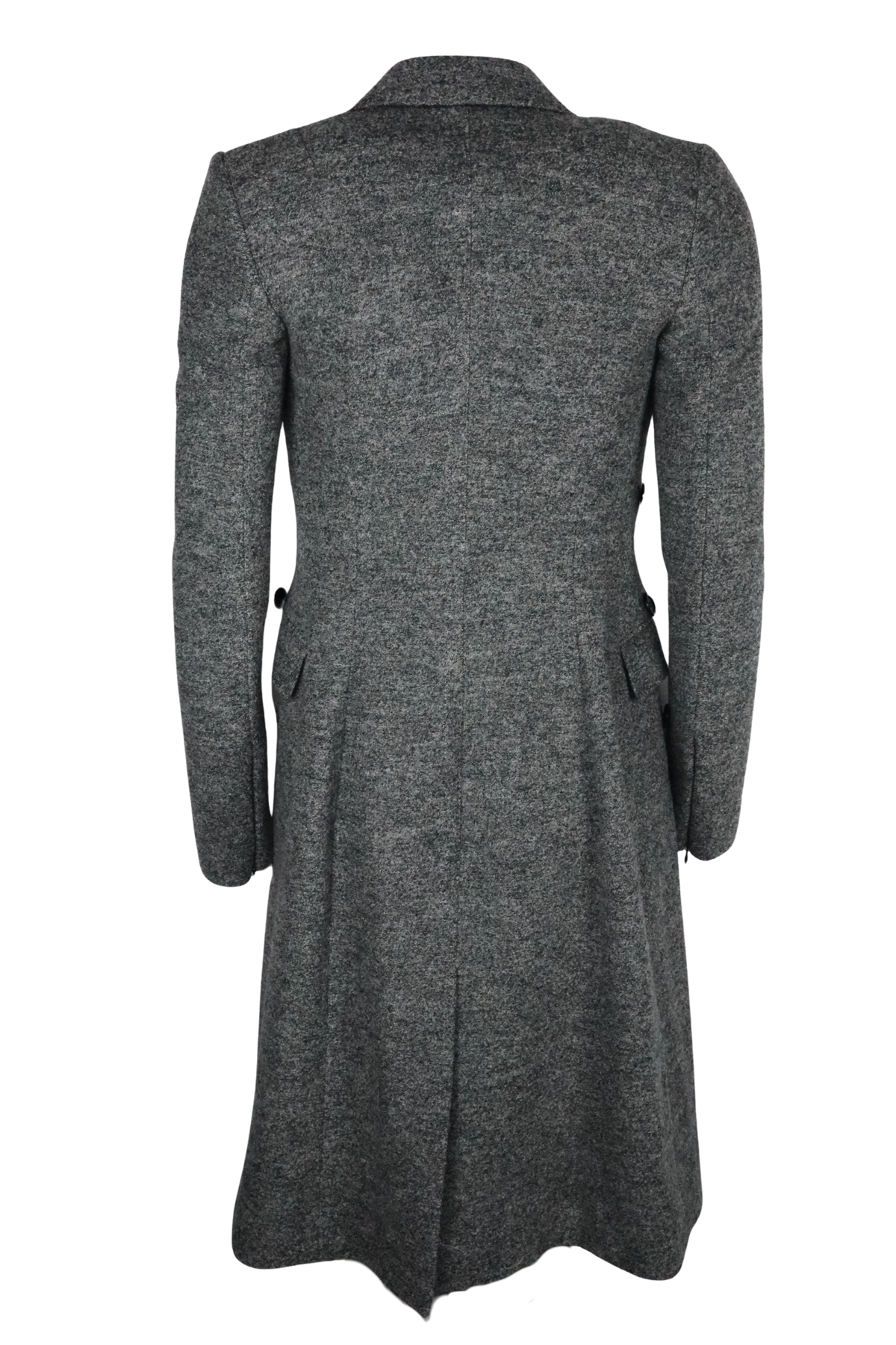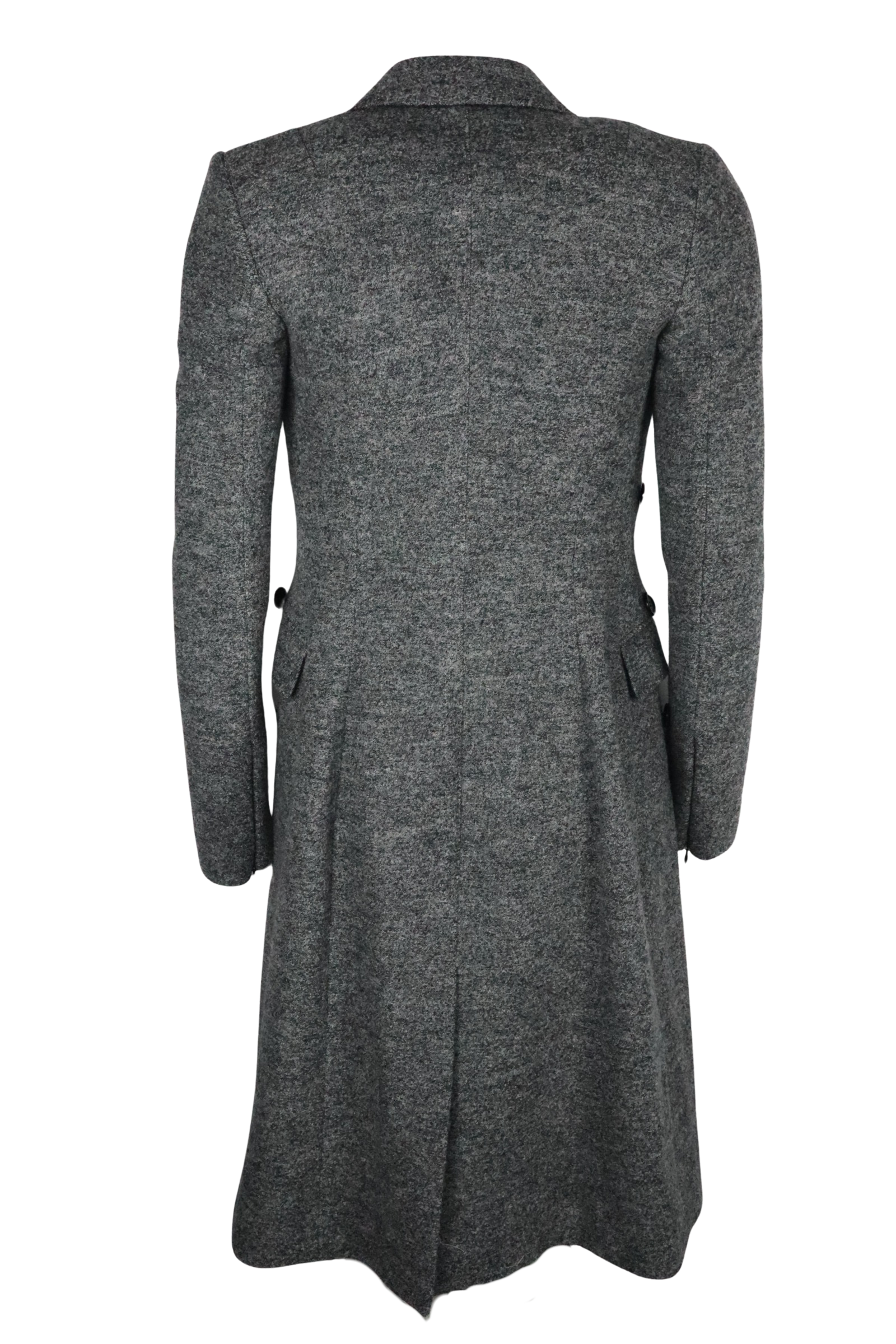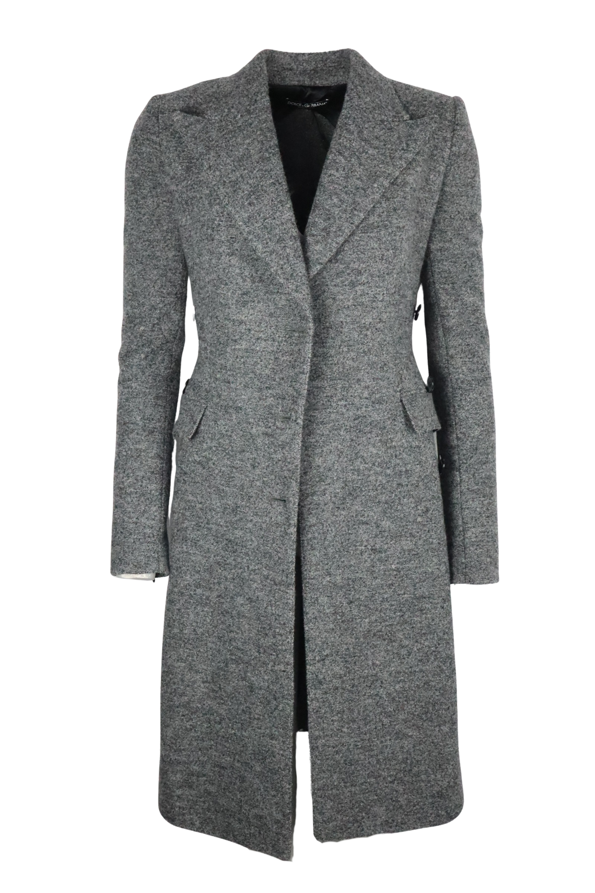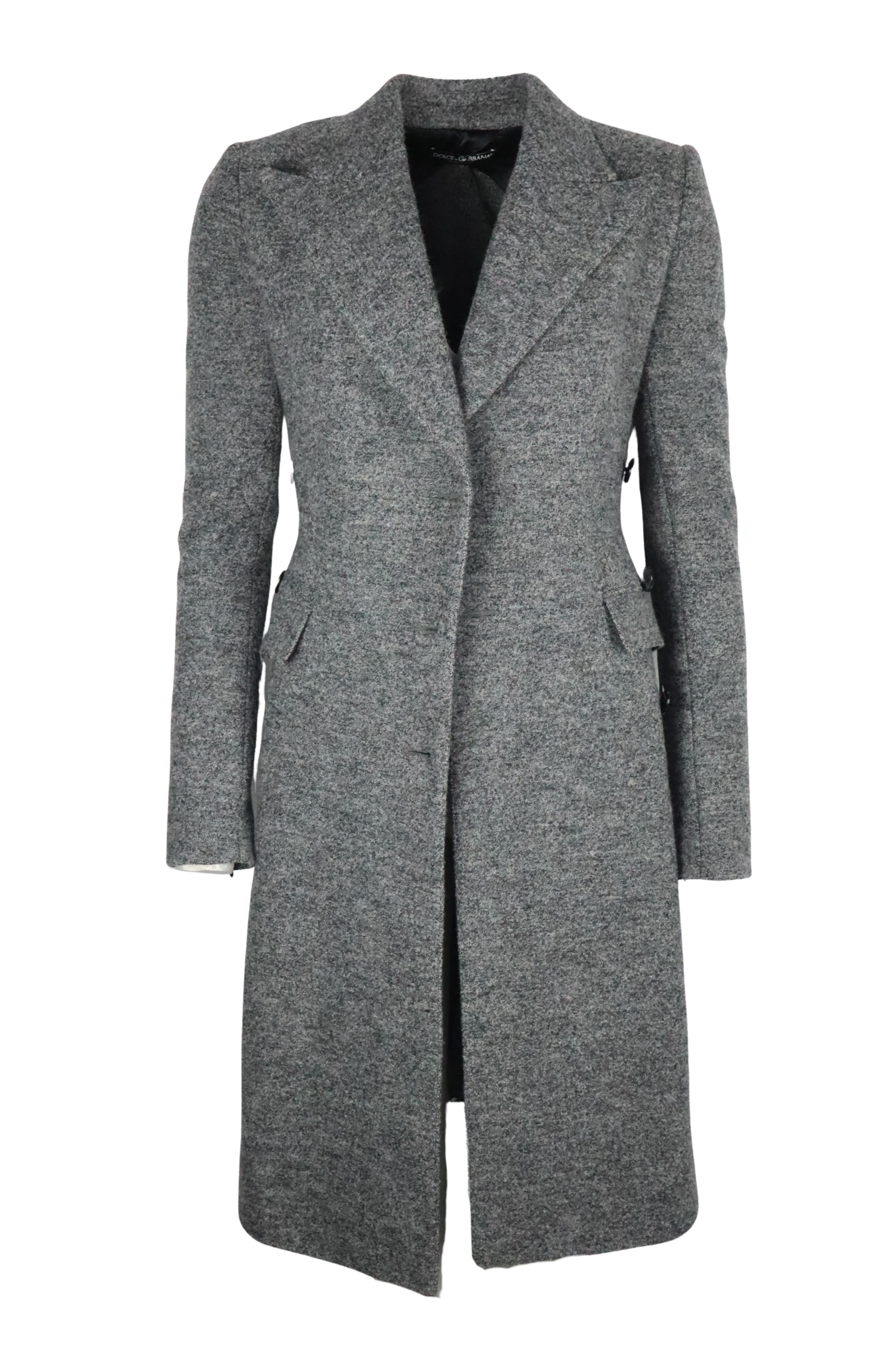 Dieser graue Mantel von Dolce & Gabbana verkörpert pure Eleganz mit einem modernen, klaren Schnitt. Die strukturierte Wolloberfläche sorgt für eine edle Haptik, während das taillierte Design und die betonten Schultern eine feminine Silhouette formen. Seitliche Knopfdetails verleihen dem Look eine subtile Raffinesse – perfekt für stilvolle Business- oder City-Outfits.