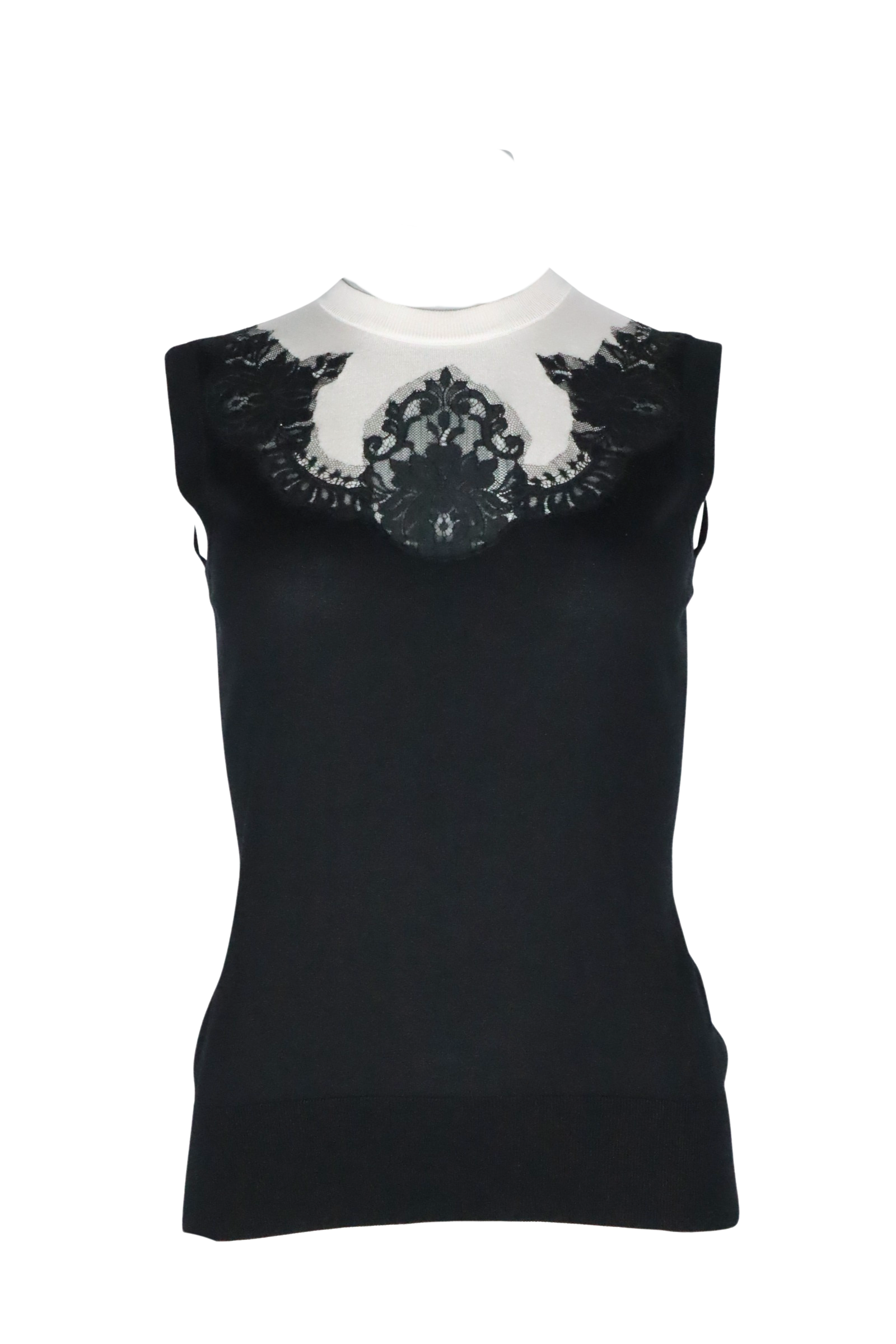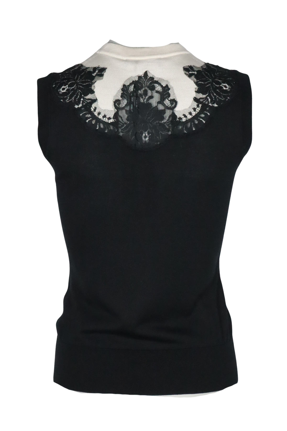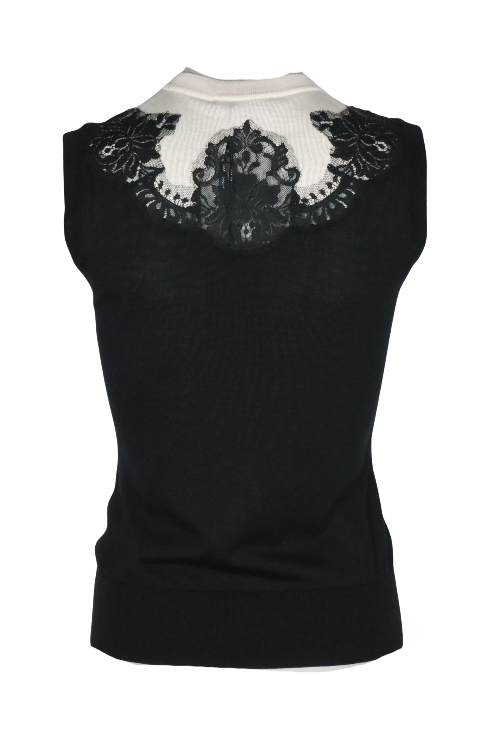 Eleganz in Perfektion: Dieses ärmellose Top von Dolce & Gabbana besticht durch seine stilvolle Farbkombination aus Schwarz und Cremeweiß. Der fein gestrickte Stoff wird durch einen zarten Spitzenbesatz im Brustbereich edel akzentuiert. Der hohe Rundhalsausschnitt sorgt für eine feminine Silhouette – ideal für stilvolle Tages- oder Abendlooks.