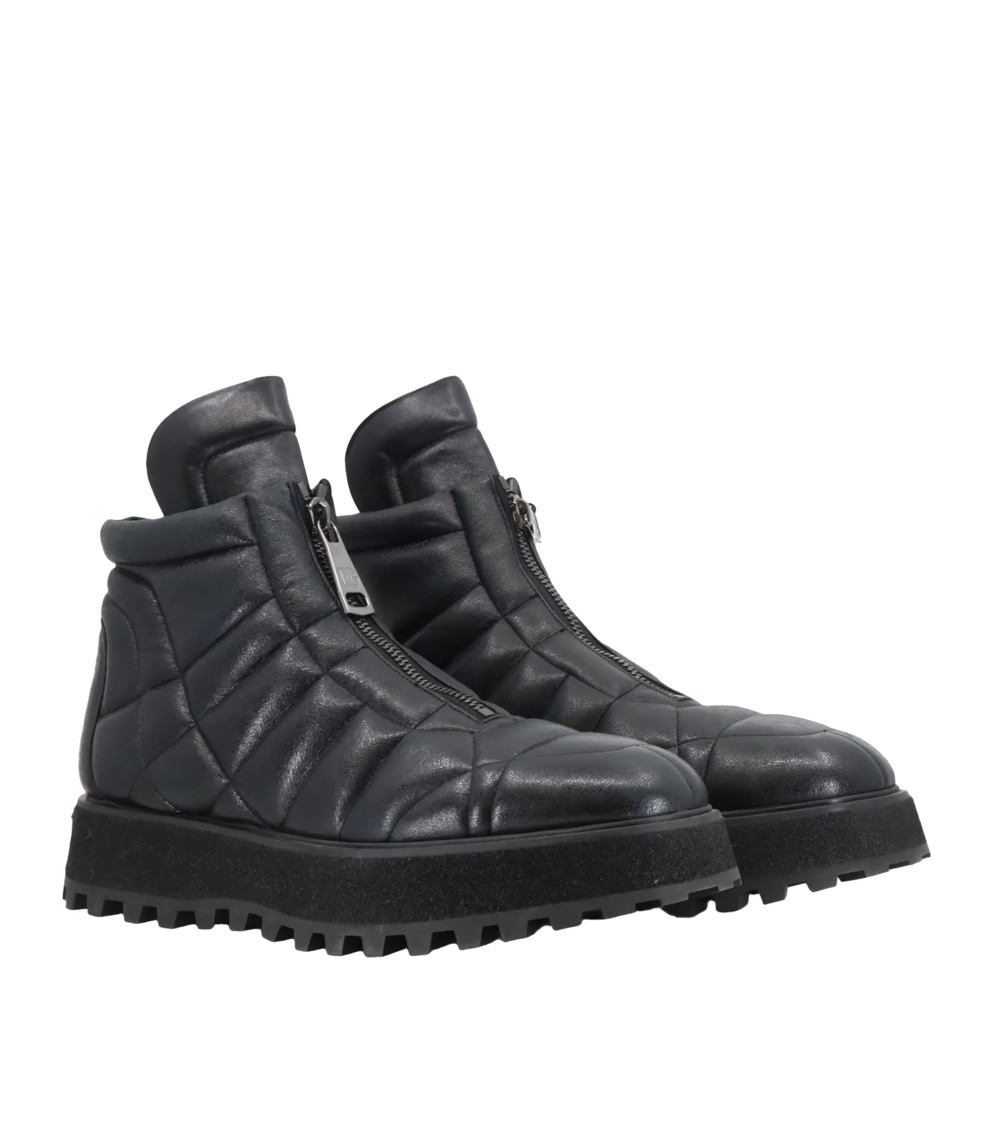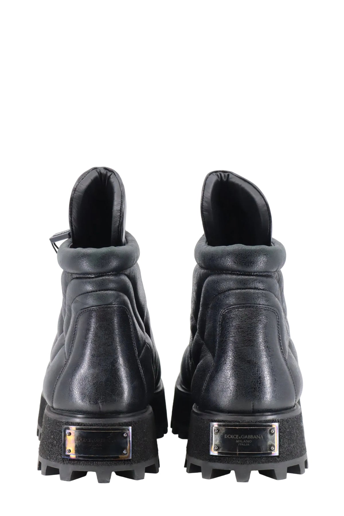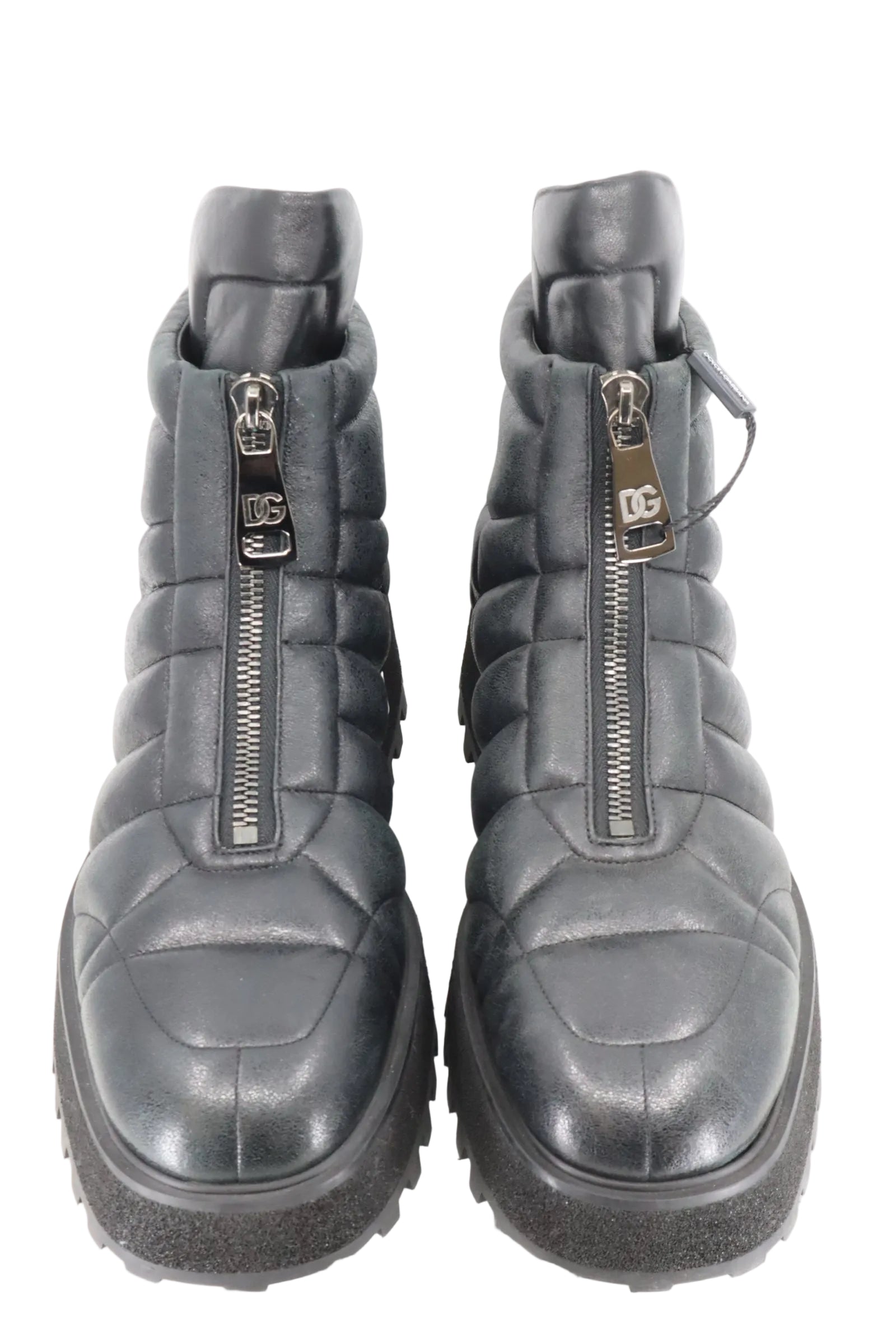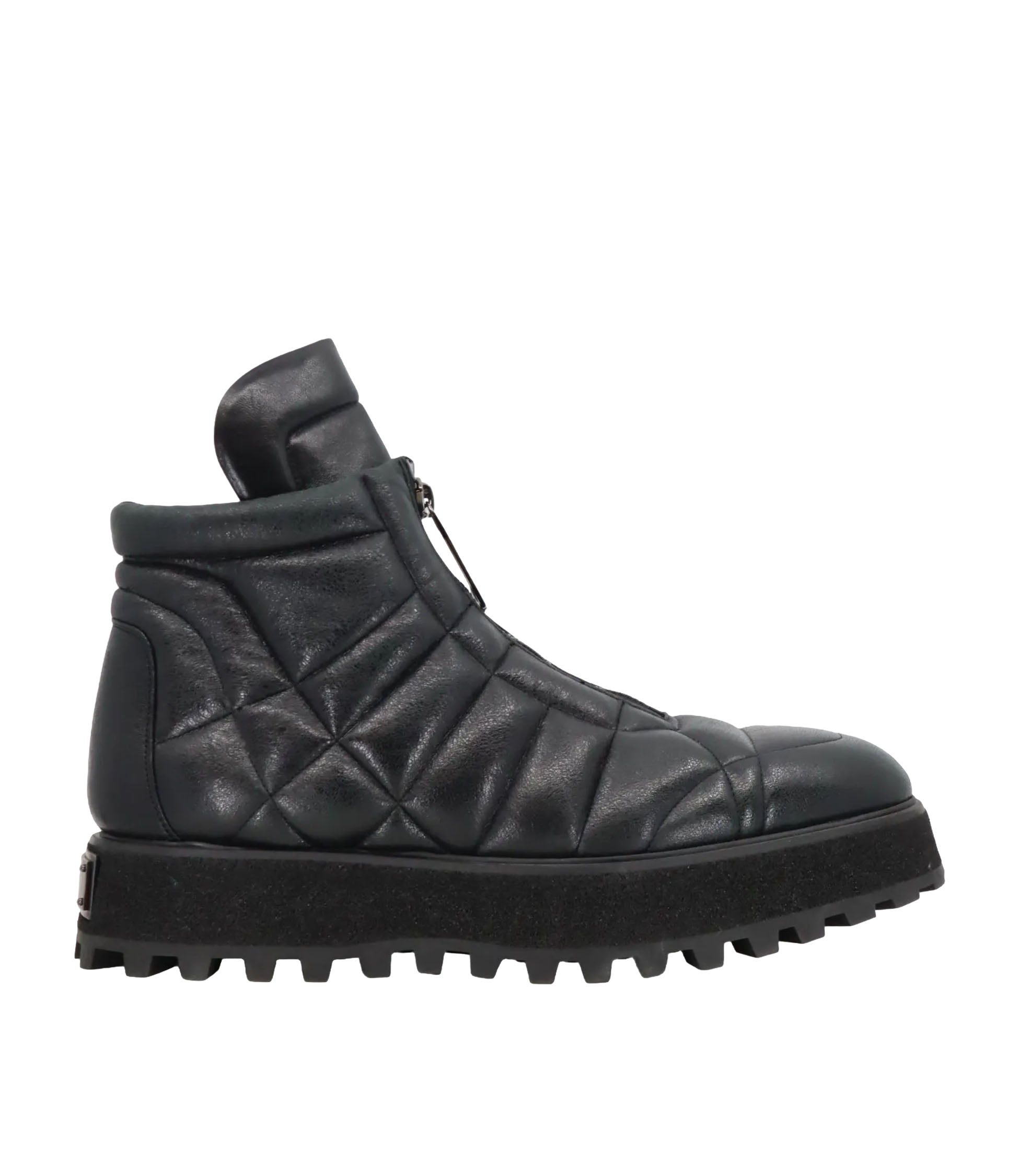 Diese markanten Boots von Dolce & Gabbana vereinen futuristisches Design mit maximalem Tragekomfort. Das gesteppte Obermaterial aus schwarzem Leder verleiht dem Schuh eine sportlich-gepolsterte Optik, während die robuste Plateausohle mit starkem Profil für sicheren Halt sorgt – selbst bei widrigen Bedingungen. Der seitliche Reißverschluss ermöglicht ein bequemes An- und Ausziehen. Diese Boots sind ideal für alle, die ein stilvolles Statement setzen und dabei nicht auf Komfort verzichten möchten.
