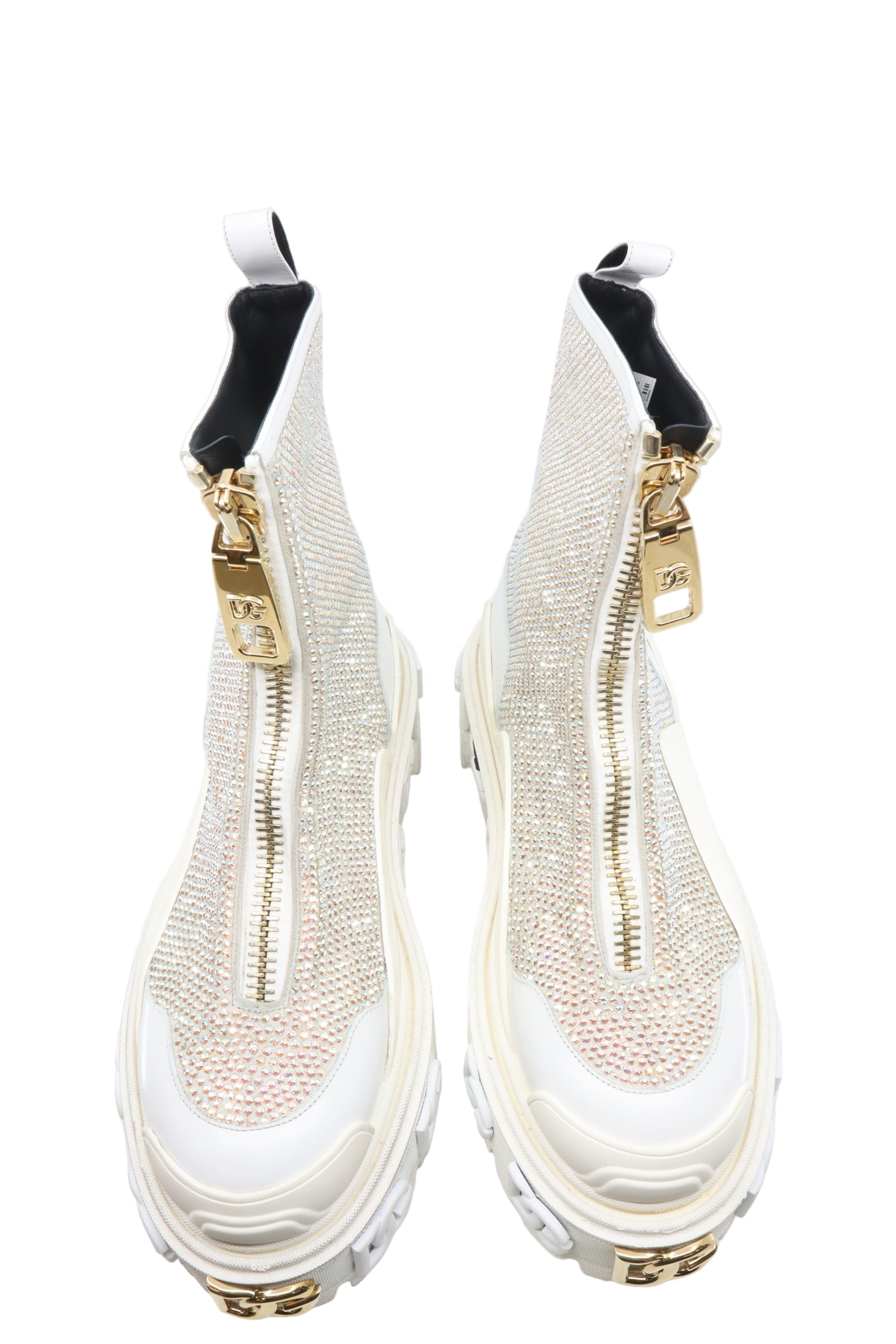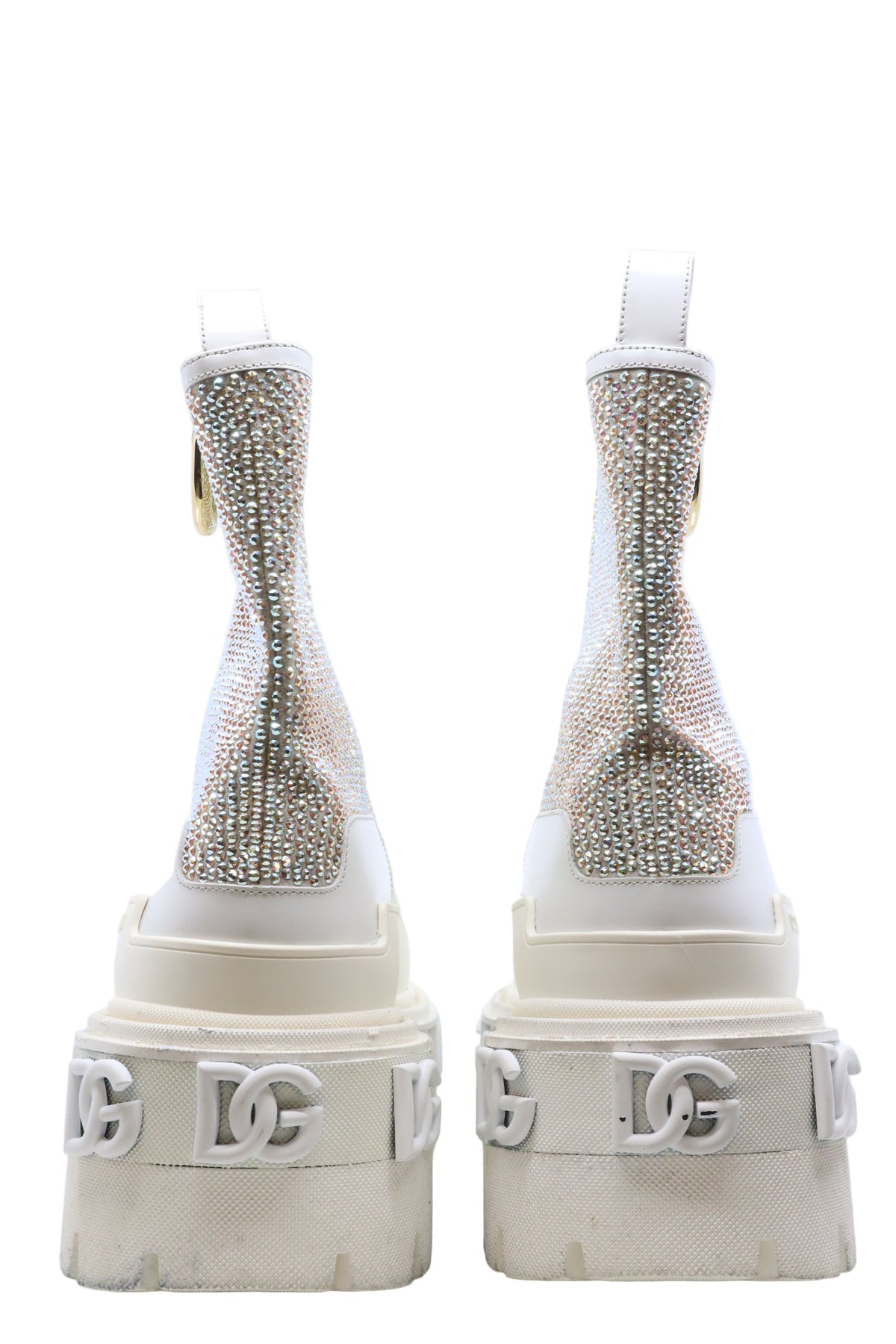 Ein absoluter Hingucker mit Glamour-Faktor: Diese exklusiven Boots von Dolce & Gabbana vereinen urbanen Chunky-Style mit luxuriösem Funkeln. Vollständig mit funkelnden Kristallen besetzt, strahlt der Schuh bei jedem Schritt und wird durch goldene Details wie Reißverschluss und D-Ring edel akzentuiert.